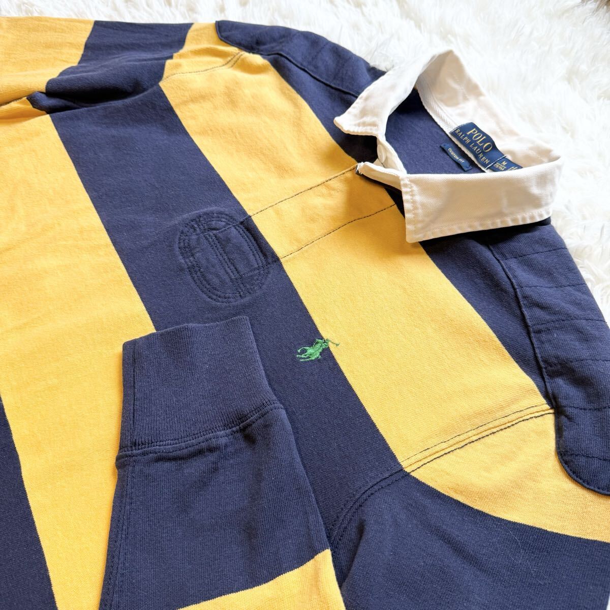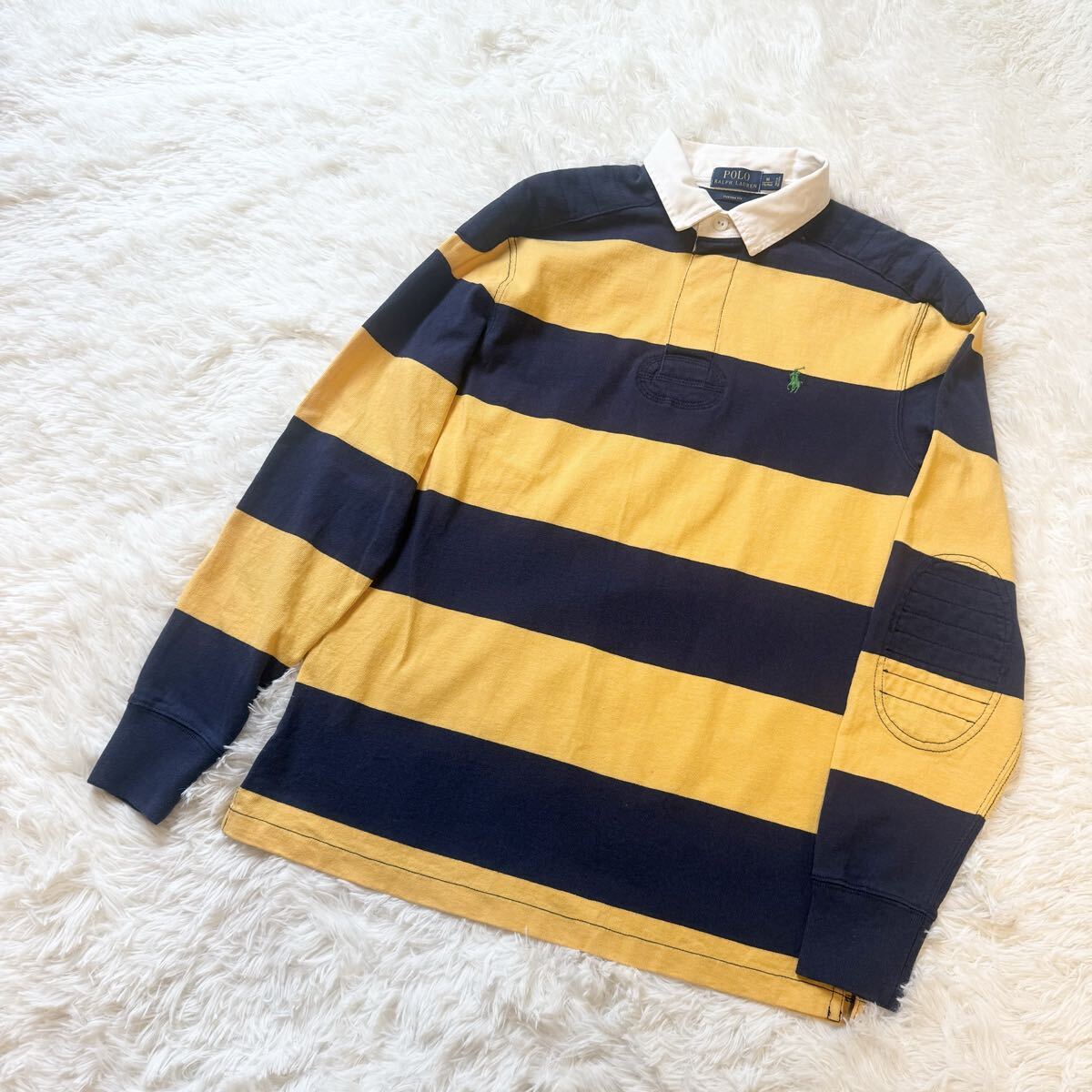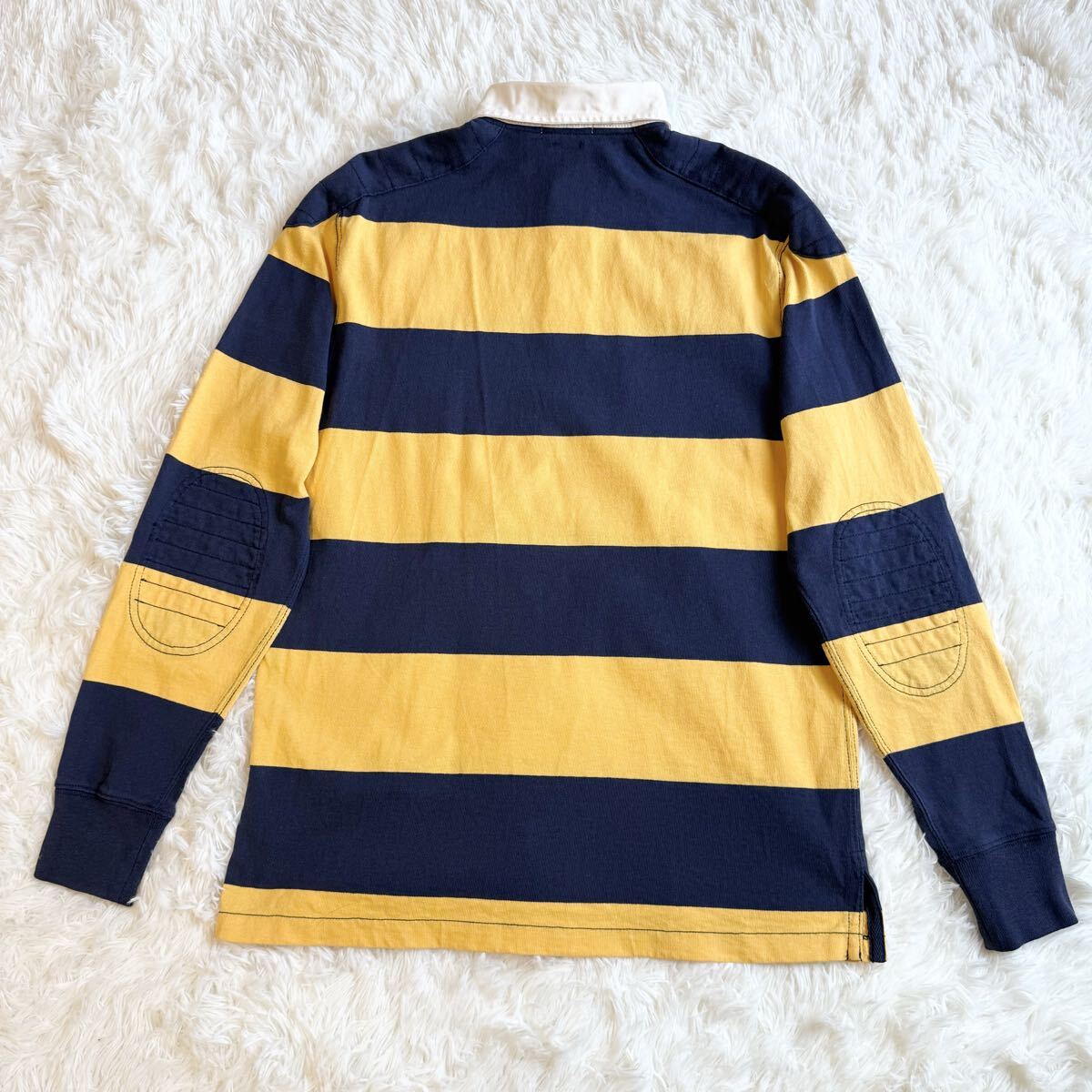 ネイビーとイエローのボーダー長袖ラガーシャツ、コットン素材で快適な着心地。