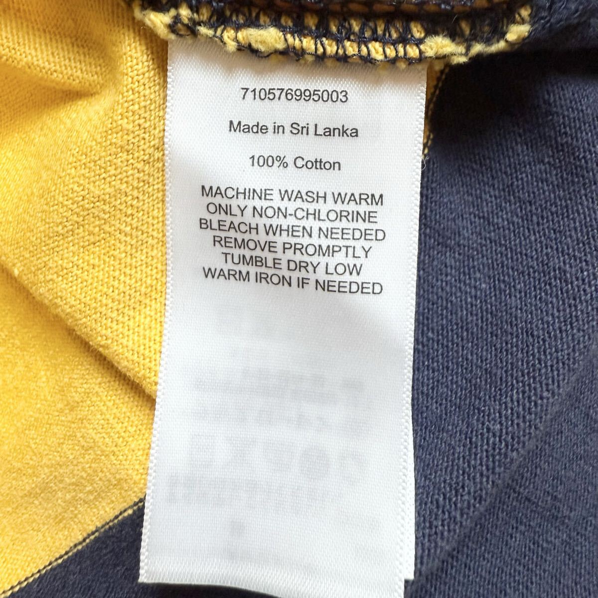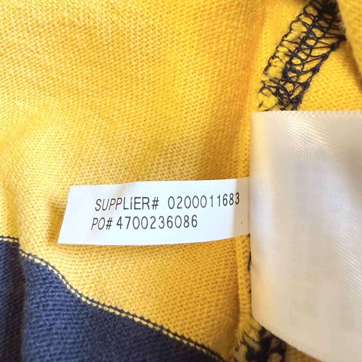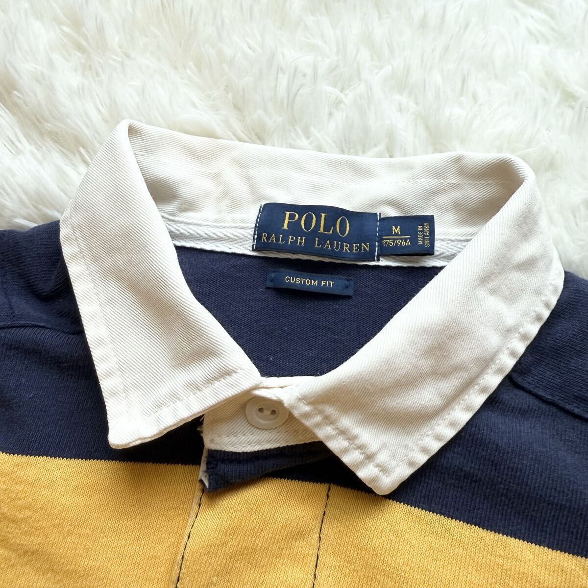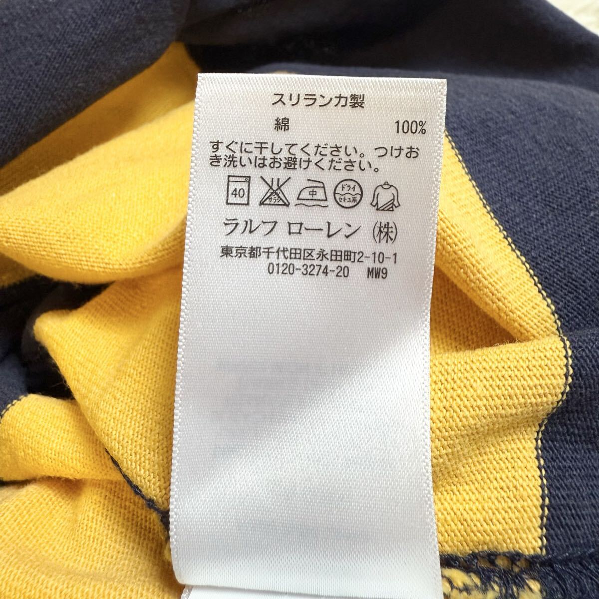 ネイビーとイエローのボーダー長袖ラガーシャツ、コットン素材で快適な着心地。