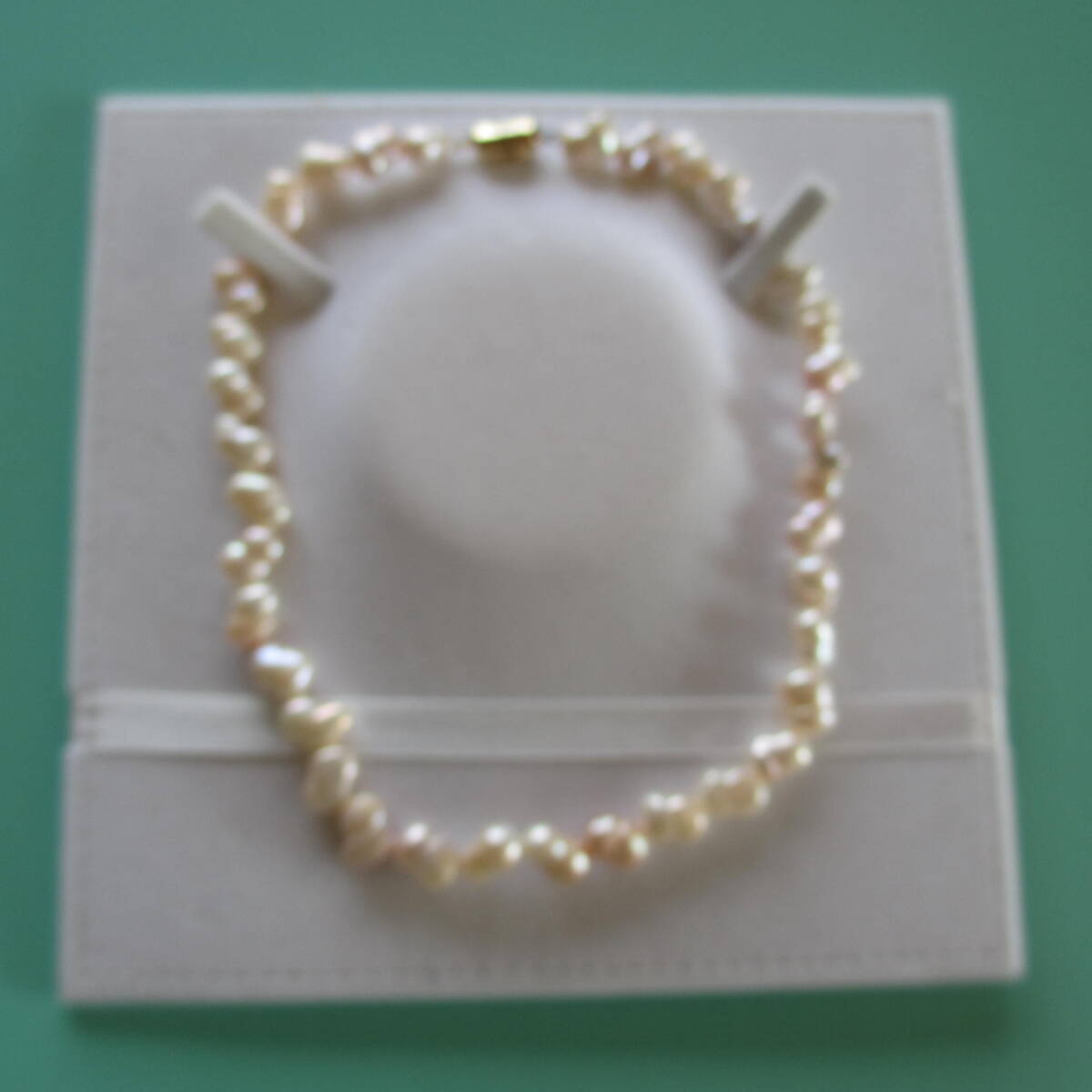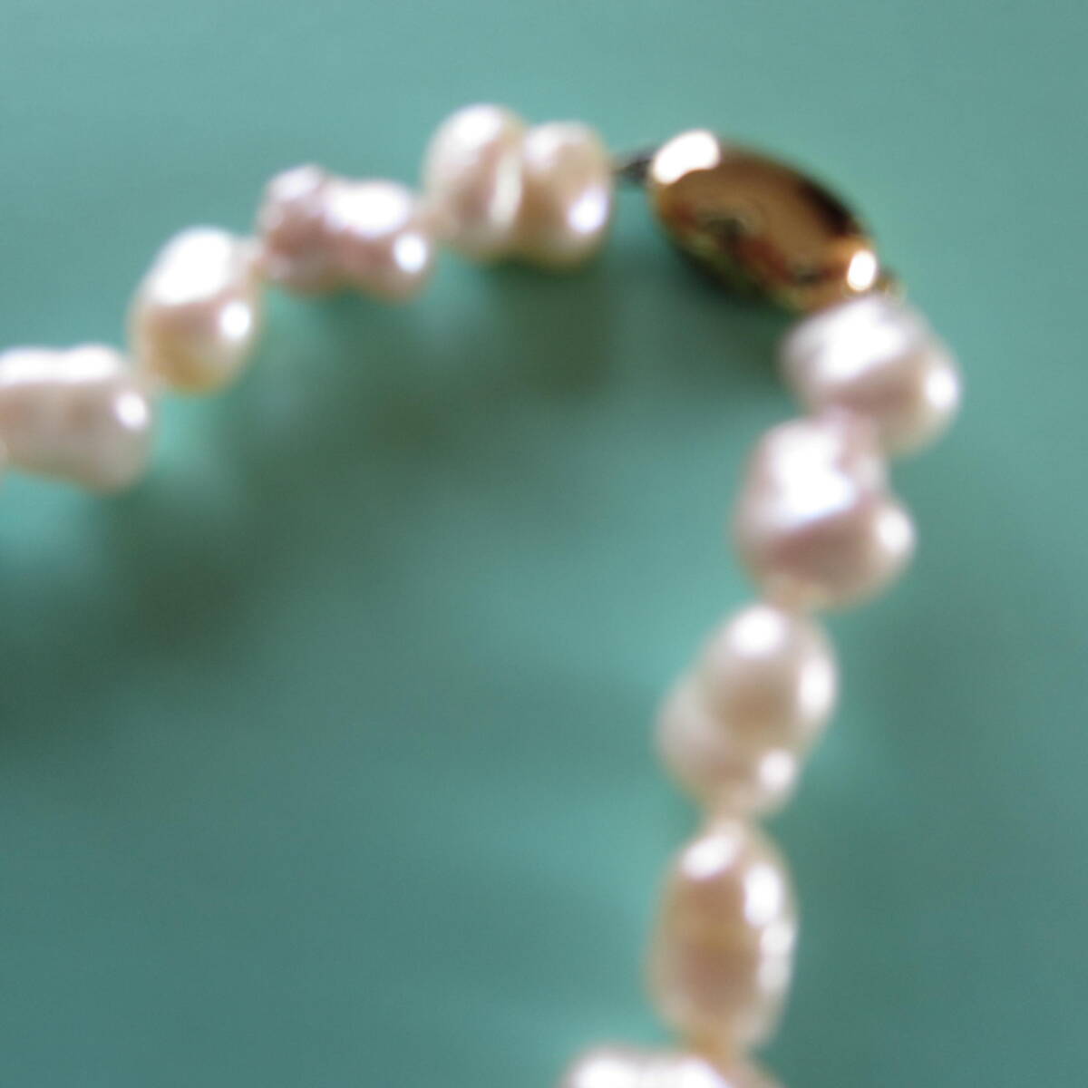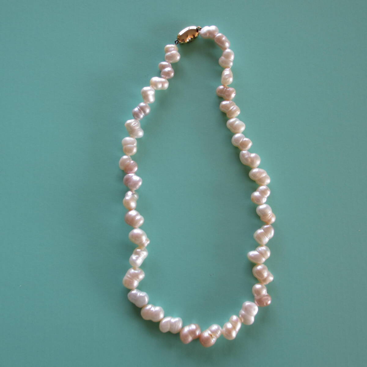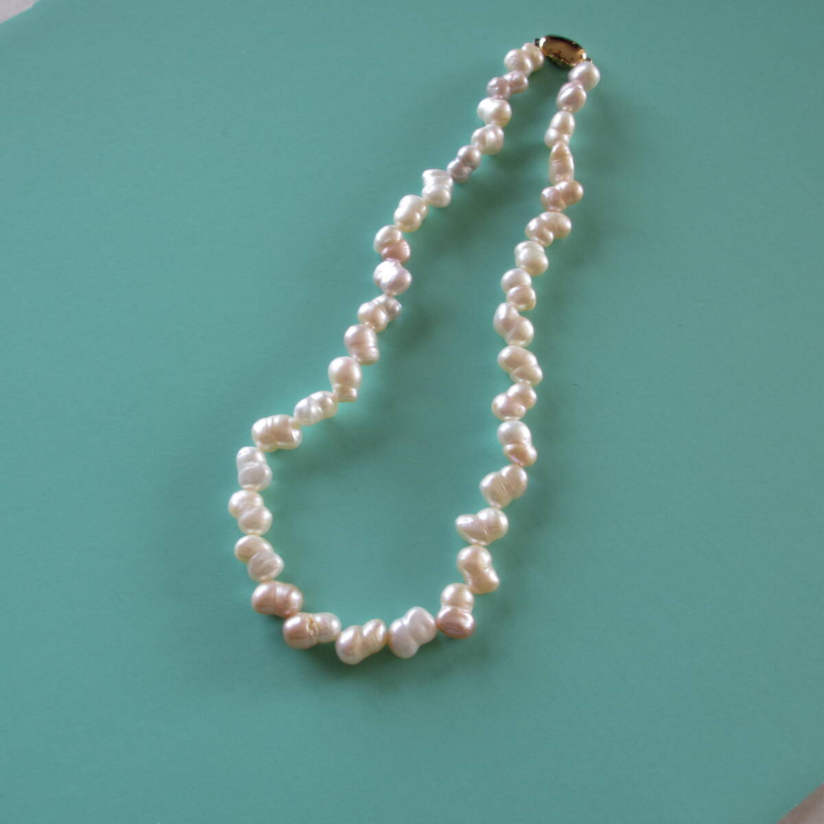 お色目はホワイトカラーと淡いピンクのコラボレーションのバロックネックレスです。(自宅保管)