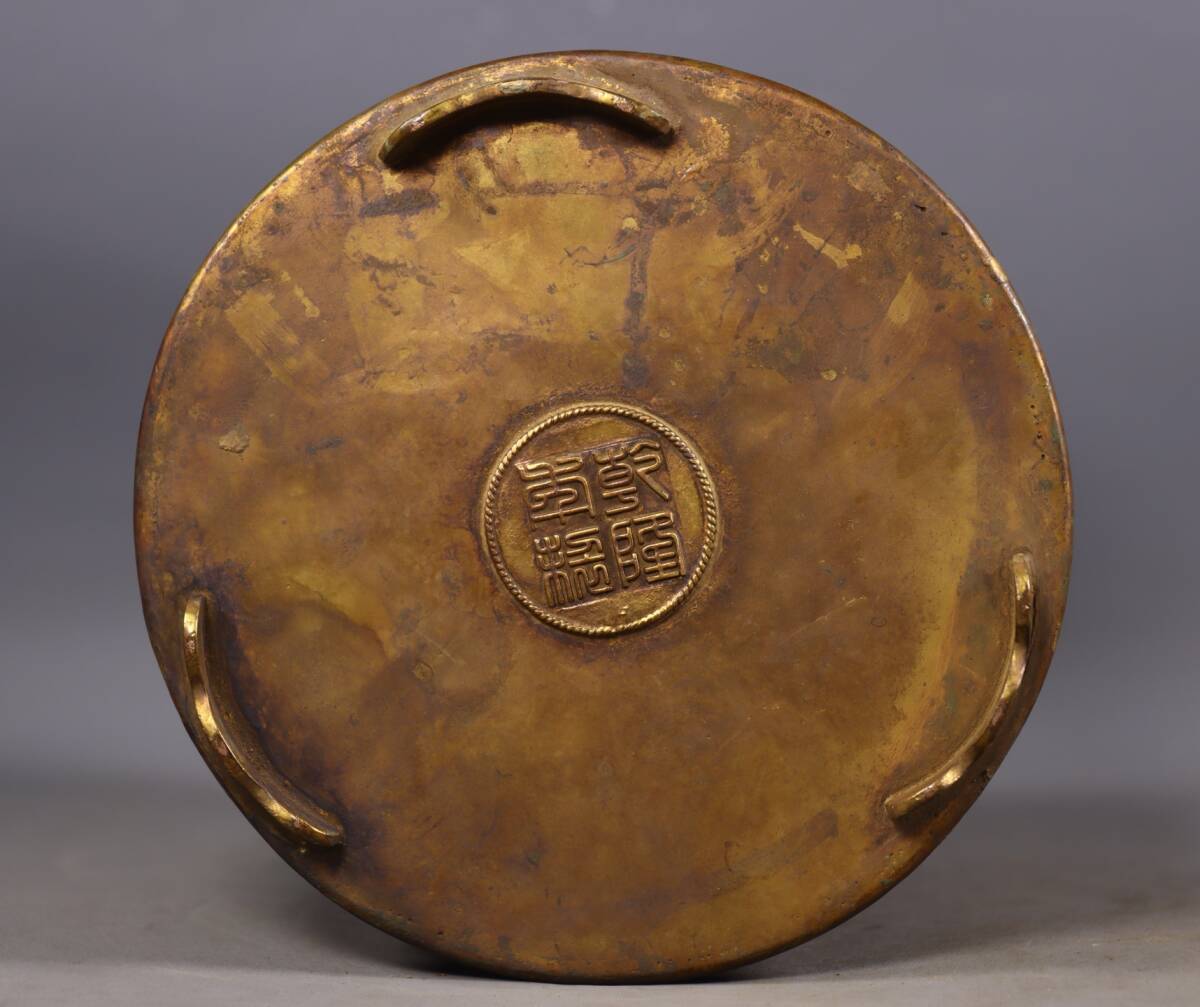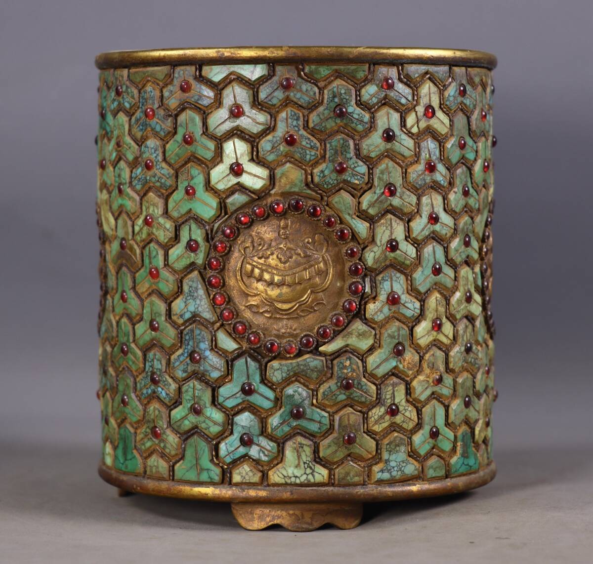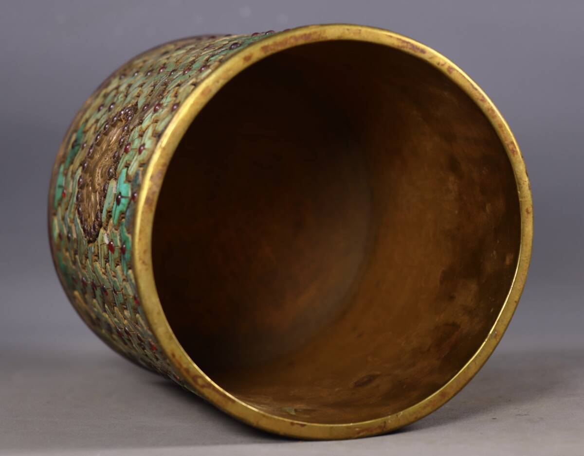 唐物 清 乾隆年製 純手工打造 銅塗金 八寶嵌工藝 筆筒 モザイク綠松石 紅寶石 巧奪天工 希少珍品 人間国宝 中国古玩 骨董品 古美味 D68