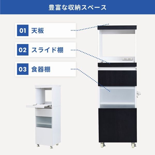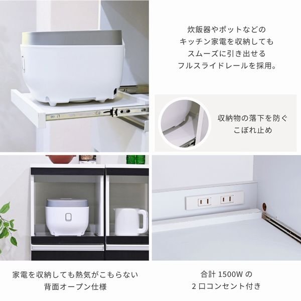 家電の収納に便利なコンセント付きスライド棚と、収納物に合わせて高さ調節ができる可動棚付きのラックをこれ1台で。 ワイドタイプは収納量も抜群。 キッチンのちょっとした隙間に設置すれば、それまでのデッドスペースを有効活用できます。 |