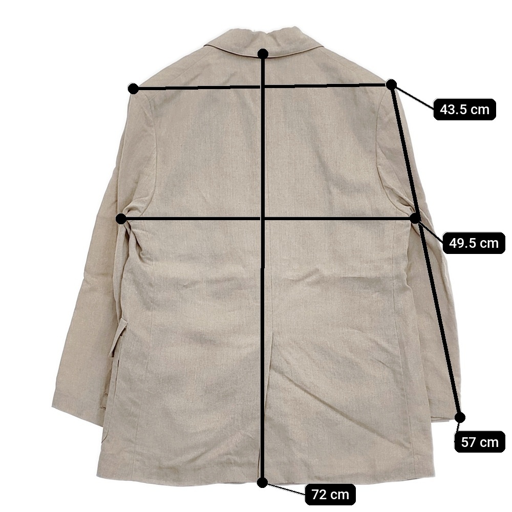 | 実寸サイズ | 肩幅:約43.5cm 着丈:約72cm 身幅:約49.5cm 袖丈:約57cm ※採寸画像がある商品はハンガーに吊るした状態での計測のため、平置きでの採寸とは差が生じる場合がございます。平置きでの実寸サイズをご希望の場合は、ご購入前に必ずご質問ください。 ※記載以外のサイズが合わないことを理由とした返品はできませんので、 記載部分以外で実寸サイズの気になる箇所があれば必ず購入前にご質問ください。 |