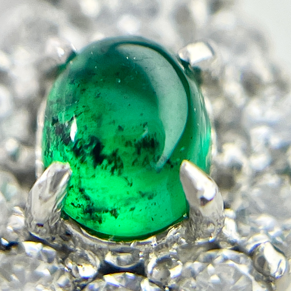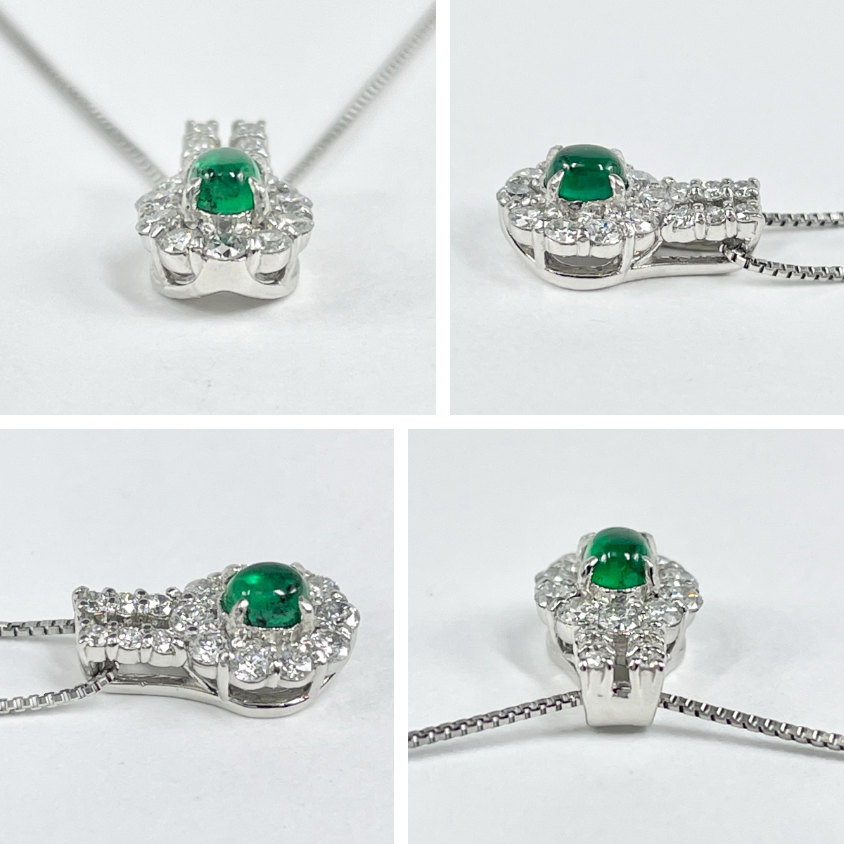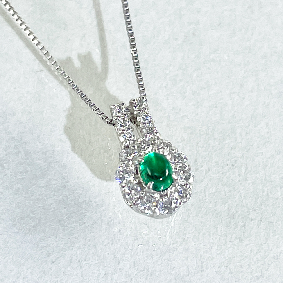 深みのあるグリーンが魅力のエメラルドを、ダイヤモンドで華やかに取り巻いたペンダント。