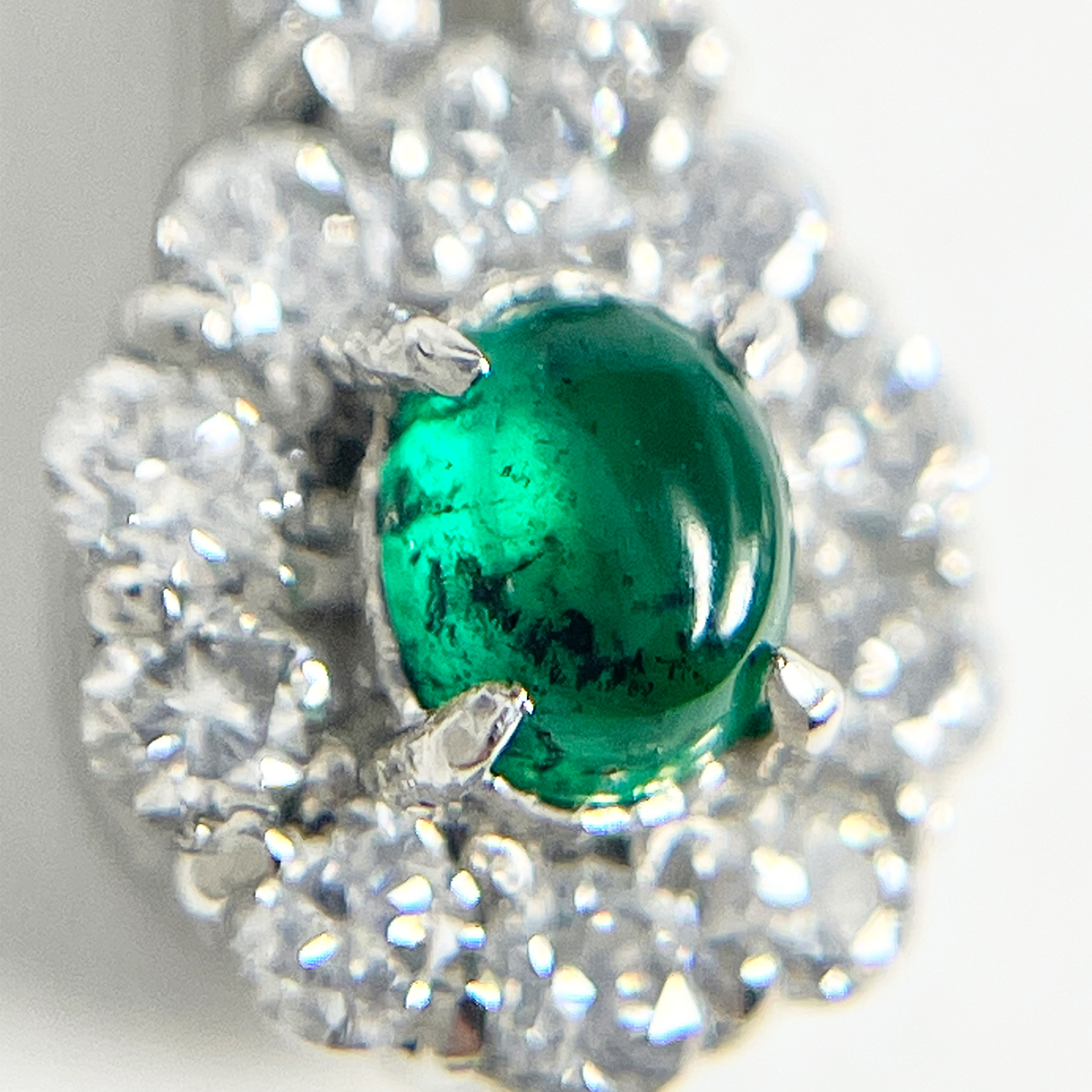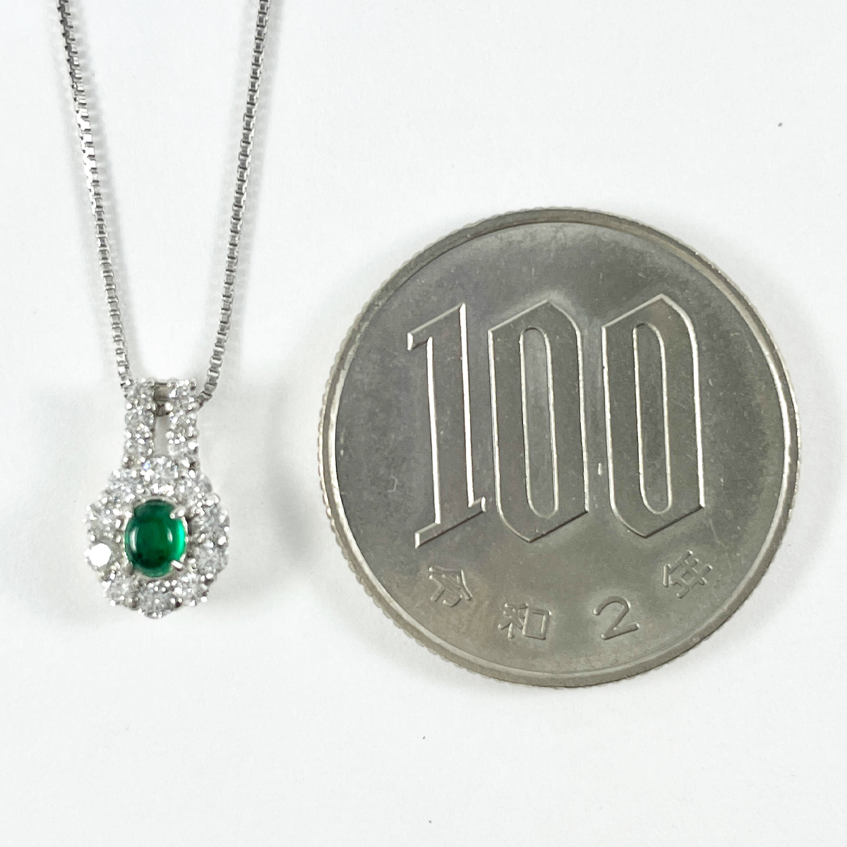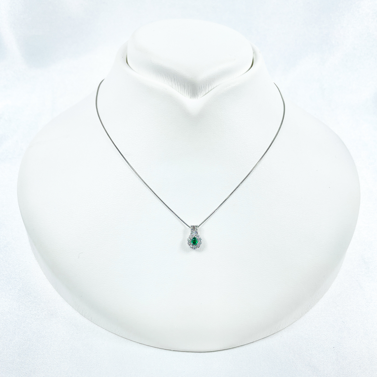 深みのあるグリーンが魅力のエメラルドを、ダイヤモンドで華やかに取り巻いたペンダント。