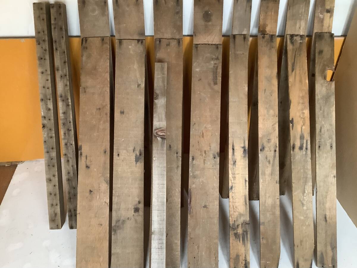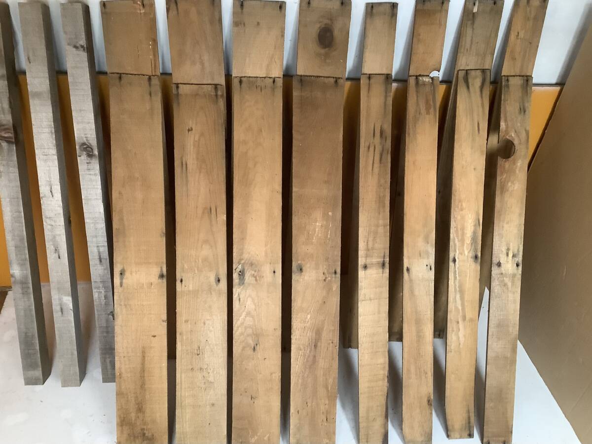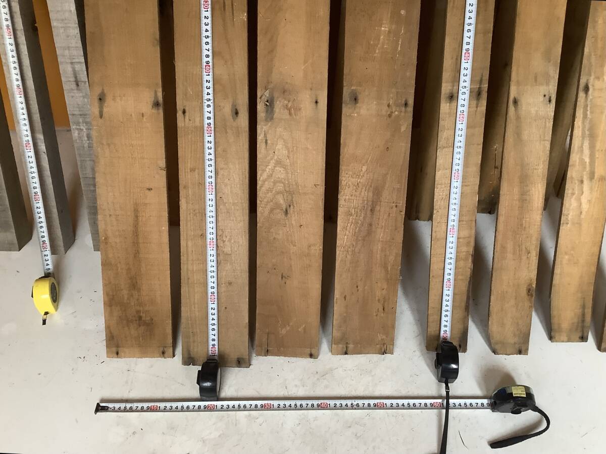 ご覧いただいてありがとうございます。画像は使い回ししております。基本セットとして松板16枚、松垂木3本、合計重さ9キロ以上の古材になります。板材寸法93.5センチ× 12センチ弱× 1センチが15枚から16枚、93.5センチ× 7.5から9.0センチ× 1センチが混ざる場合もあります。垂木93.5センチ× 5.8センチ× 4.8センチの3本全部で基本的には19点になります。重さ調整のため枚数が増減する可能性があります。画像は混ざった状態となっております。お荷物到着後は枚数と9キロ以上の確認をお願いしたいと思います。寸法については若干の誤差はあると思いますが、お得なセットと考えております。
