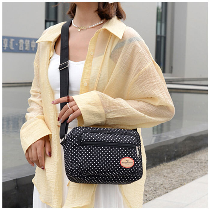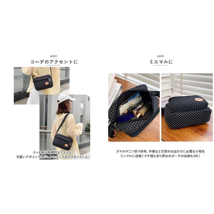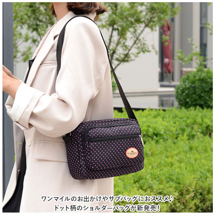 商品説明 | ・・ワンマイルのお出かけやサブバッグにおススメ♪ドット柄のショルダーバッグが新発売! ・【コーデのアクセントに】 ・ドット柄が特徴的なアイテム!可愛いデザインでカジュアルコーデのアクセントにも♪ ・【ミニマルに】 ・スマホや二つ折り財布、手帳など日常のお出かけに必要な小物をミニマルに収納!マチ幅もあり厚めのポーチの収納もOK! ・【サブバッグとして】 ・コンパクトかつ軽くて丈夫なナイロン製。旅行やアウトドアレジャー等のサブバッグとして使うのもおススメ☆ ・【長さ調節OK】 ・シーンやスタイルに合わせて斜め掛け・肩掛けが可能。 ・【便利なポケット付き】 ・外側の前後と内側にもファスナーポケットを搭載。迷子になりがちな小物や、サッと取り出したい小物も仕分けて収納。 ・【ポケット仕様】 ・メインルーム・・・ファスナーポケット×1 ・フロント・・・ファスナーポケット×2 ・背面・・・ファスナーポケット×1 |