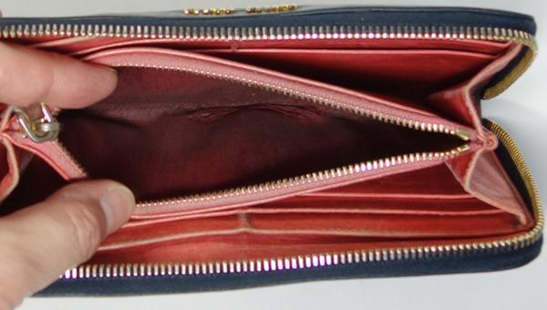 出品は画像の財布のみです。使用品ですので擦れや汚れが有ります。擦り傷や型くずれもあります。金具はメッキの色落ちや擦り傷有ります。財布の内側も汚れや擦れありますし、コインポケットはかなり汚れが有ります。サイズはW18.5xH10cmくらいです。