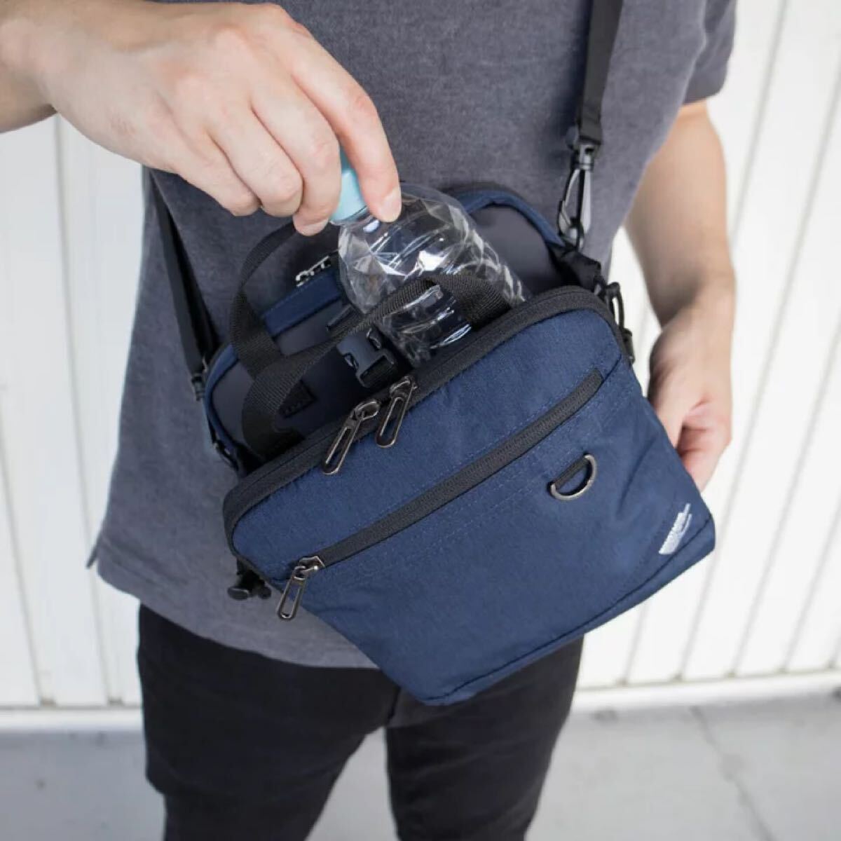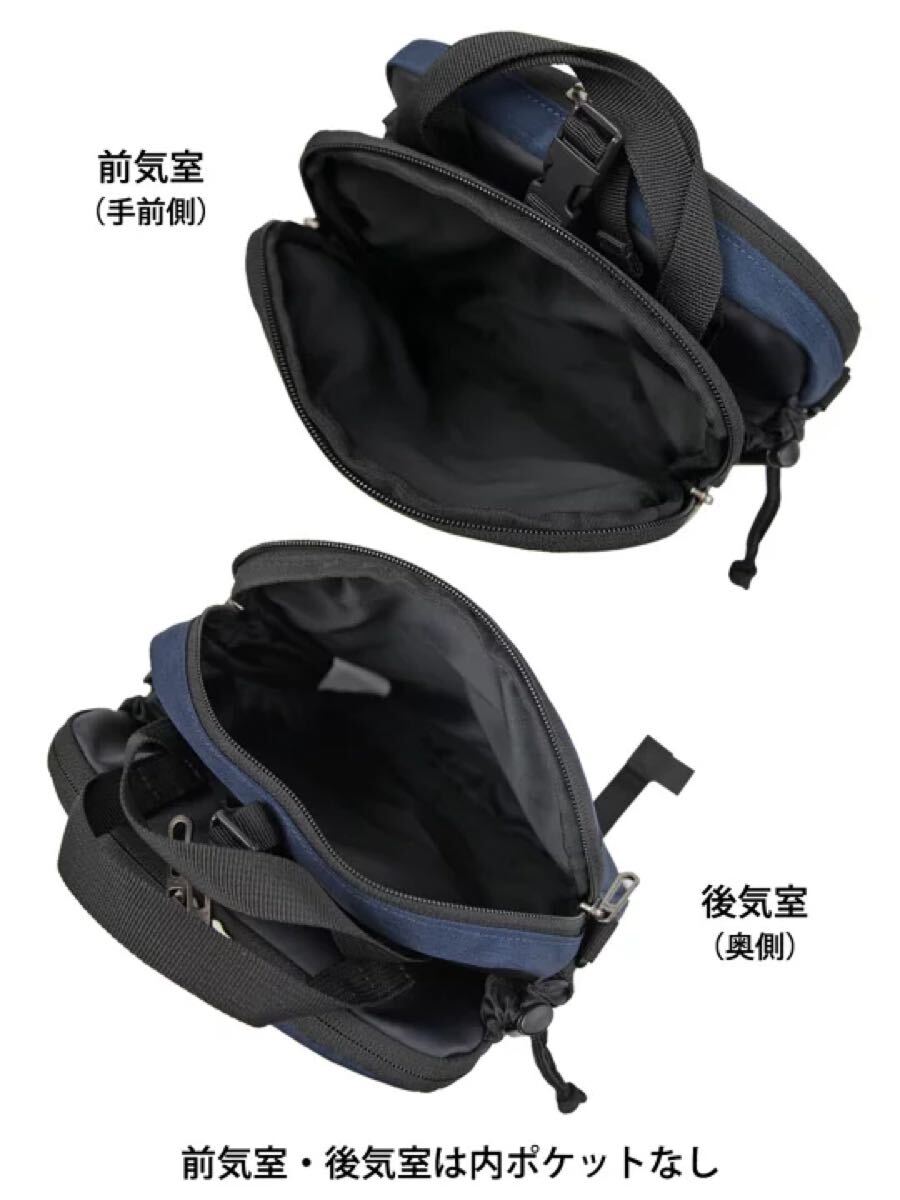 ●メイン収納部は前後2室に分かれていて用途やアイテム別に収納が可能。中央のメッシュ部分はマチ幅調整が出来てポケットボトルが最大3本入るのでトラベルやフェスなど野外での活動にも便利です。