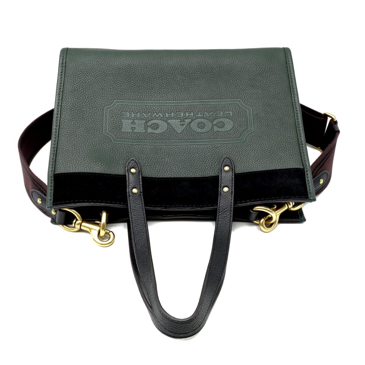 カラーブロックのポリッシュド ペブル レザーとスエードに合わせたコーチのロゴが特徴で、シンプルなデザインながら落ち着いた高級感のあるスタイルになっています。