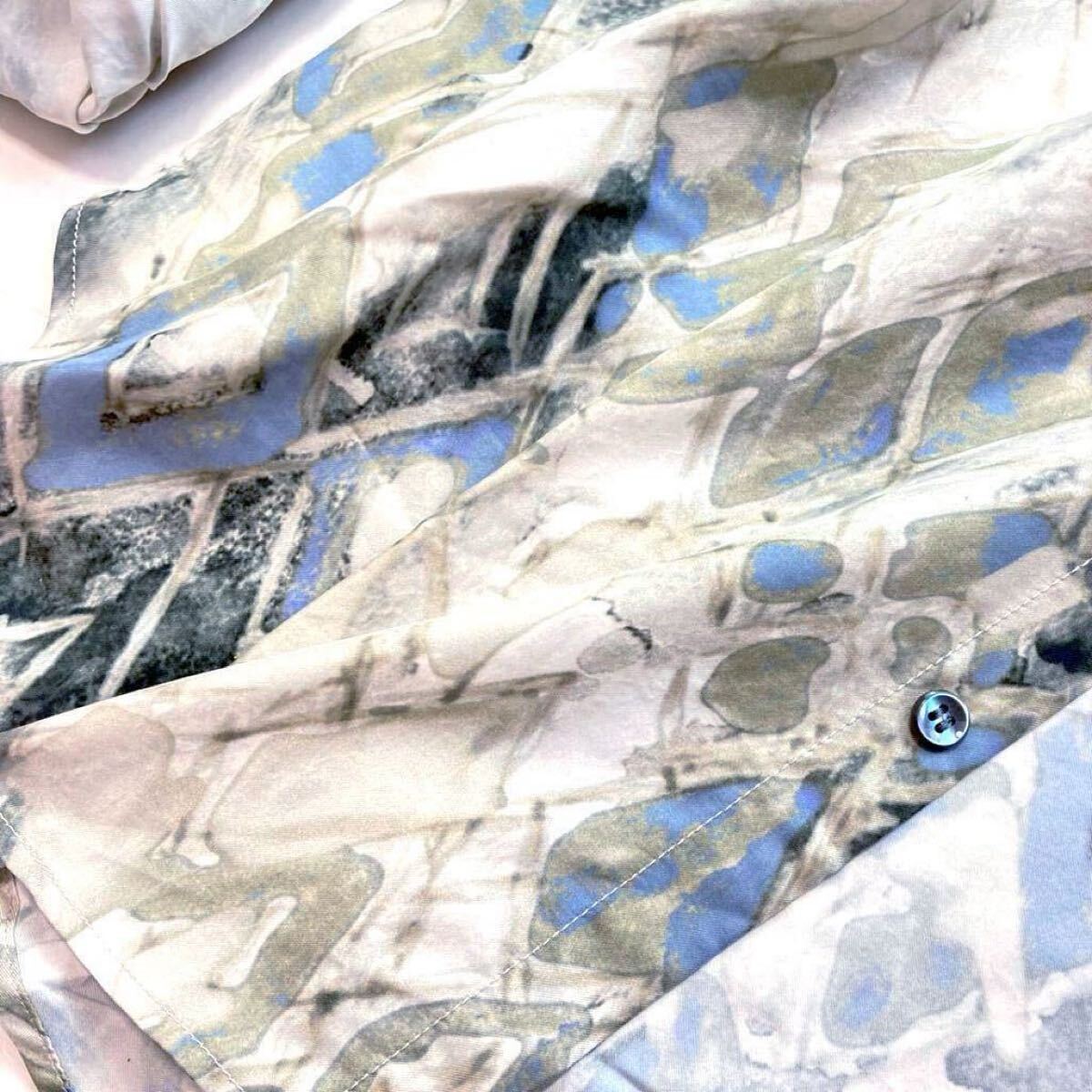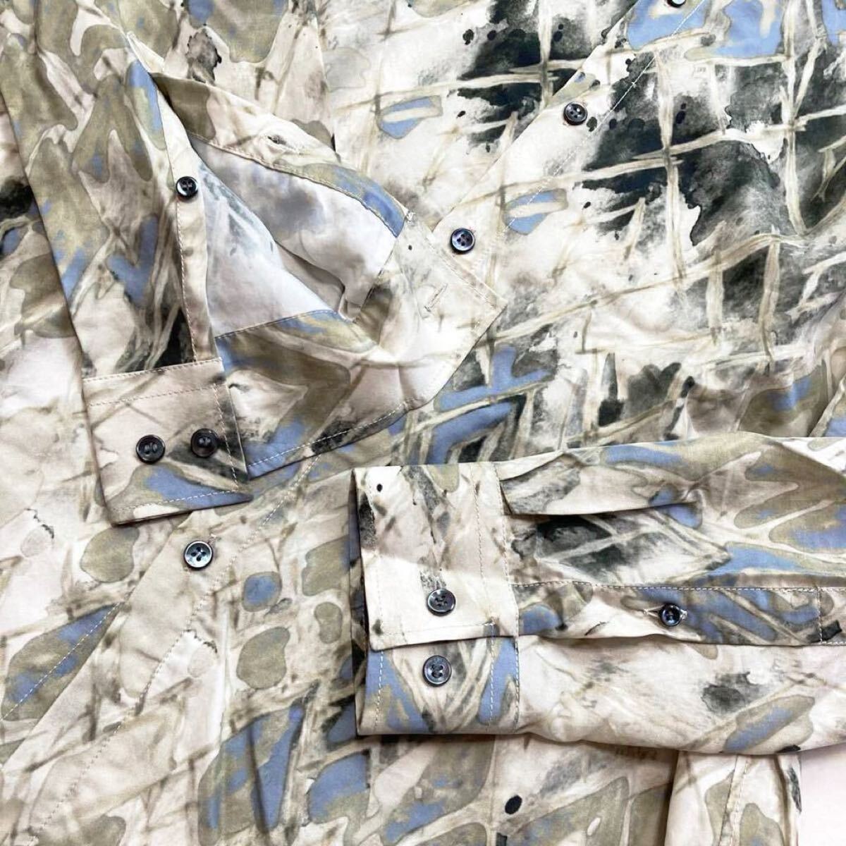 アイスグレーやカーキのような美しい発色の総柄も際立ち、光沢感を放つ大変上品で雰囲気がよい1着。