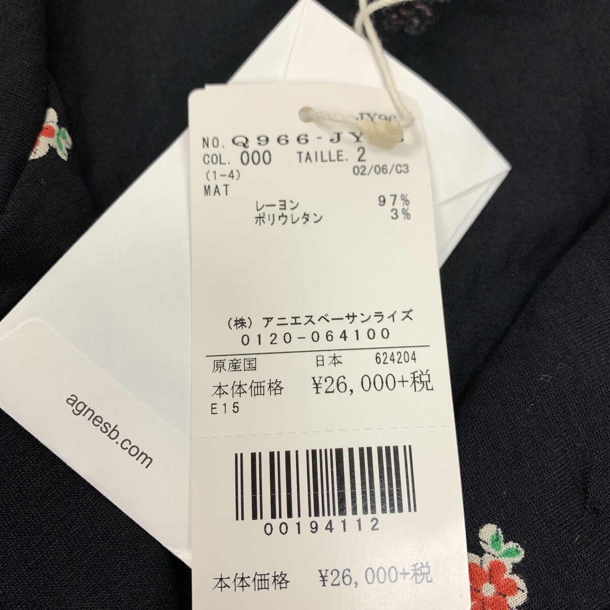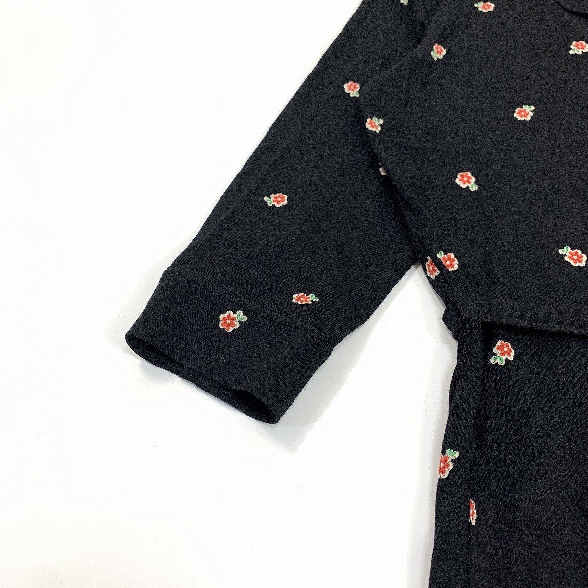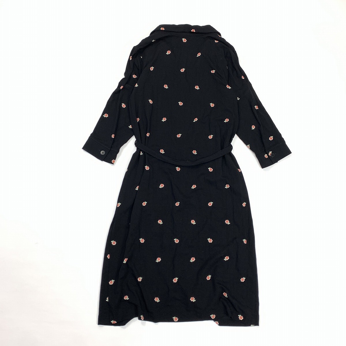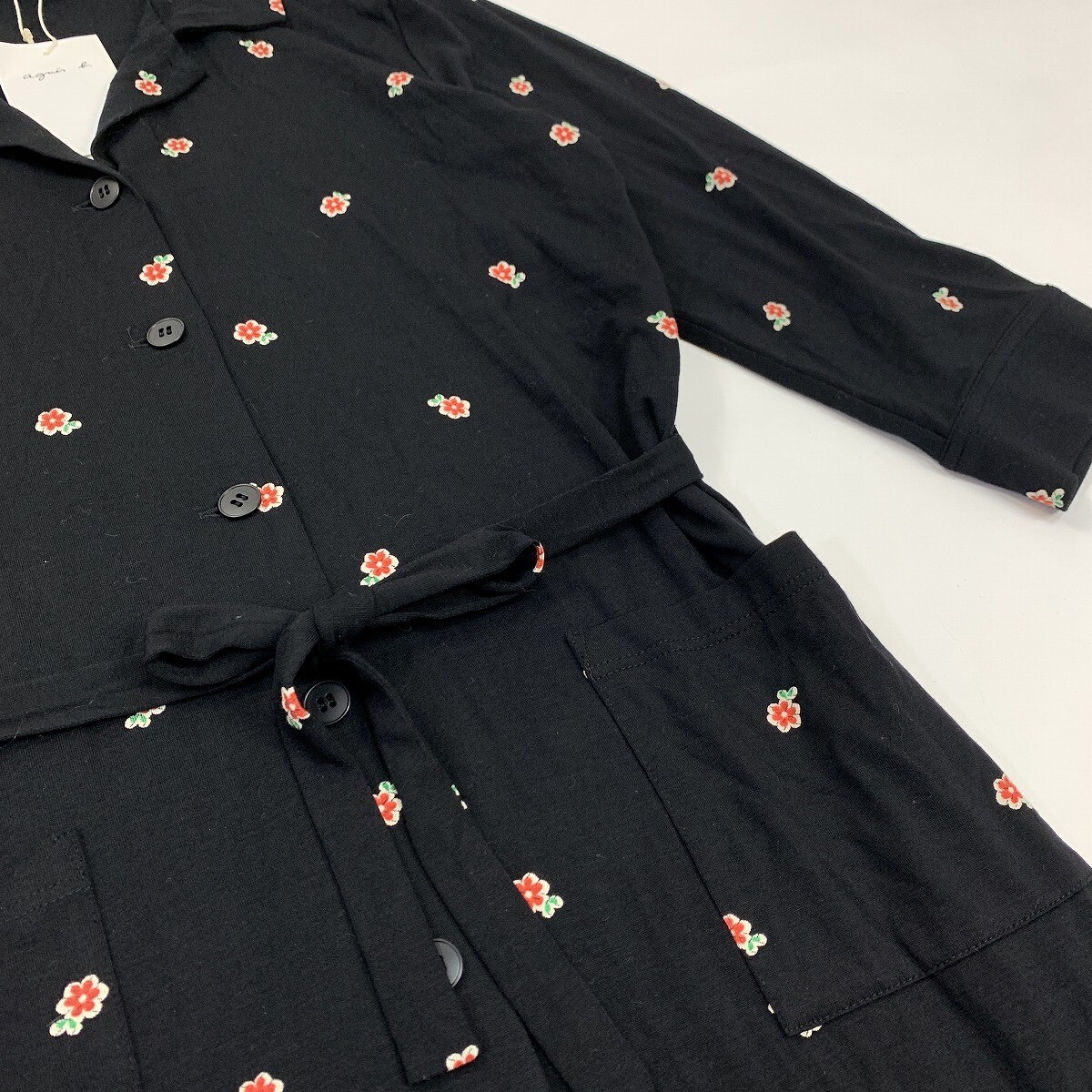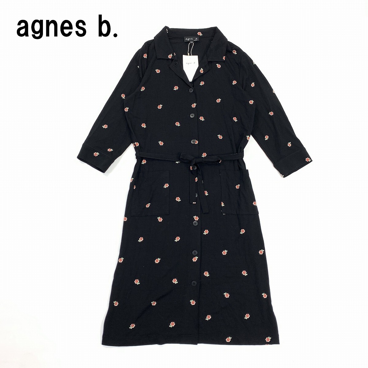 新品タグ付き agnes b. アニエスベー ロングワンピース シャツ 七分袖 レーヨン 花柄 黒 ブラック 2 YC1044