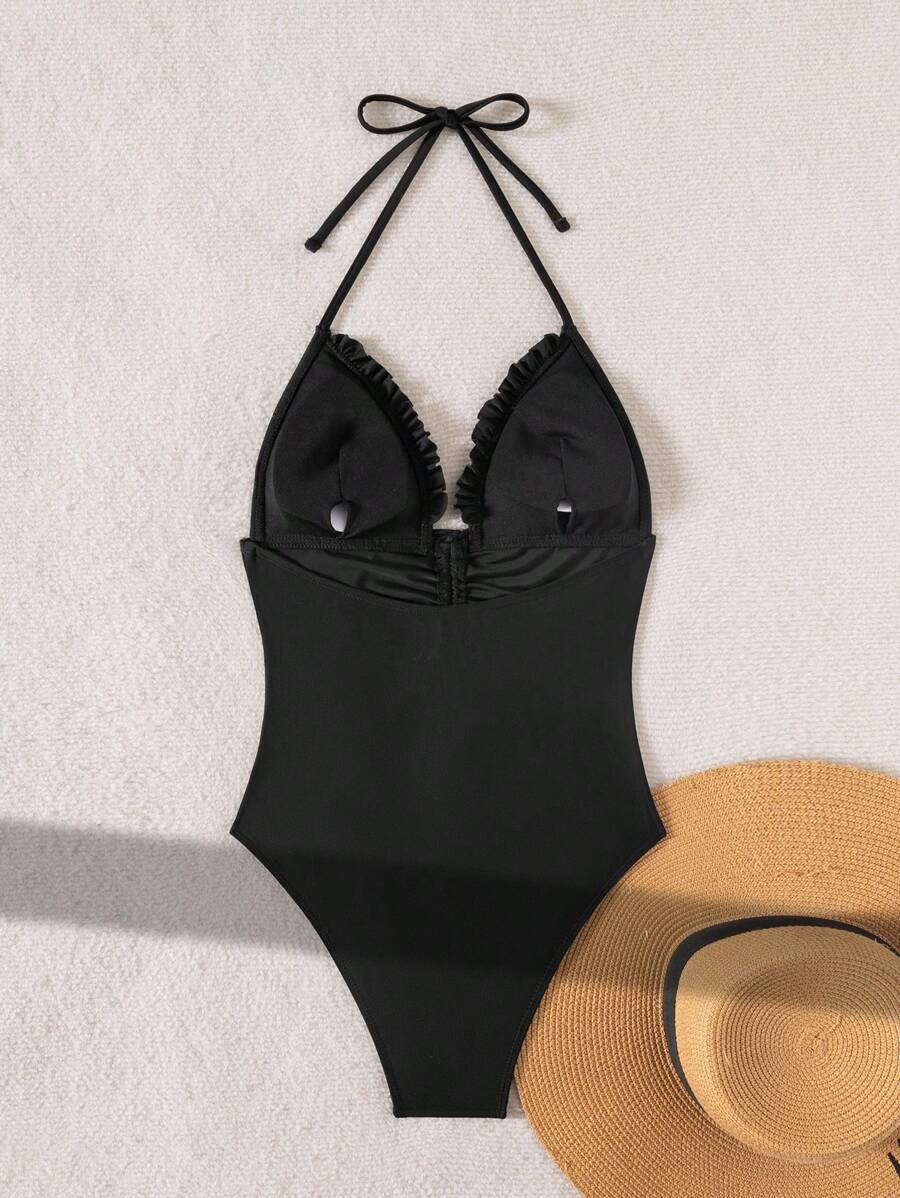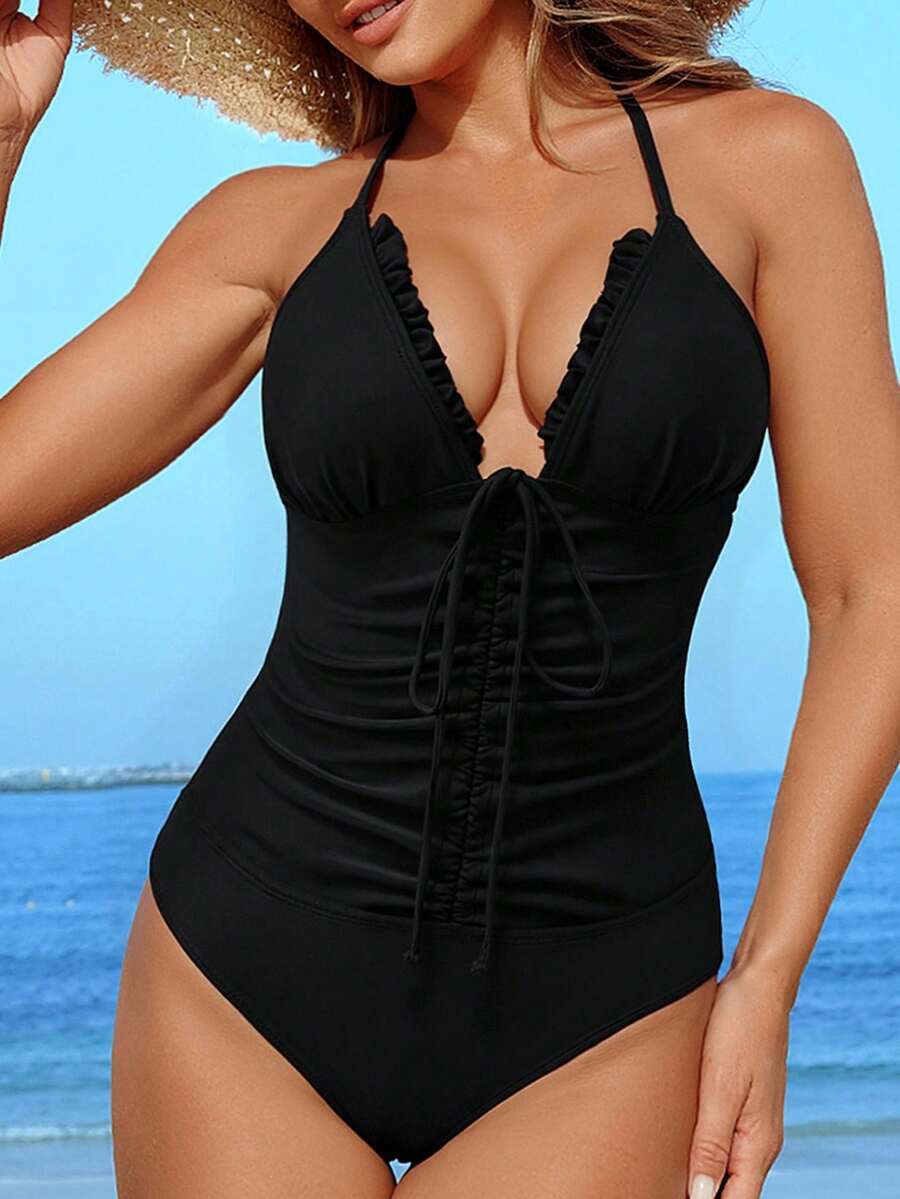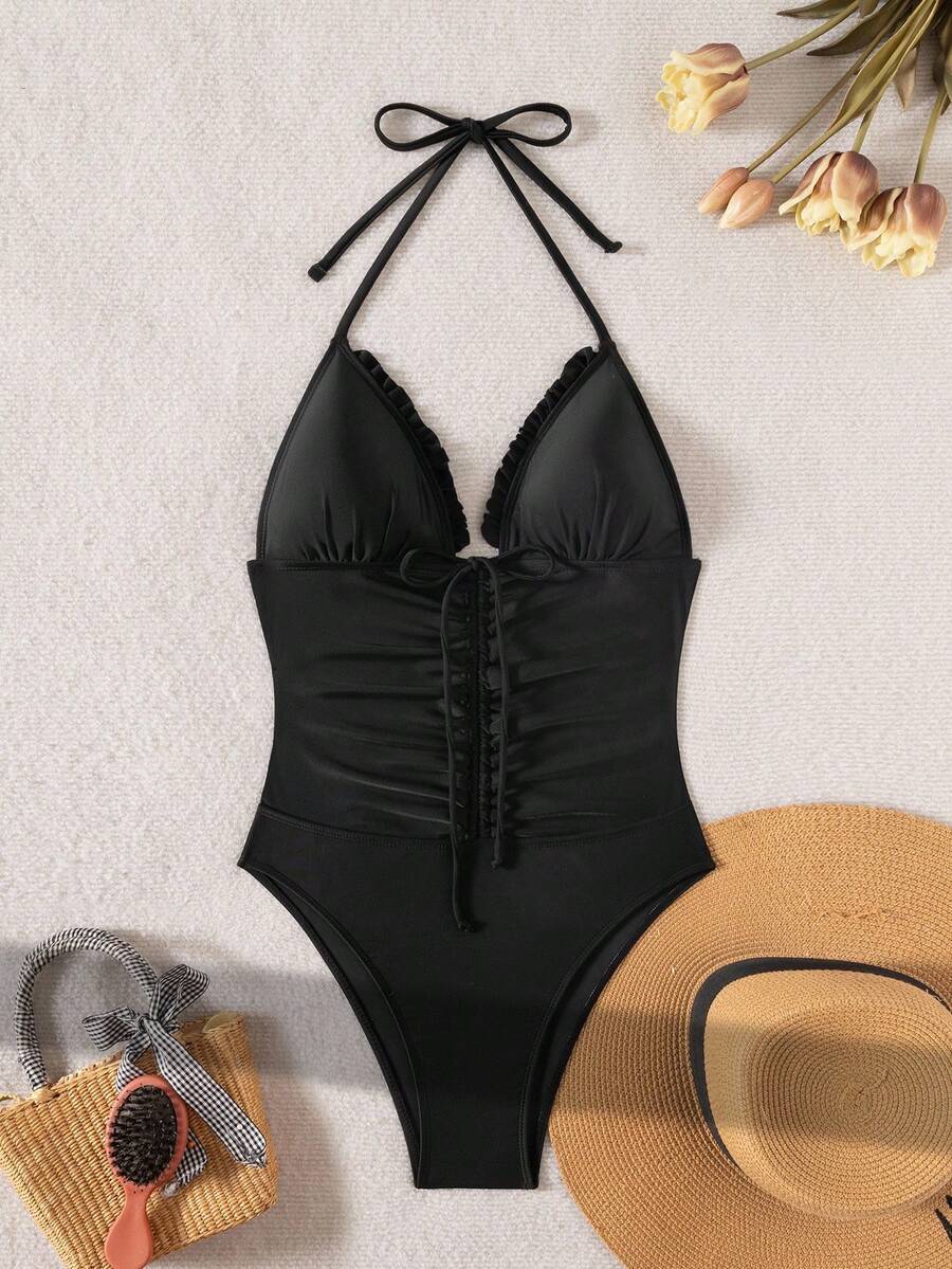 レディース 水着 ワンピース 1枚 レディース 無地 トライアングルカップ ラッフル フリル スパゲッティストラップ フロントギャ