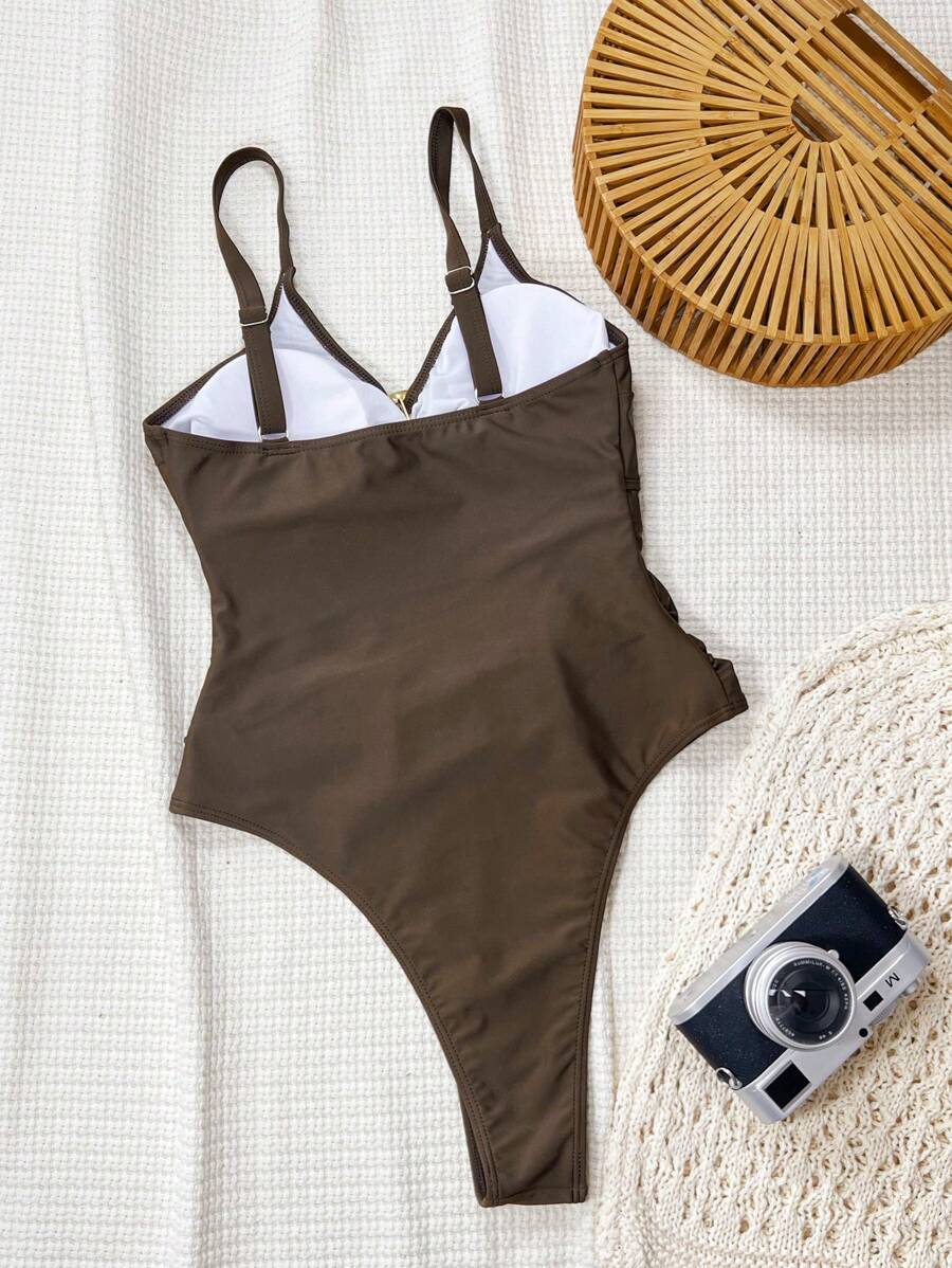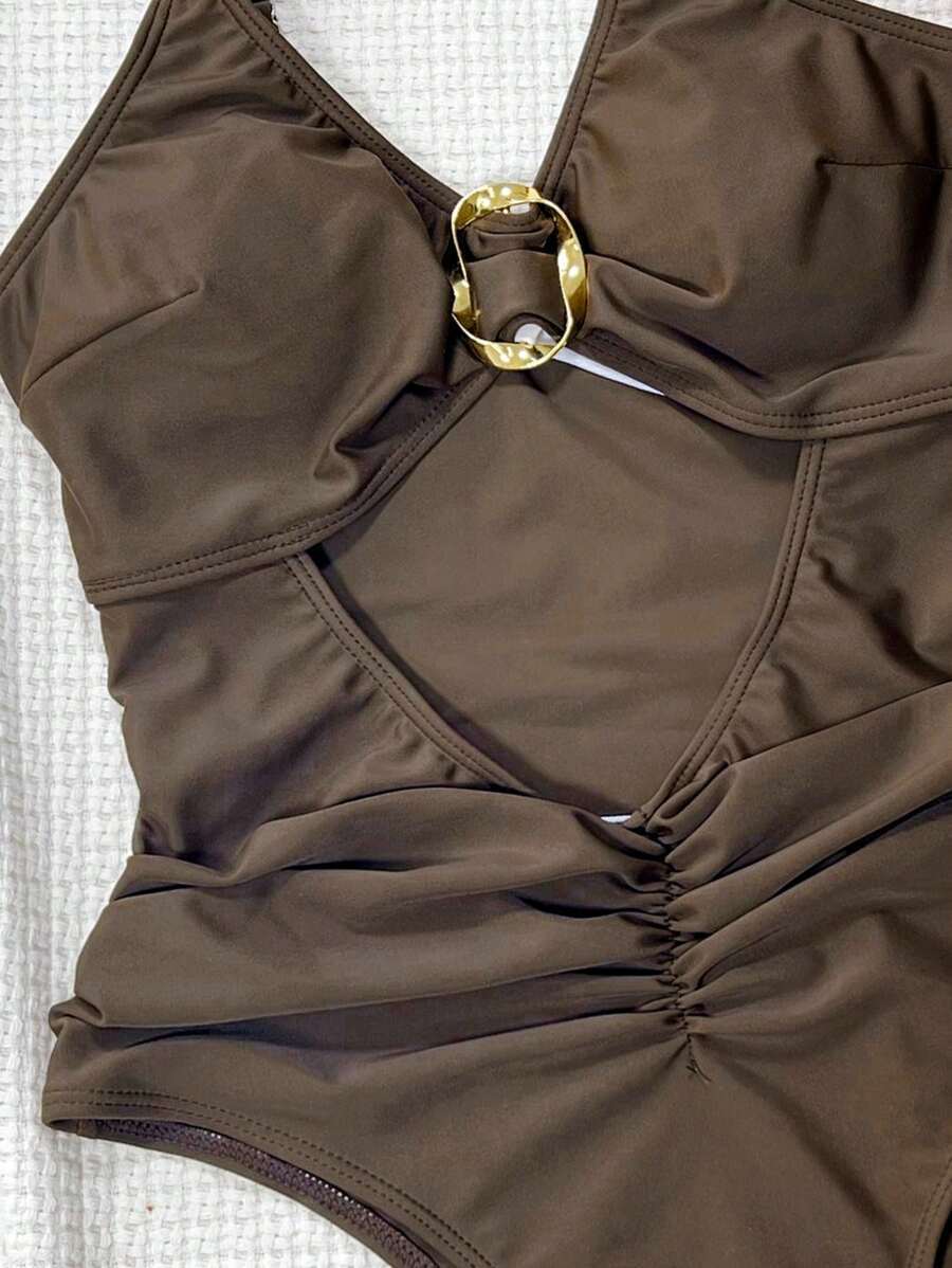 レディース 水着 ワンピース レディース 無地 スパゲティストラップ ホロー メタルツイストラウンドリング装飾 カジュアル ビーチ