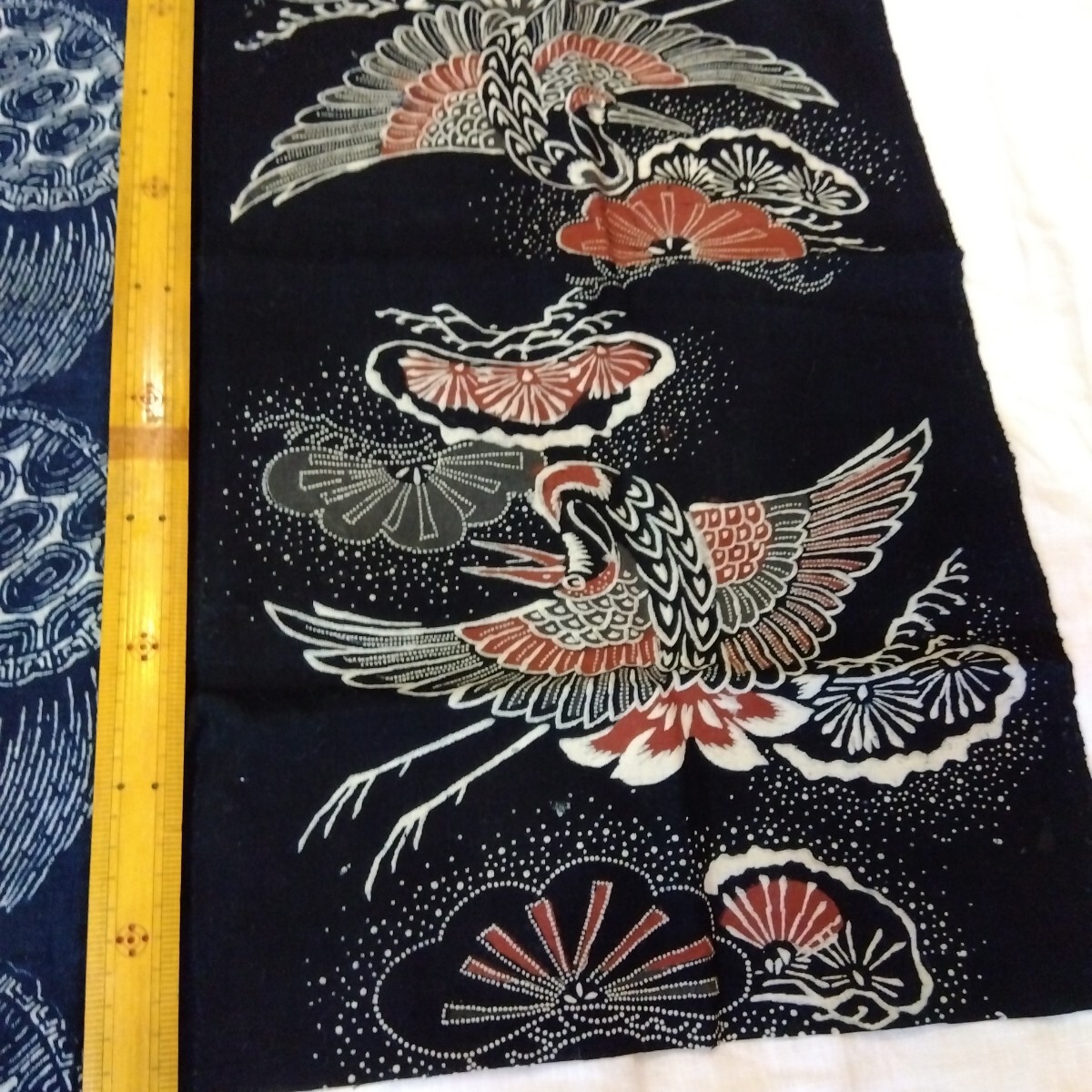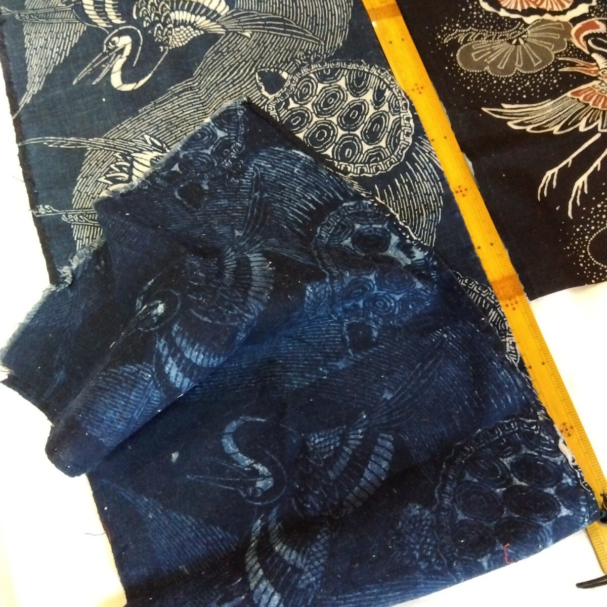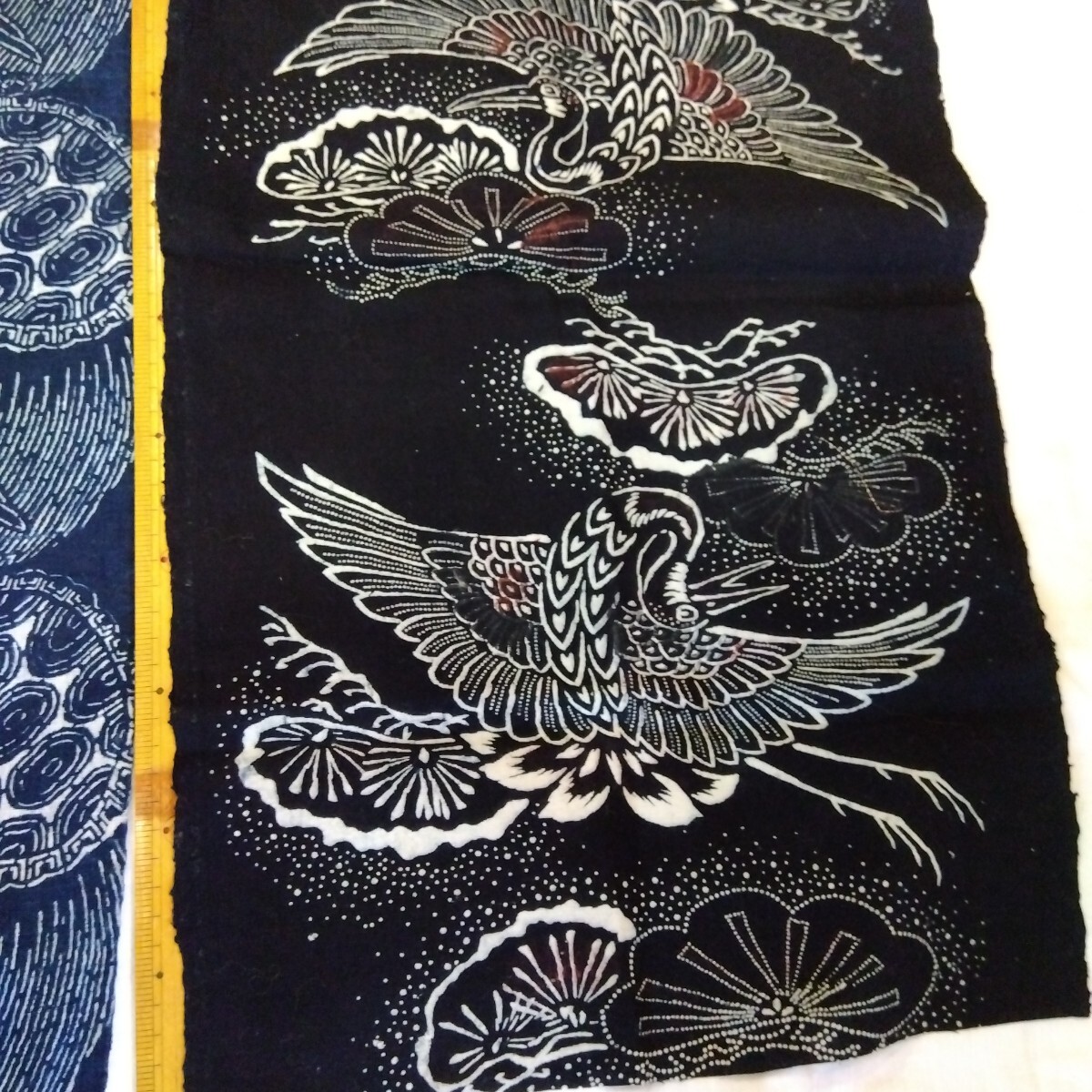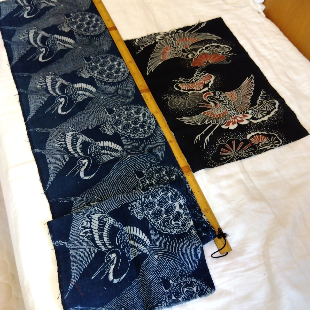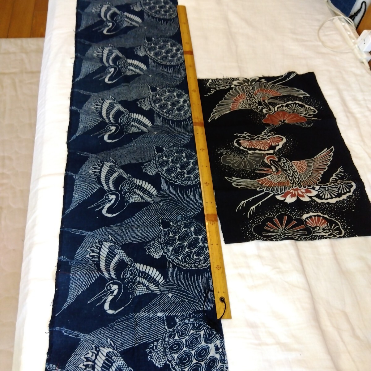 古布藍染ハギレ2種 鶴亀模様140cm、色鶴模様 木綿 型染 縁起物