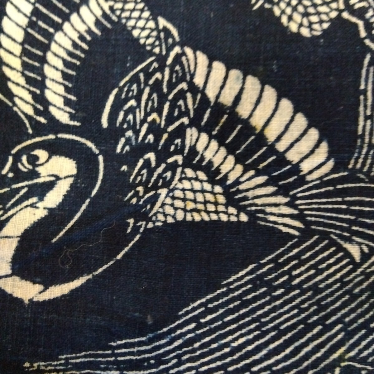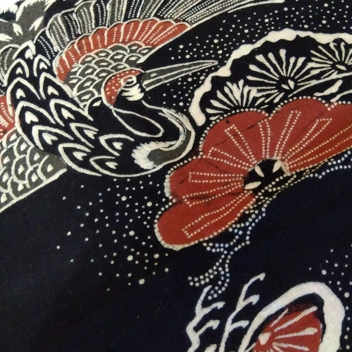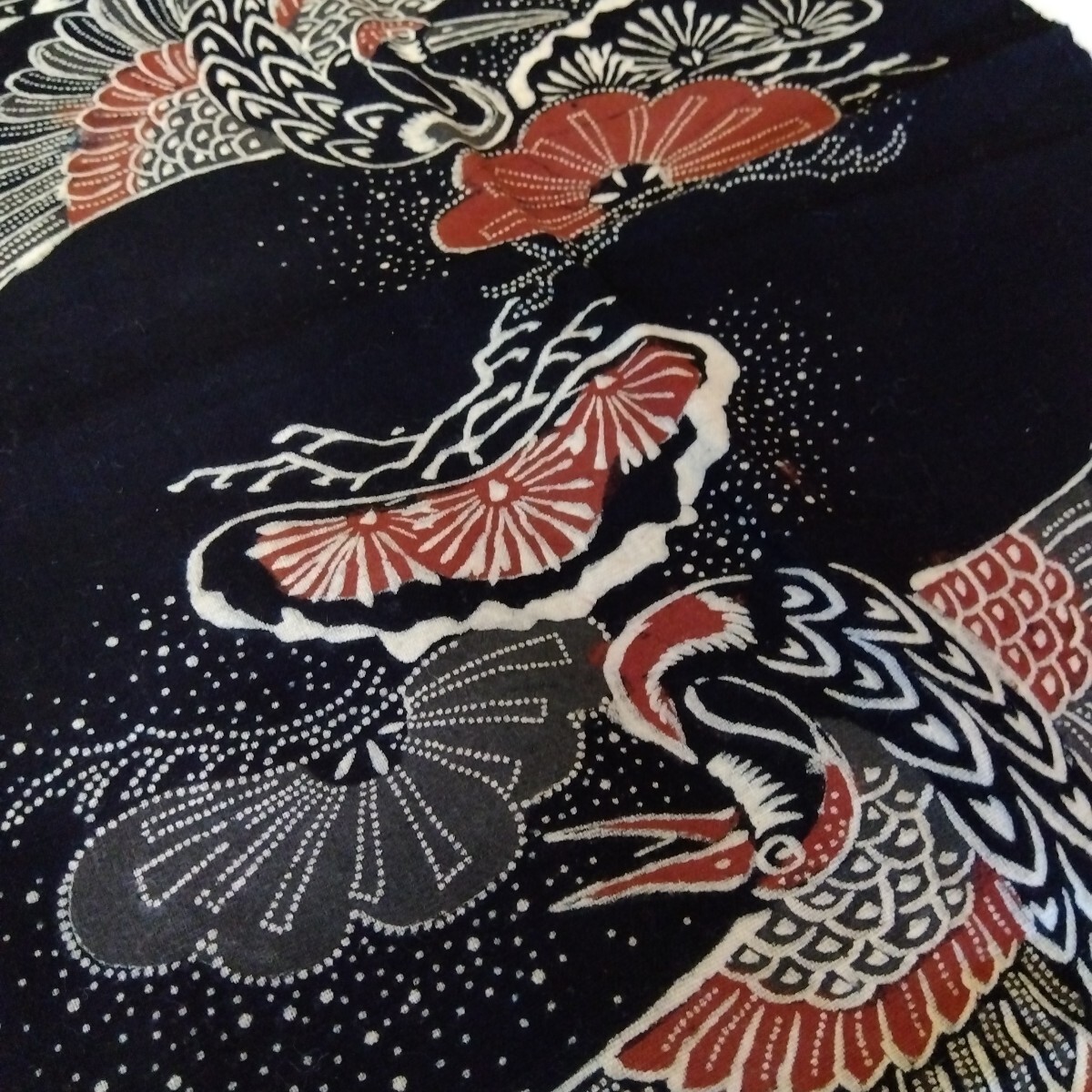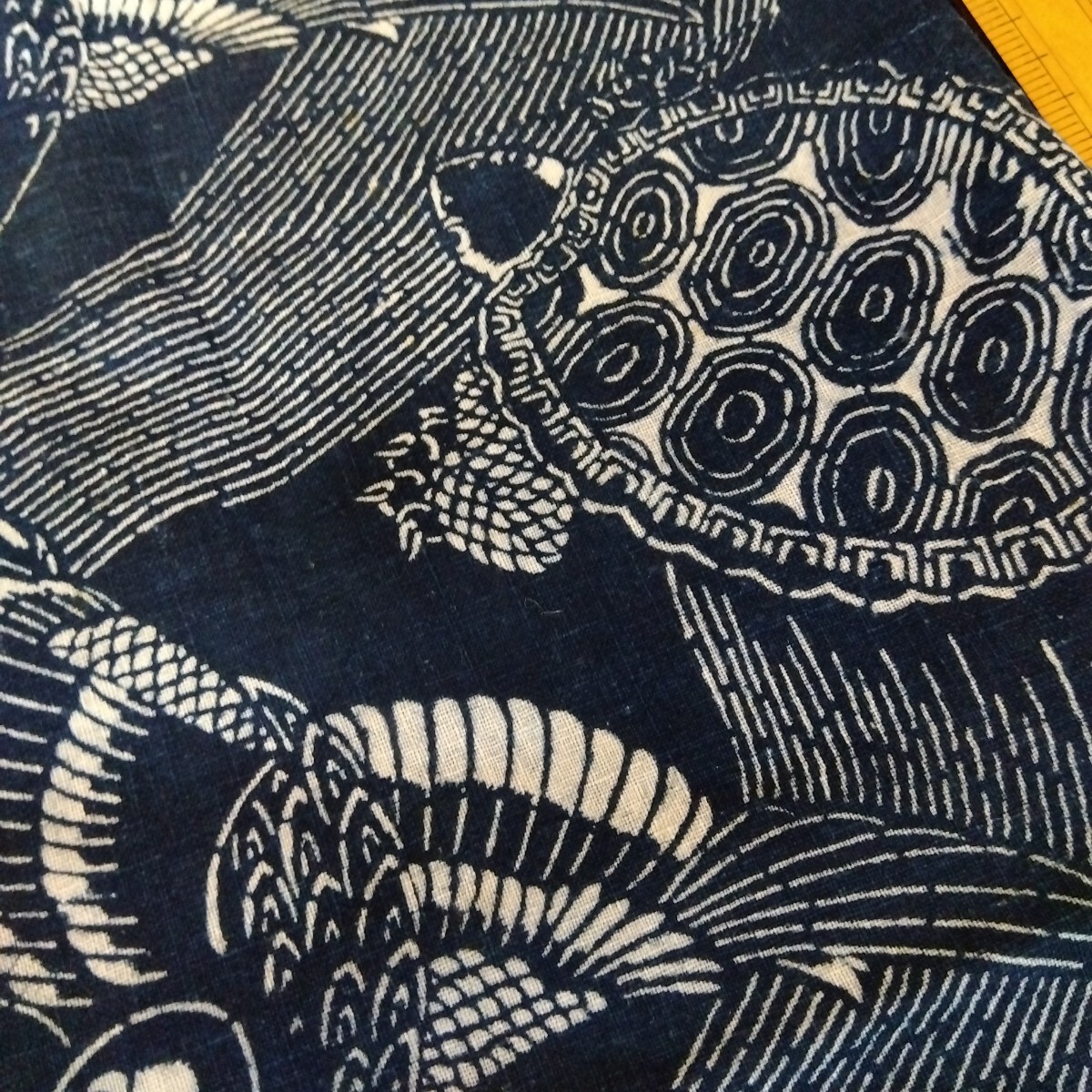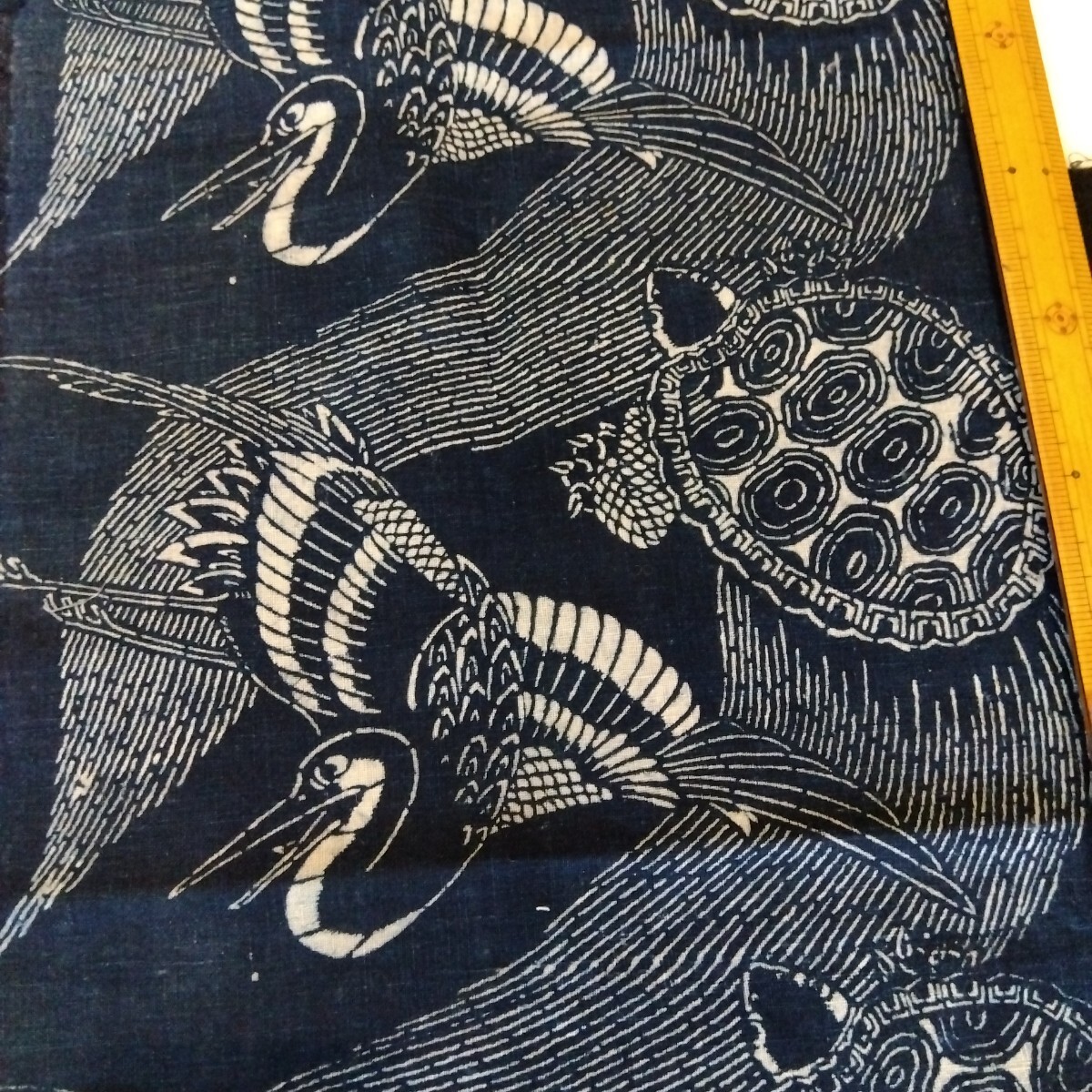 藍染木綿。濃紺色地 型染 鶴亀模様。