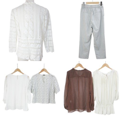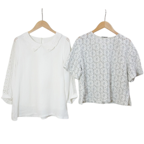 【状態】この商品には下記のようなダメージがあります。 ・アイボリーのブラウスの所々に糸引き ・白色の総レースブラウス左袖に5mm程度の茶色の汚れ ・白色の衿付きブラウスの右袖に小さな汚れ、3cm程度の薄い汚れ、首元内側、右袖に糸引き その他に目立ったダメージはなくまだまだご使用いただける商品です。 ※あくまでも中古品ですので掲載写真や記載内容をご確認いただき、ご理解の上ご購入ください。