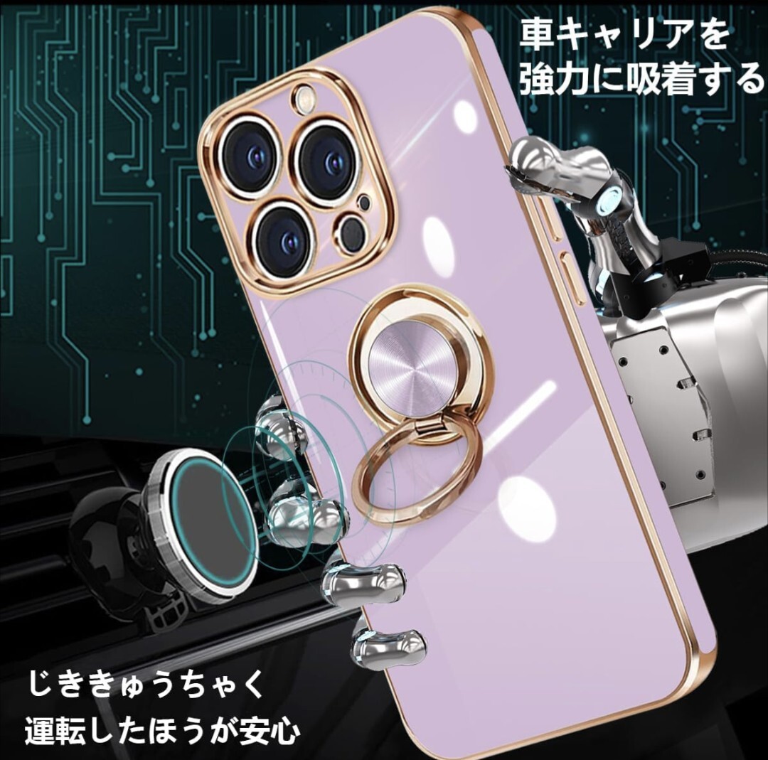 【車載スタンド対応&ストラップ穴付き】内部には金属が内蔵され、マグネット式車載スタンドに対応。*特別ヒント:リング部分は金属ですので、ワイヤレス充電できません。ケースの側面にはストラップホールを搭載しているので、お好きなストラップを付けられ、落下防止にも効果的です。