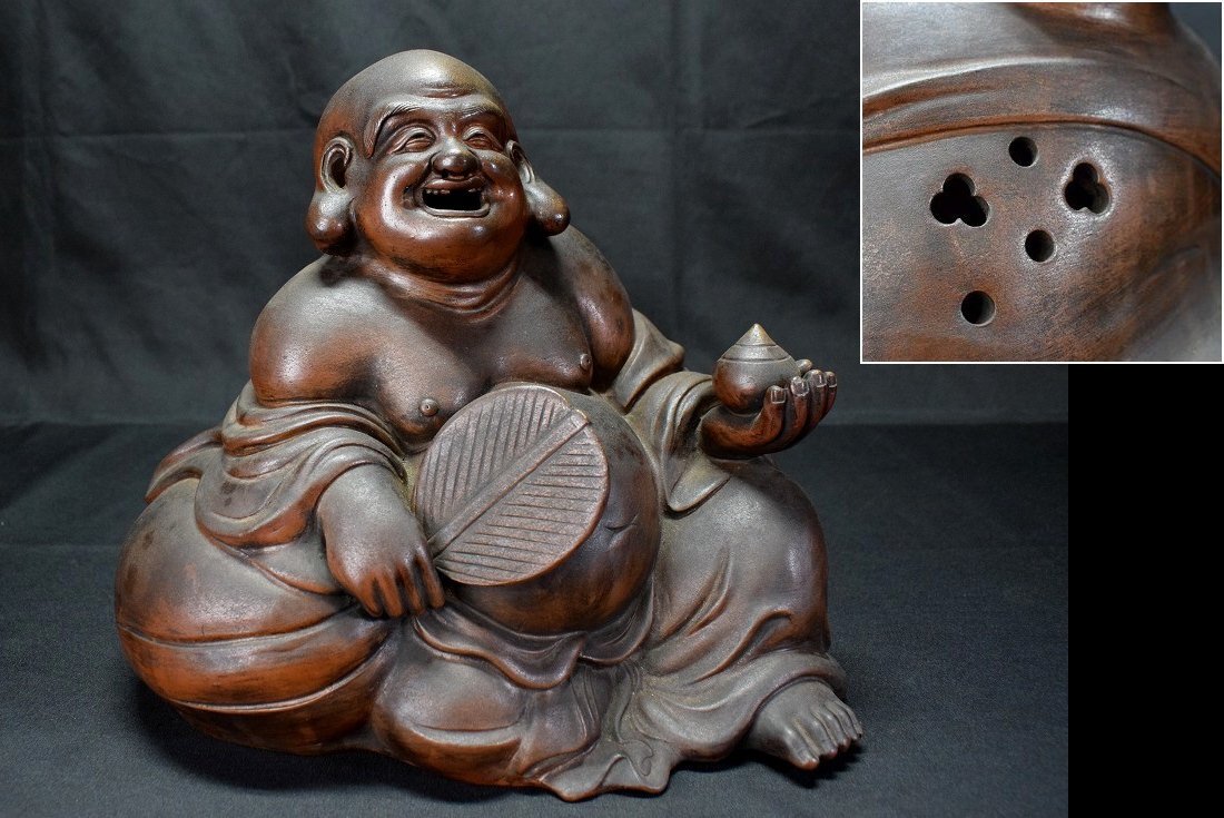 高さ 約24.5cm 横 約26cm 奥行 約20cm 古備前 時代 布袋 伏香炉 置物 床置 高24.5cm 横26cm 古美術品 割れ、欠けなく状態総じて良好。 詳しくは画像で御確認くださいませ。 (経年での汚れ、スレ、窯キズなどご了承くださいませ) |