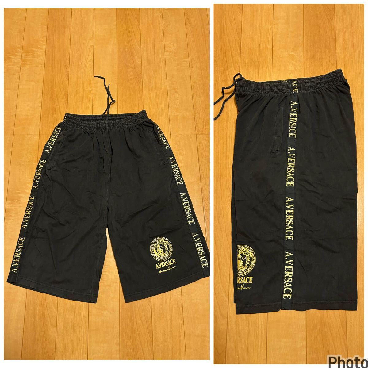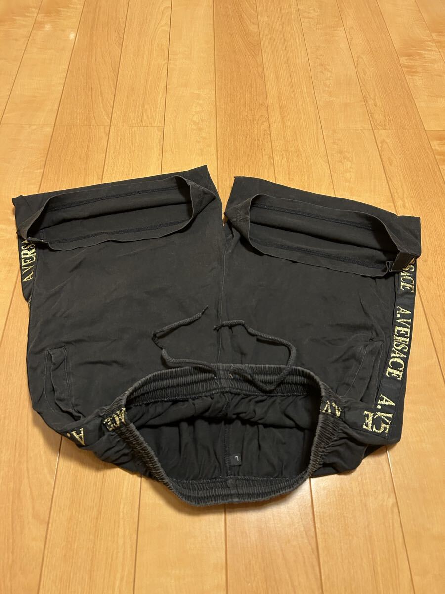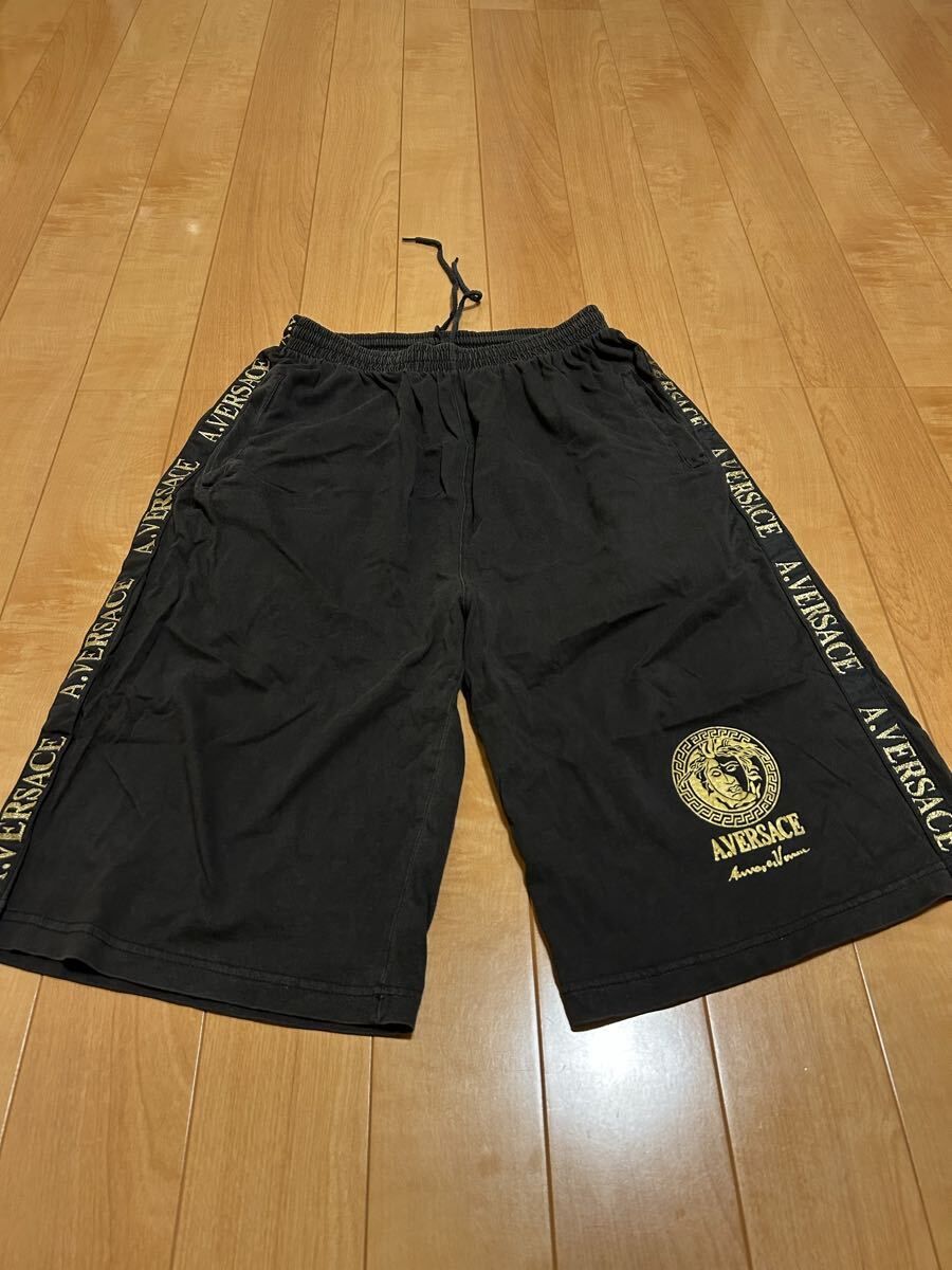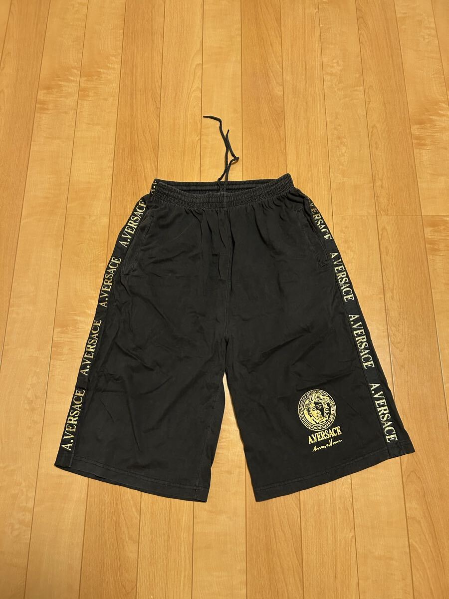 ☆90s-Y2K・AV/A.VERSACE メンズサイズL ブラックコットン.イージーハーフパンツ/ワイドボクサー型 メデューサ&サイドロゴライン入!黒