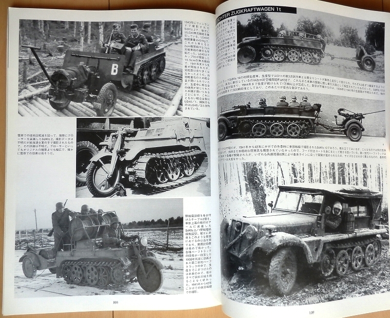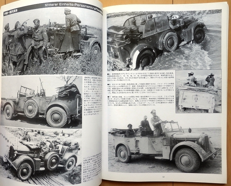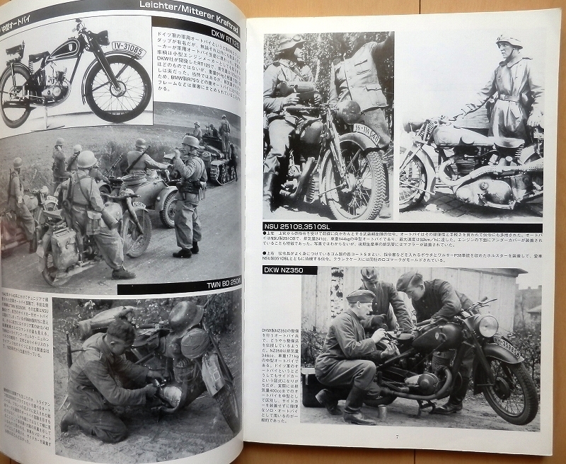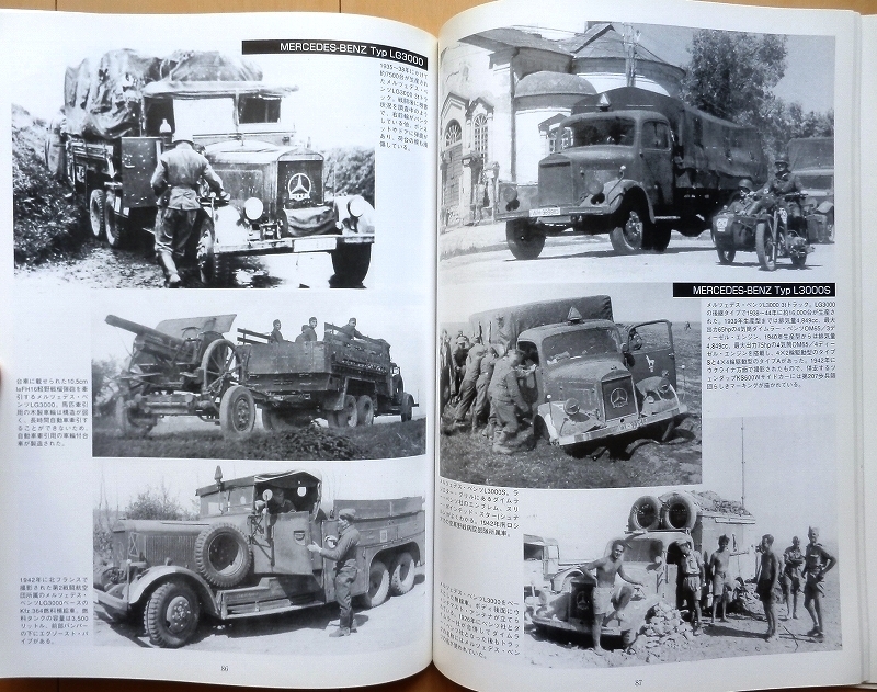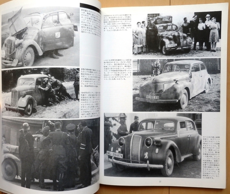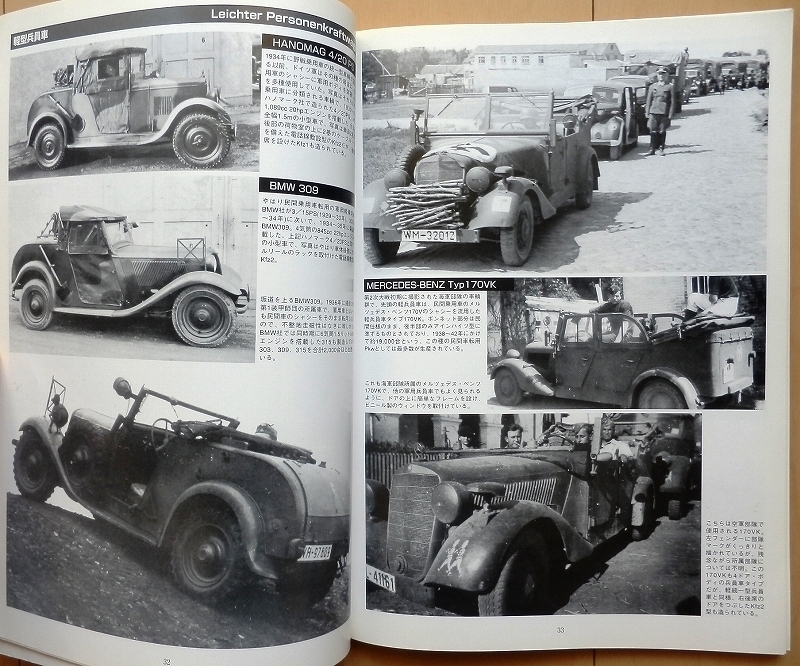 ドイツ軍で使用されたソフトスキン車輌を解説した資料写真集で、「オートバイ」「乗用車」「兵員車」等を掲載。