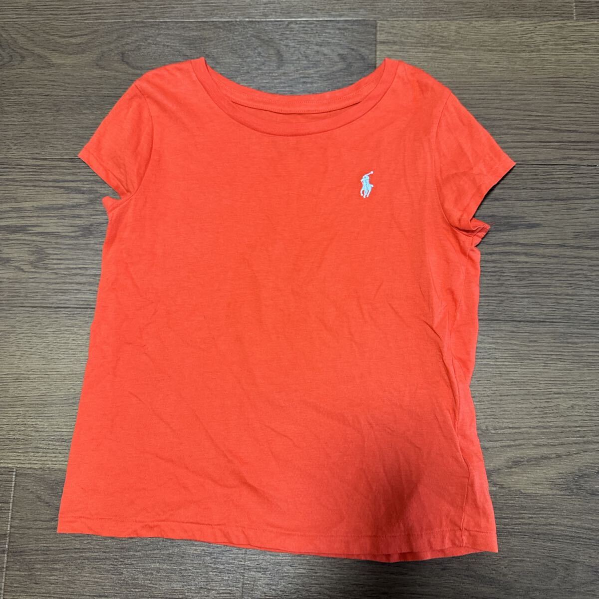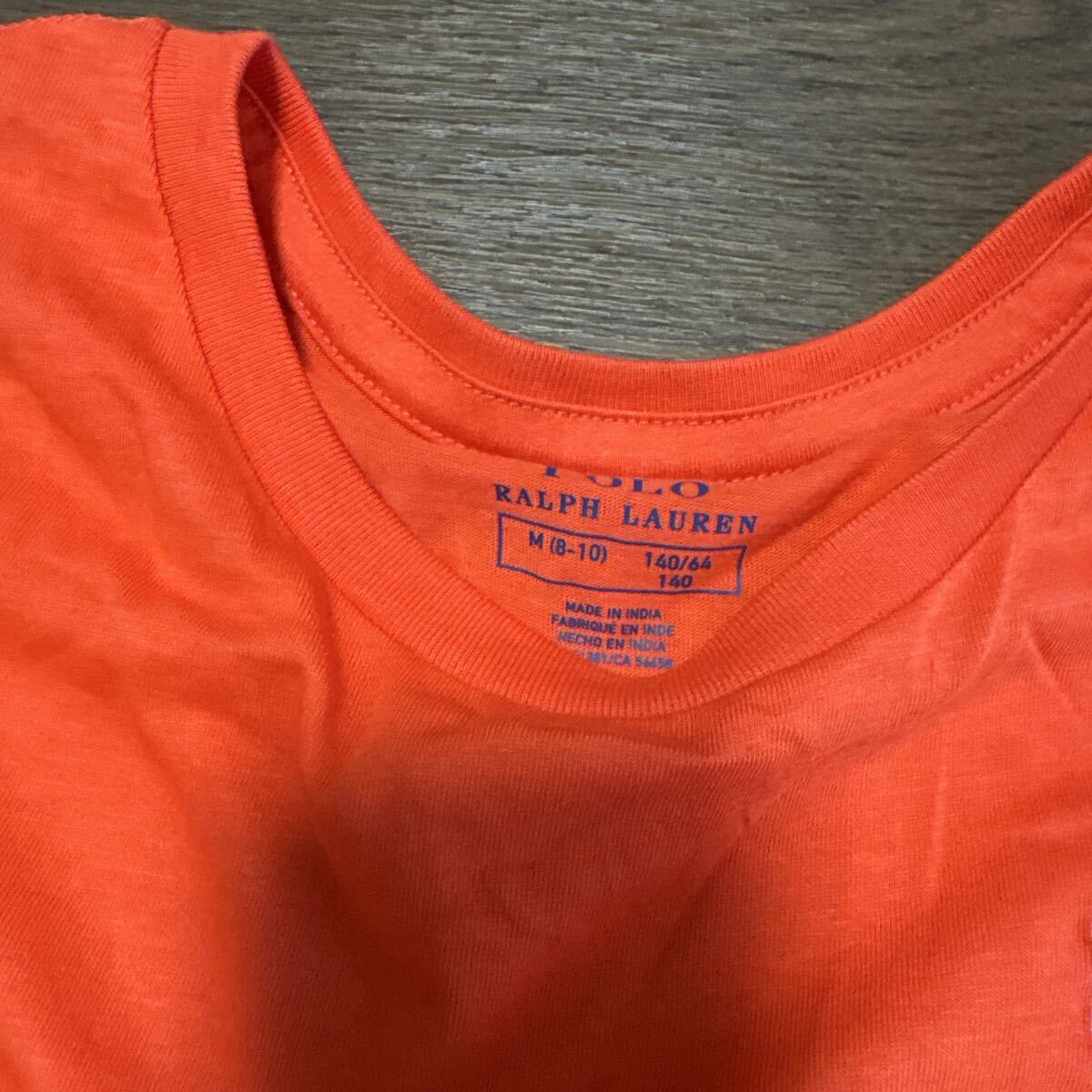 鮮やかなオレンジ色のPOLO Tシャツ、ポロの刺繍ロゴ付き。