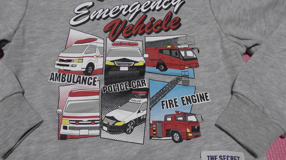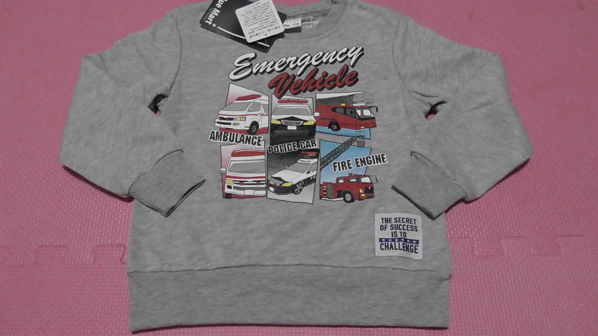 新品 110 働く車柄 長袖トレーナー グレー パトカー 消防車 救急車 警察 パトロールカー 緊急車両 兄弟 男の子 秋物 春物 100~ 送料無料