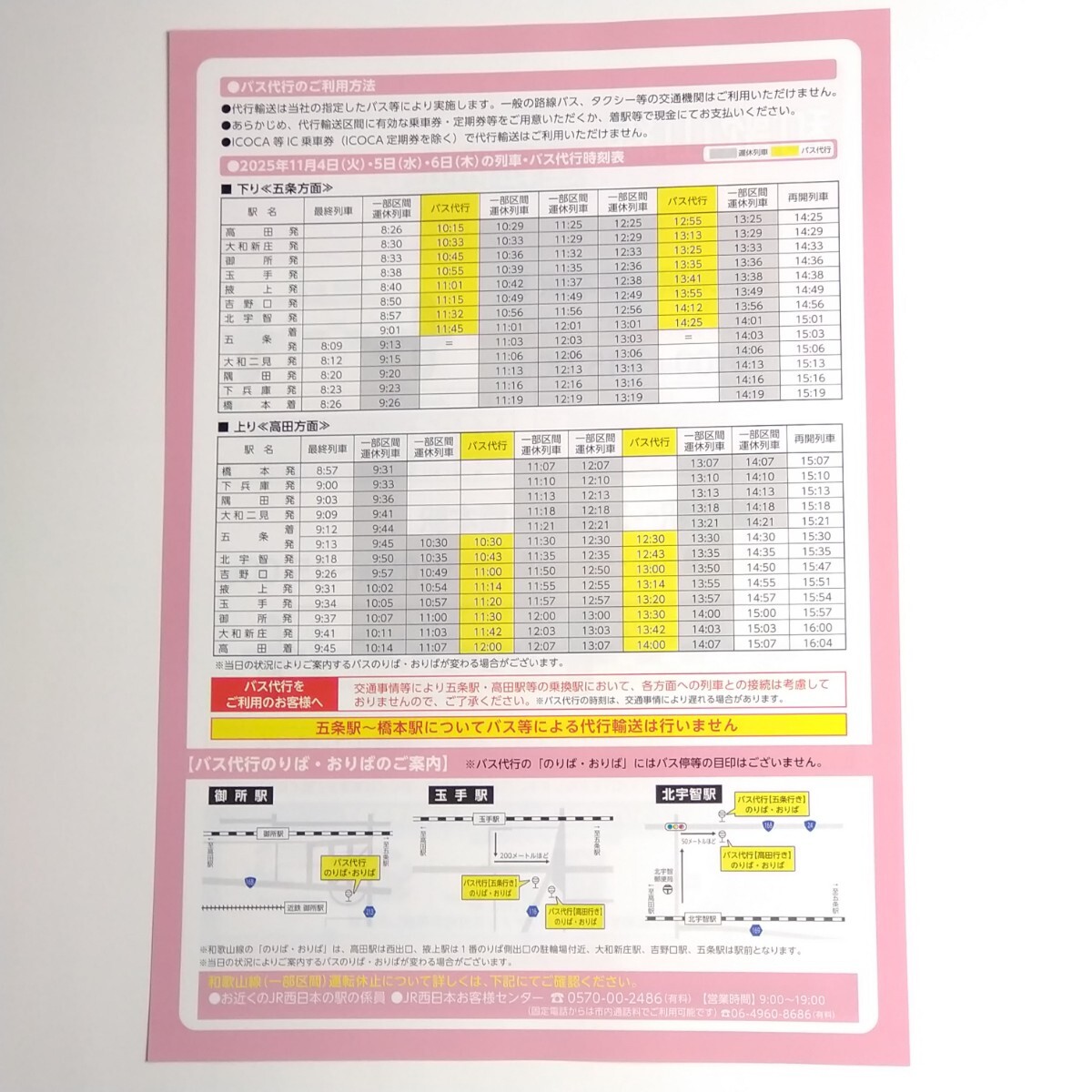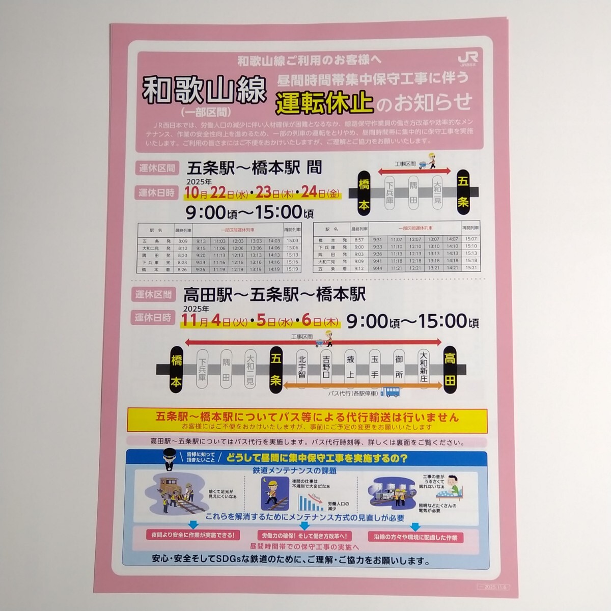 JR西日本和歌山線の運転休止のお知らせのパンフレットです。