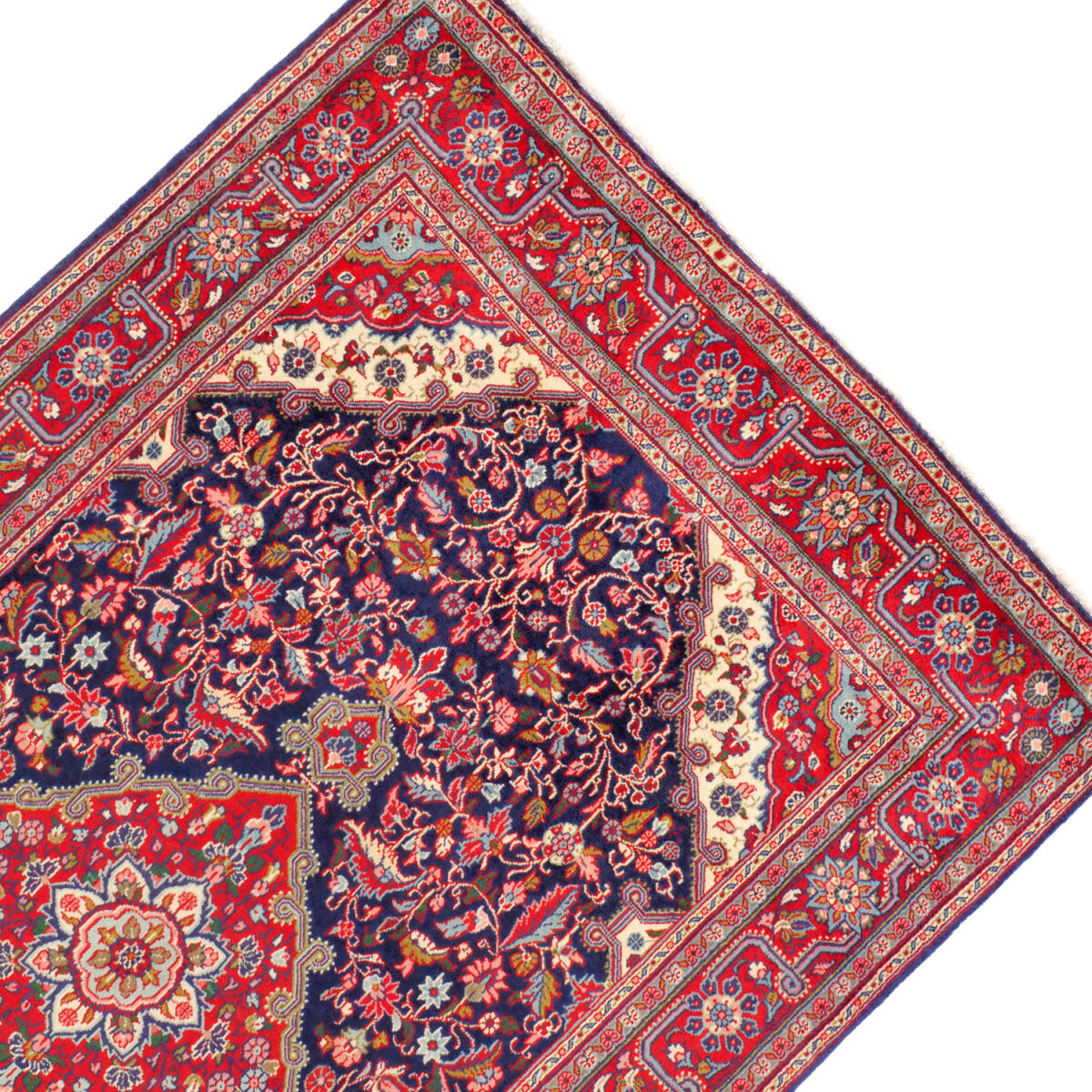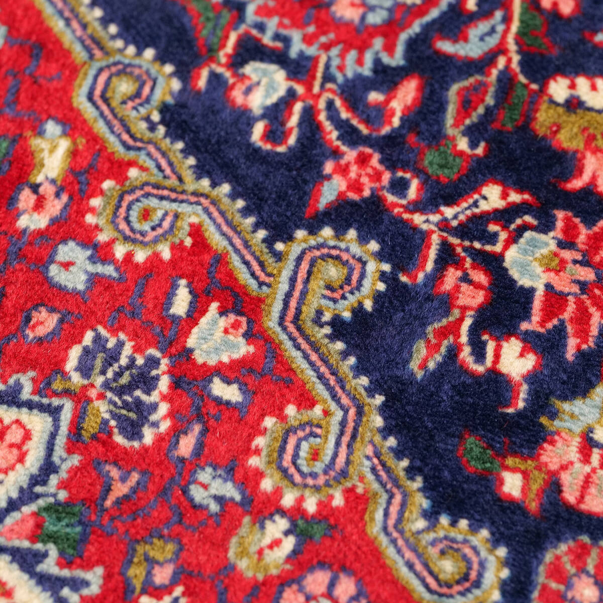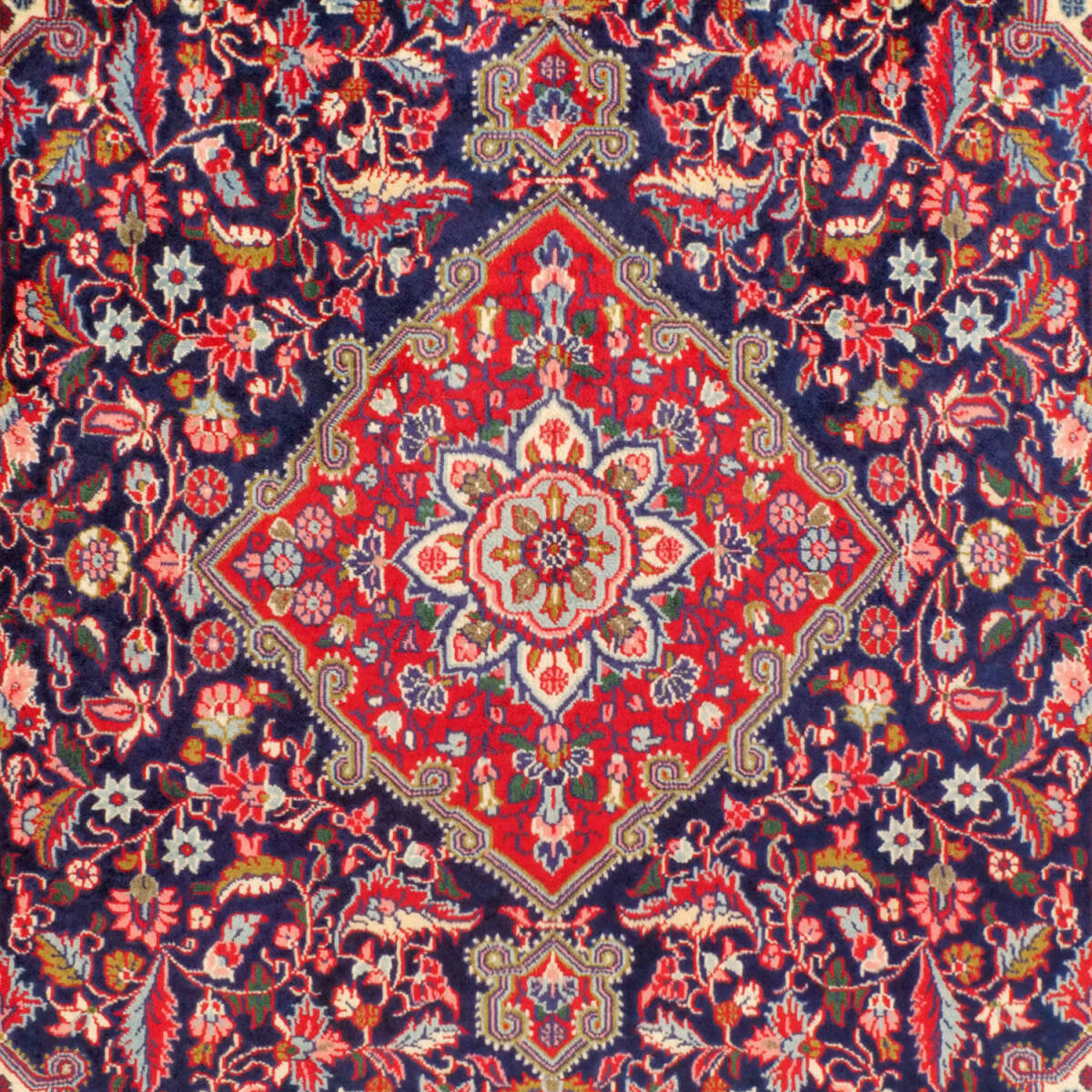 1960年代にハマダンで制作された、迫力ある色彩と伝統的な構図が特徴のセミアンティーク絨毯です。中央には菱形のメダリオンが大きく配され、赤と紺の力強いコントラストが視線を惹きつけます。周囲を彩る蔓草や花々の装飾は豊かで生き生きとしており、古典的な意匠ながらもどこか躍動感を感じさせる一枚です。