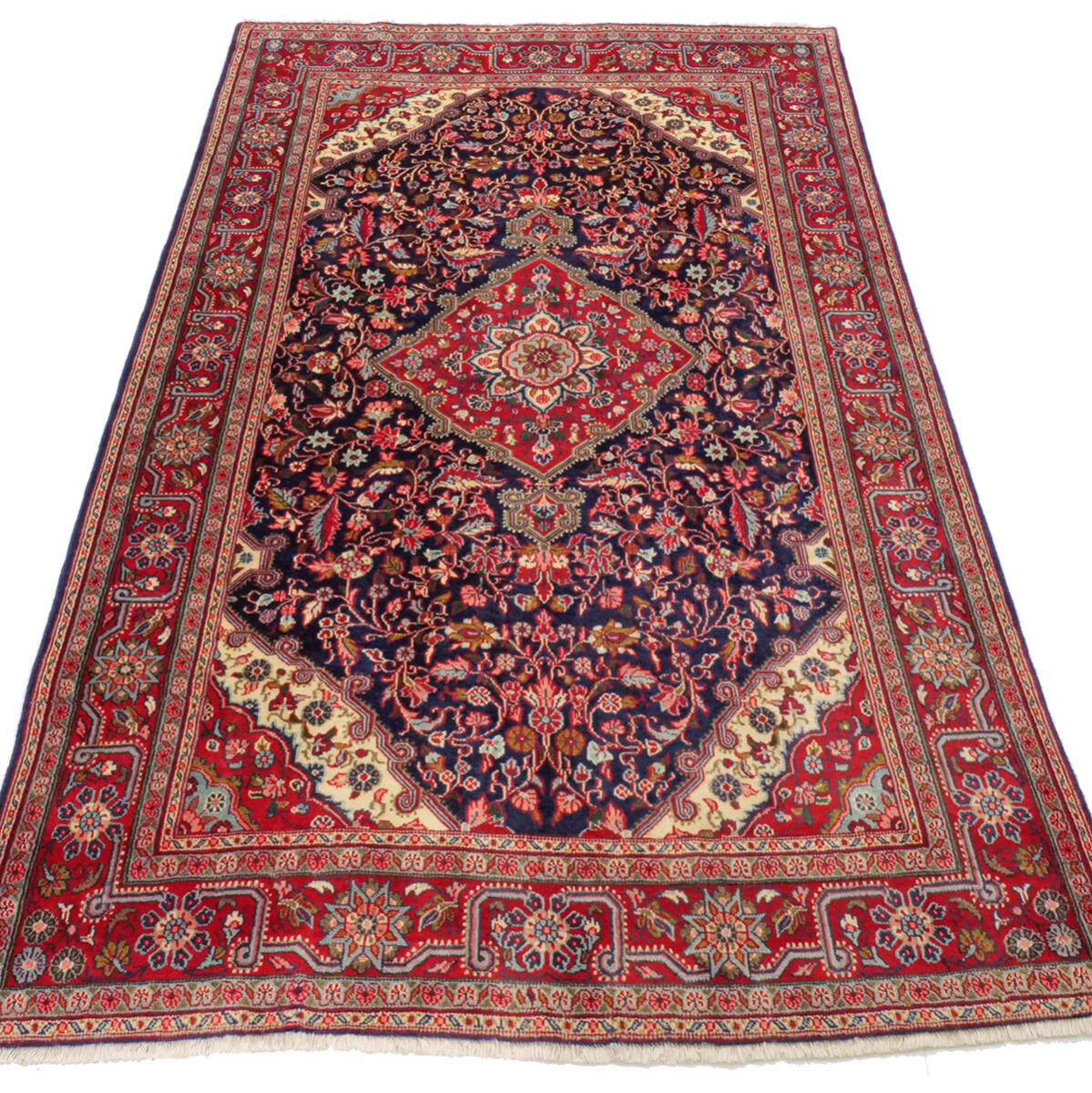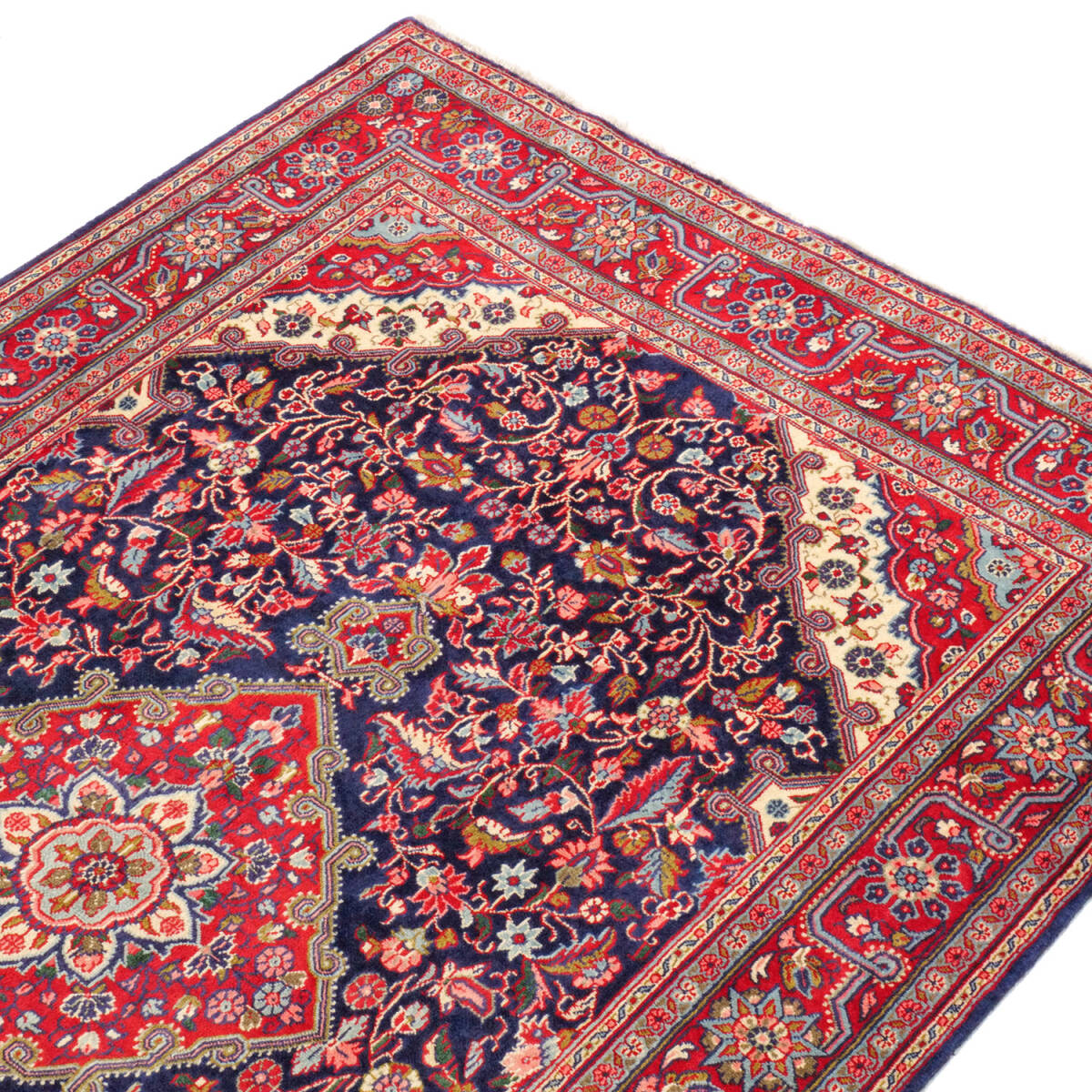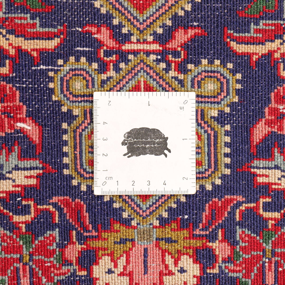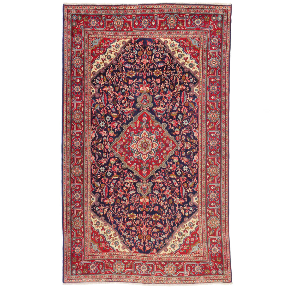1960年代にハマダンで制作された、迫力ある色彩と伝統的な構図が特徴のセミアンティーク絨毯です。中央には菱形のメダリオンが大きく配され、赤と紺の力強いコントラストが視線を惹きつけます。周囲を彩る蔓草や花々の装飾は豊かで生き生きとしており、古典的な意匠ながらもどこか躍動感を感じさせる一枚です。
