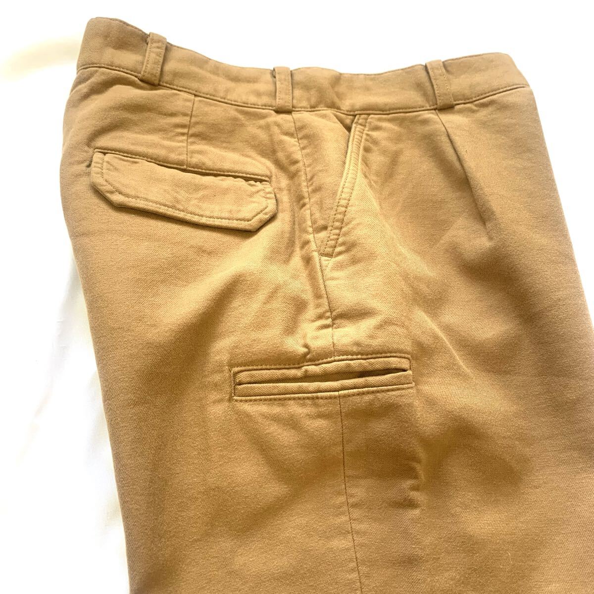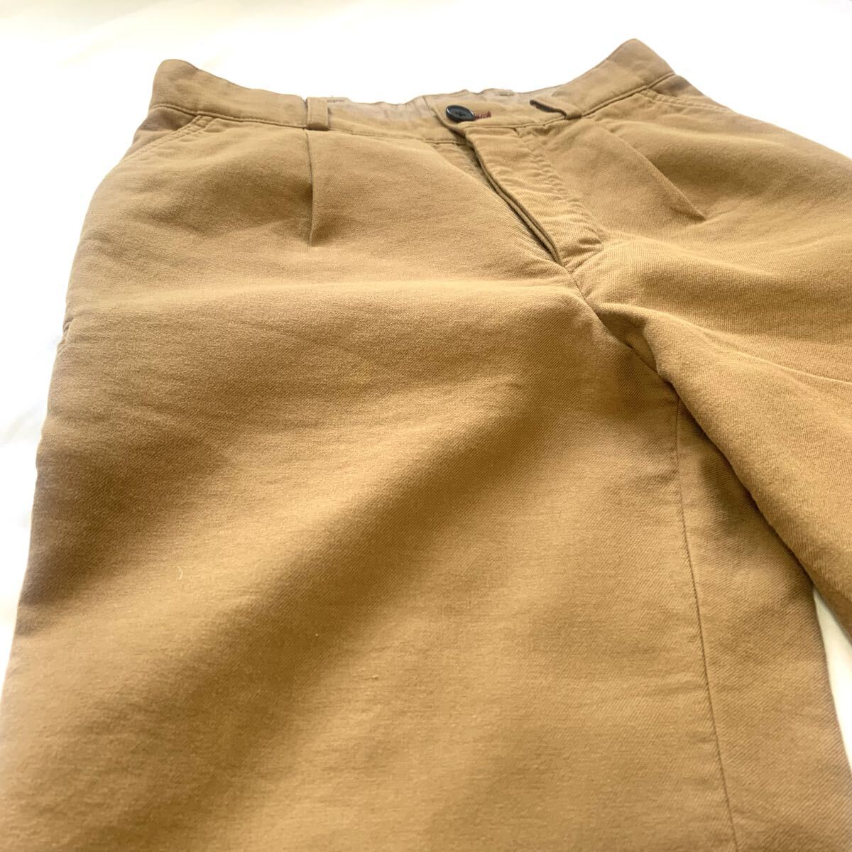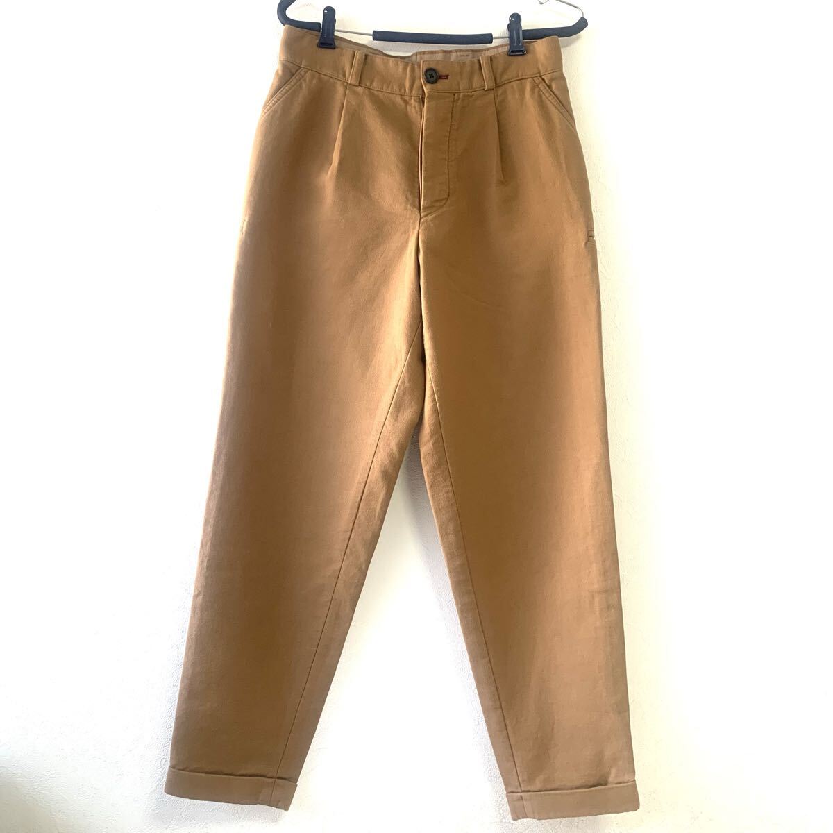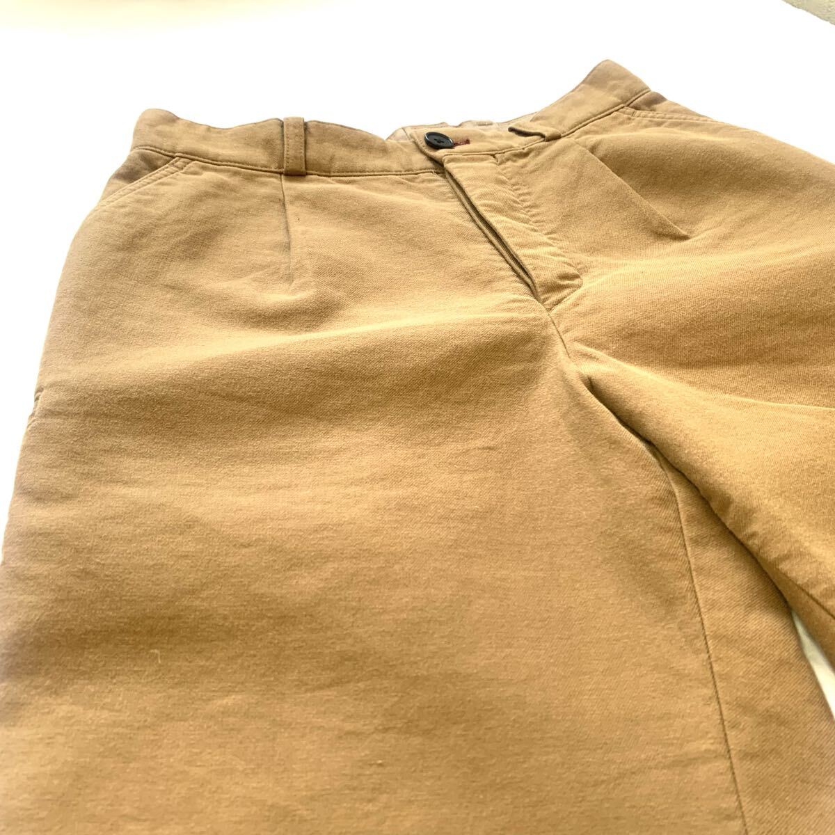 ■肉厚でしっかりした生地感のポールスミスのパンツです。デニムやコットンツイルのようにハリがある感じではなく、柔らかめの素材感で肌への当たりはやさしいです。タックが入り腰周りはゆったりしていますがきつめのテーパーがかかっていて独特の綺麗なシルエットを作るあたりはさすがにポールスミスと思います。サイドに小さなポケットが付きますが、物を入れる為というよりはシルエットを作るのに貢献しているようです。