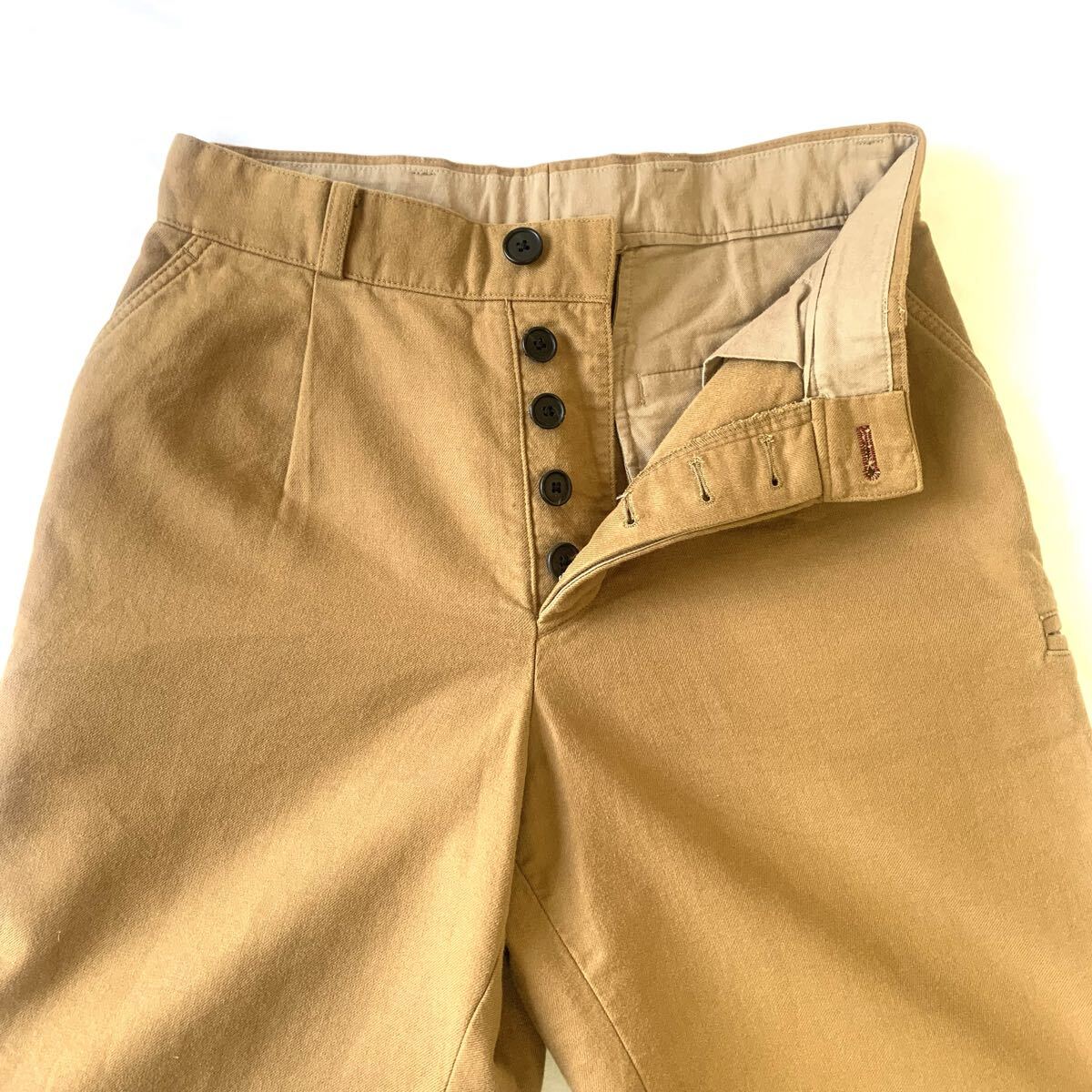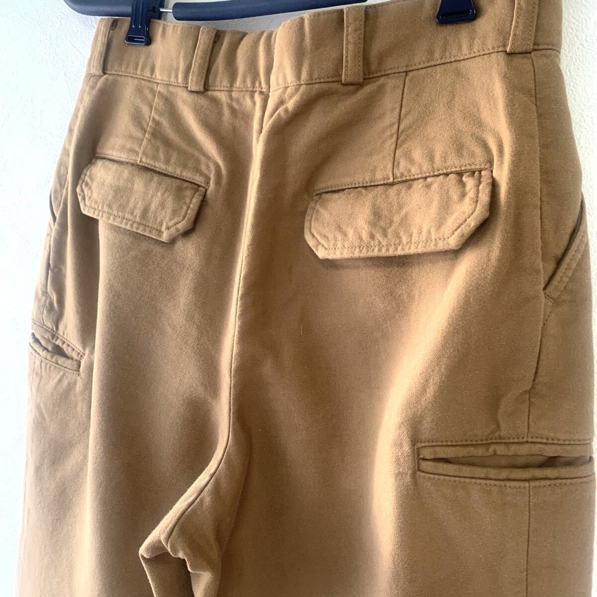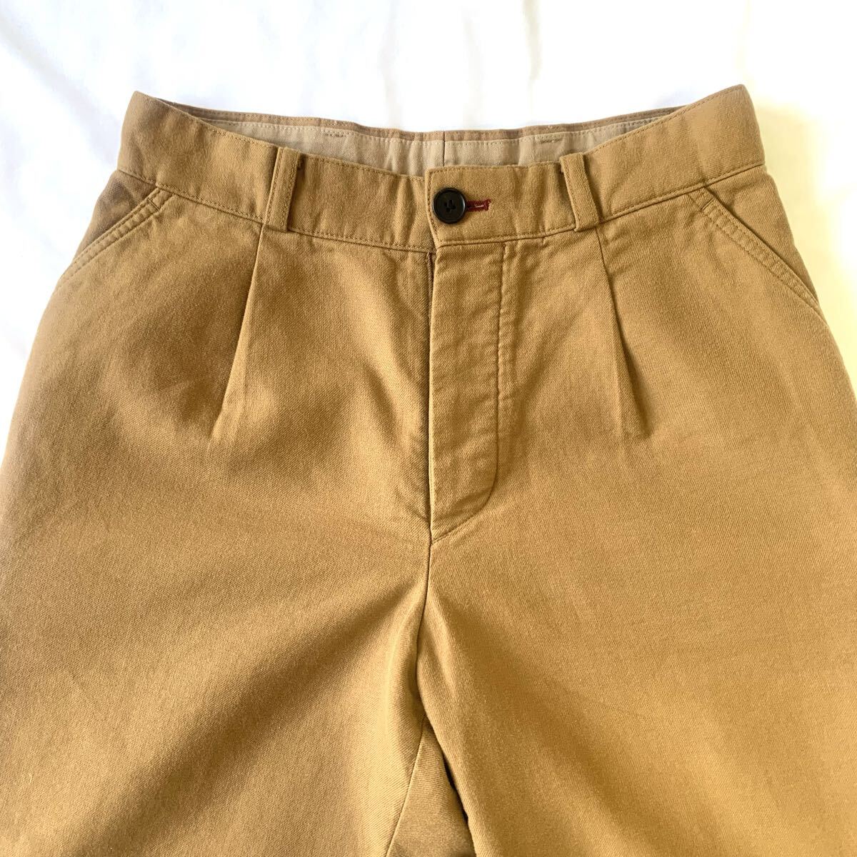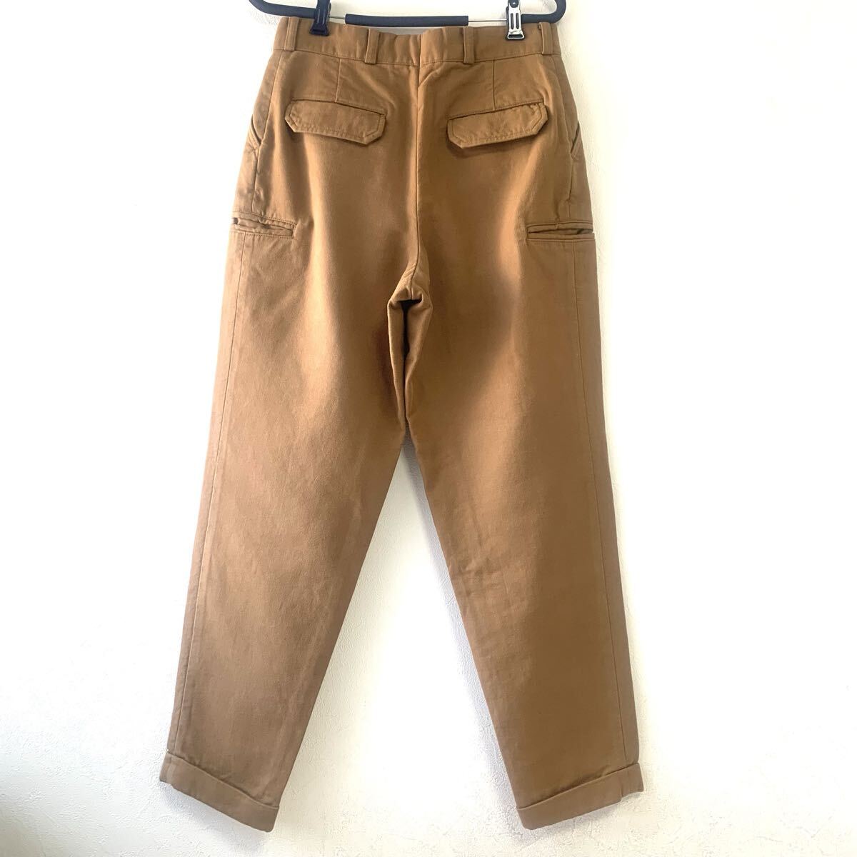 ■肉厚でしっかりした生地感のポールスミスのパンツです。デニムやコットンツイルのようにハリがある感じではなく、柔らかめの素材感で肌への当たりはやさしいです。タックが入り腰周りはゆったりしていますがきつめのテーパーがかかっていて独特の綺麗なシルエットを作るあたりはさすがにポールスミスと思います。サイドに小さなポケットが付きますが、物を入れる為というよりはシルエットを作るのに貢献しているようです。