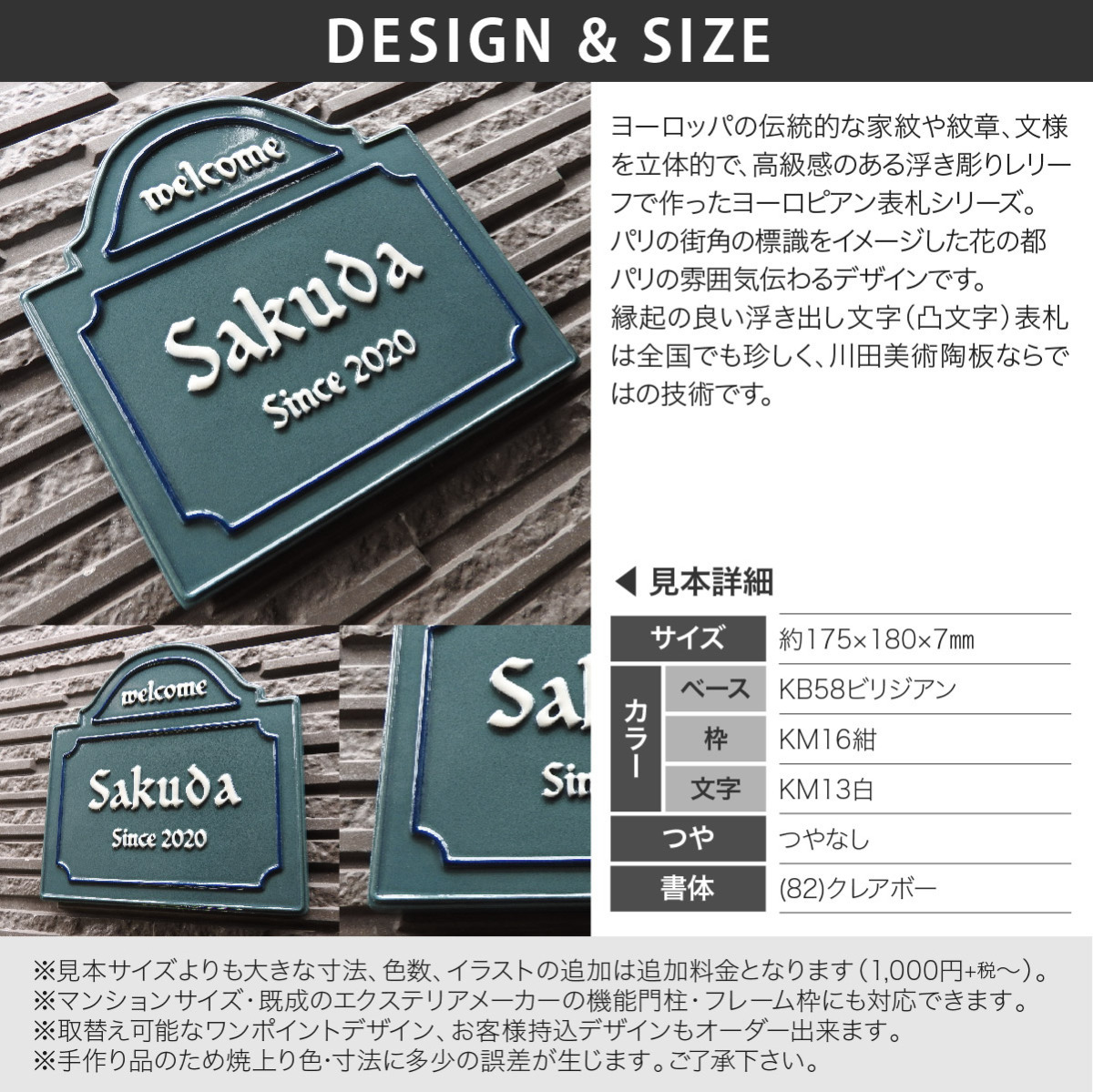 | 商品詳細 | ヨーロッパの伝統的な家紋や紋章、文様を立体的で、高級感のある浮き彫りレリーフで作ったヨーロピアン表札シリーズ。パリの街並みに溶け込むような旅情を誘うデザインです。縁起の良い浮き出し文字(凸文字)表札は全国でも珍しく、川田美術陶板ならではの技術です。 |
