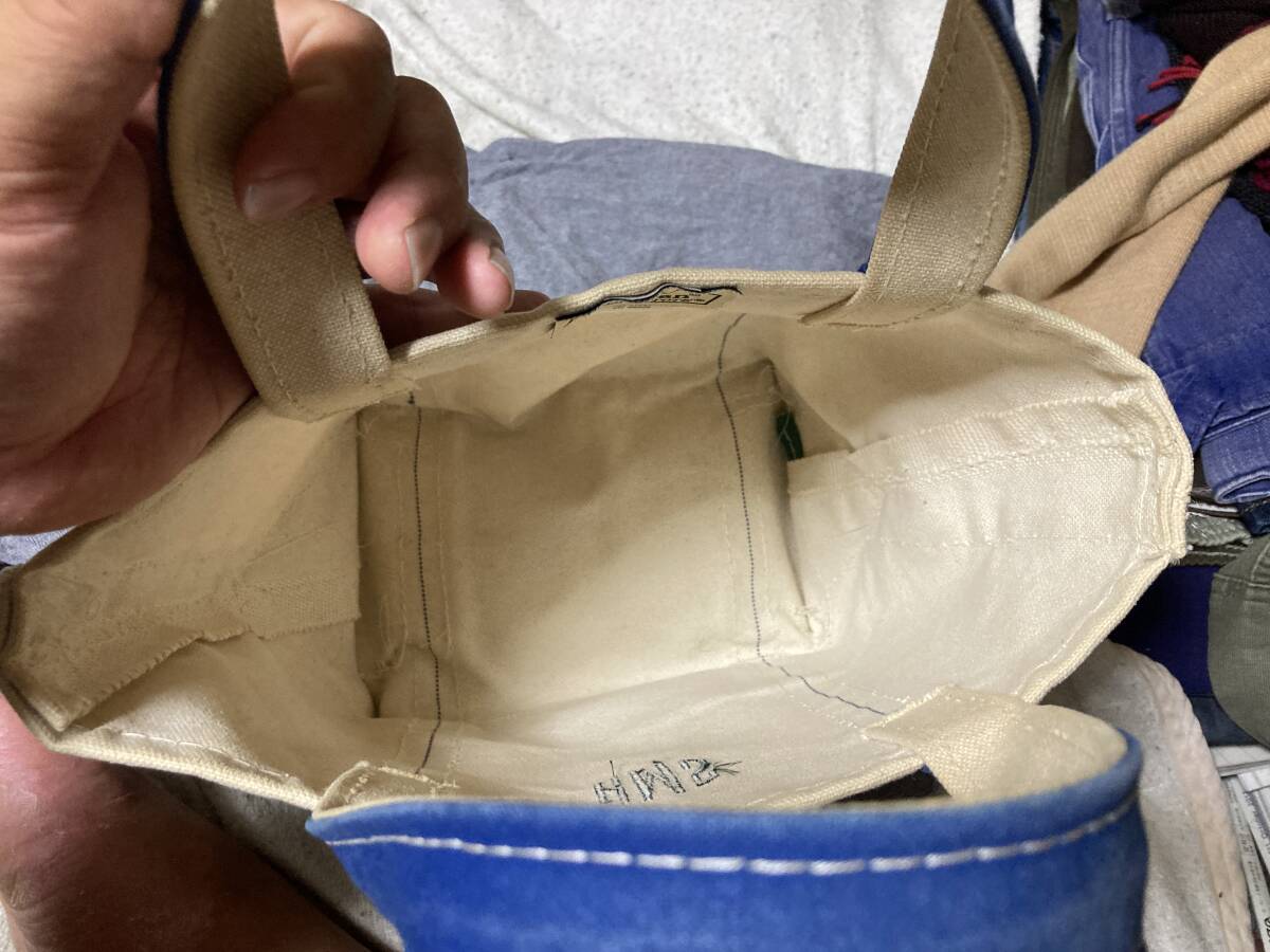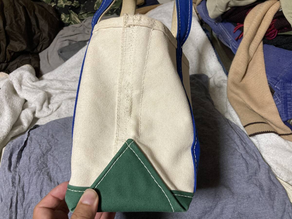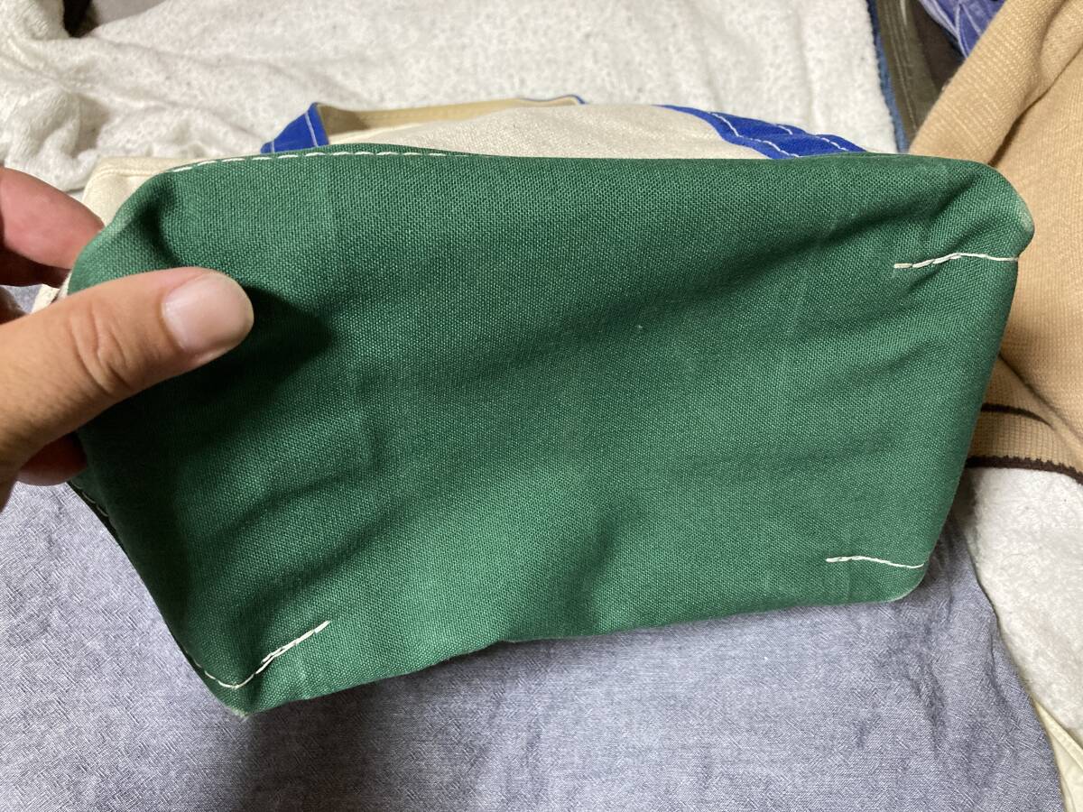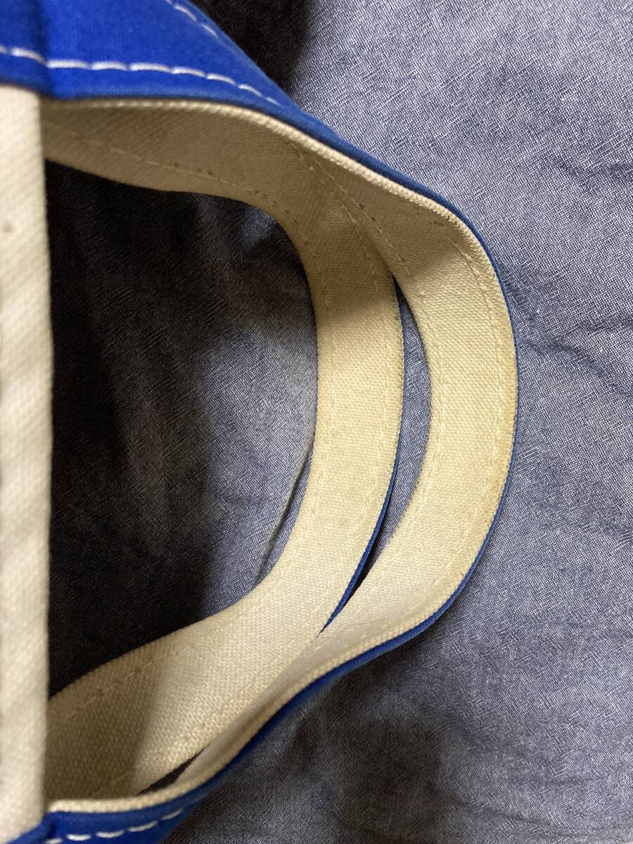 生成りベースに持ち手がロイヤルブルー、底部分がダークグリーンの切り替えになります。