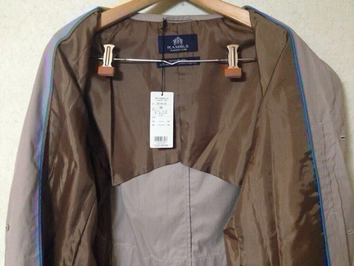 ・商品名 : ハーフコート・ブランド : RAMBLE ・ 色柄 : 無地のベージュ・サイズ : LLですがスリムタイプのため,L用で十分着用できます。 身丈 87 ・ チェスト 98~108 ・ 肩幅 46 ・ 袖丈 65 身長 175~185・素材 : 表地 ナイロン 100% ・ 裏地 ポリエステル 100% **** 未使用品 非常に軽い。460G