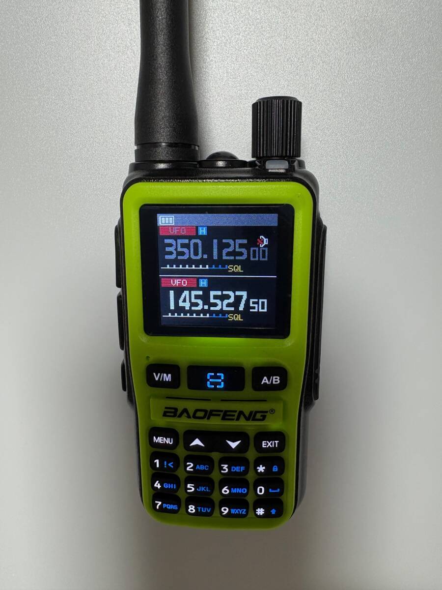未使用、工場出荷状態、約38cm広帯域ロングアンテナ同梱。エアーバンドを含むワイドバンドレシーバー機能や10キーボード付きで老舗BAOFENG社最小クラスのデュアルバンドトランシーバーです。
