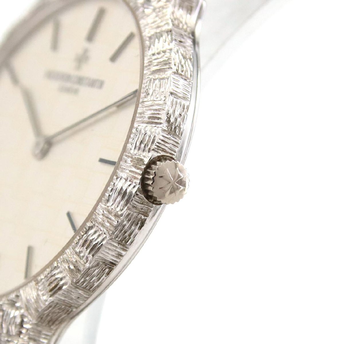 ヴァシュロン・コンスタンタンが製造した、独創的なテクスチャーが目を引く手巻きモデルです。モデル名の「メッシュドール」が示す通り、ケースからブレスレットにかけて、網目状の緻密な彫金装飾が施されており、まるで織物のようなユニークな質感を表現しています。文字盤にも同様のパターンが刻まれ、全体に統一感を持たせています。時分針のみを備えたシンプルなデザインが、素材と技巧の美しさを最大限に引き立てており、メゾンが誇る卓越したクラフツマンシップを堪能できる一本。芸術性の高いドレスウォッチをお探しの方におすすめです。