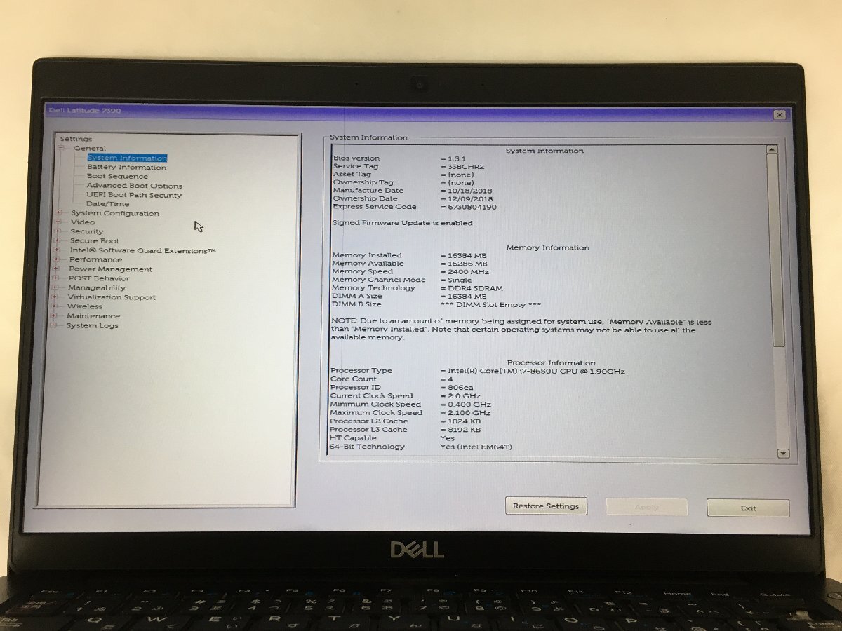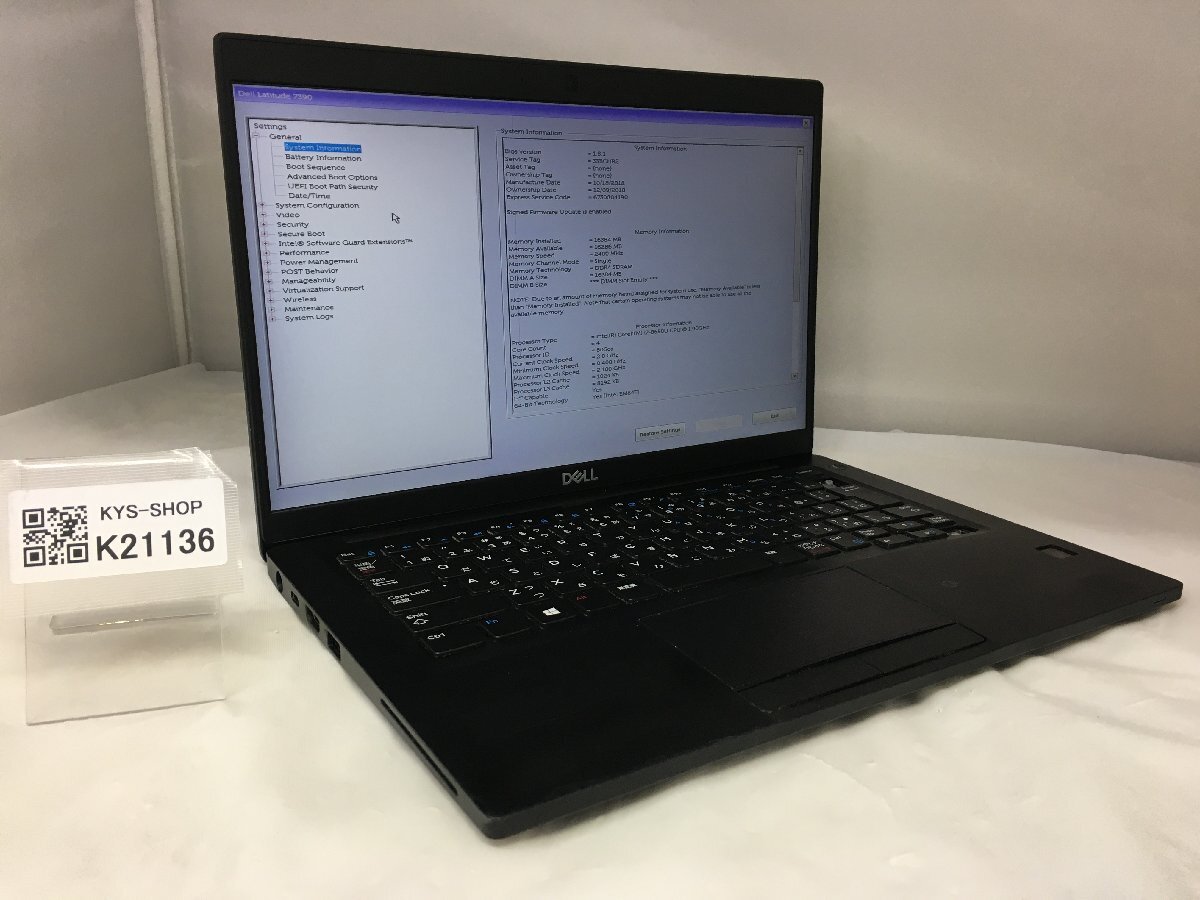 ジャンク/DELL Latitude 7390/Core i7 8650U 1.90GHz/512GB/16GB/13.3インチ/高速SSD/大容量メモリ/高解像度/第8世代/AC欠品【K21136】