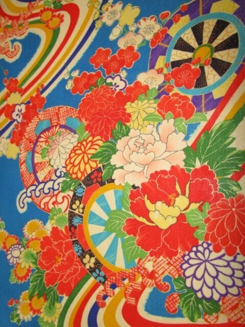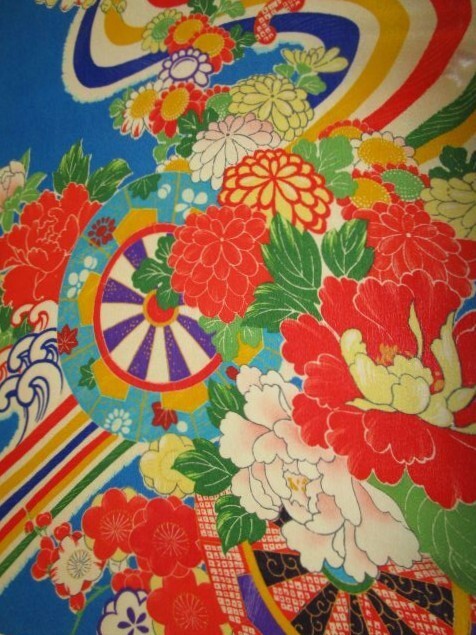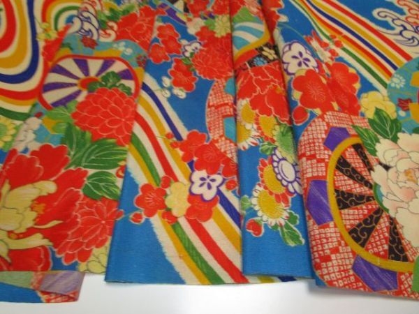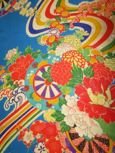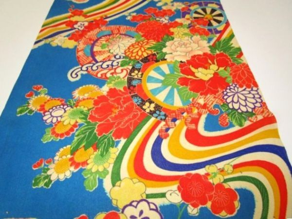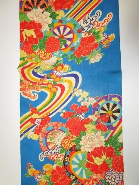 F-29★青地*花車*白波*牡丹*ダリア*菊*梅*正絹*古布はぎれ★市松人形/一閑張り/文化人形