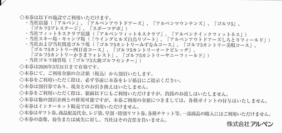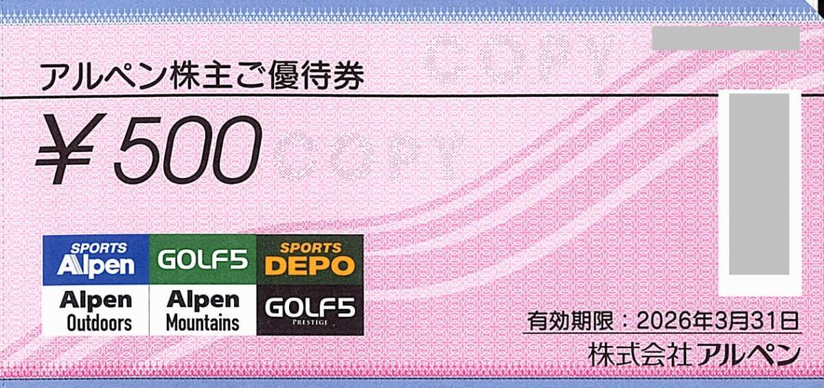 有効期限は「2026年3月31日」です。 「アルペン」、「アルペンアウトドアーズ」、「アルペンマウンテンズ」、「ゴルフ5」、「ゴルフ5プレステージ」、「スポーツデポ」などでご利用いただけます。 ※詳細につきましては、画像やホームページの株主優待をご覧ください。 |