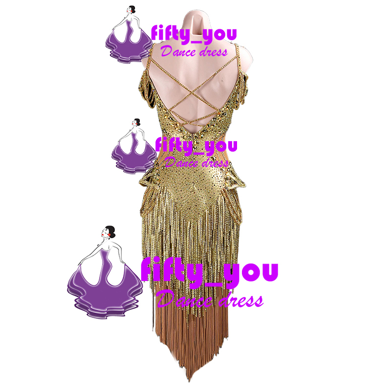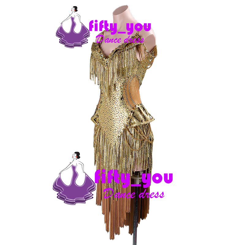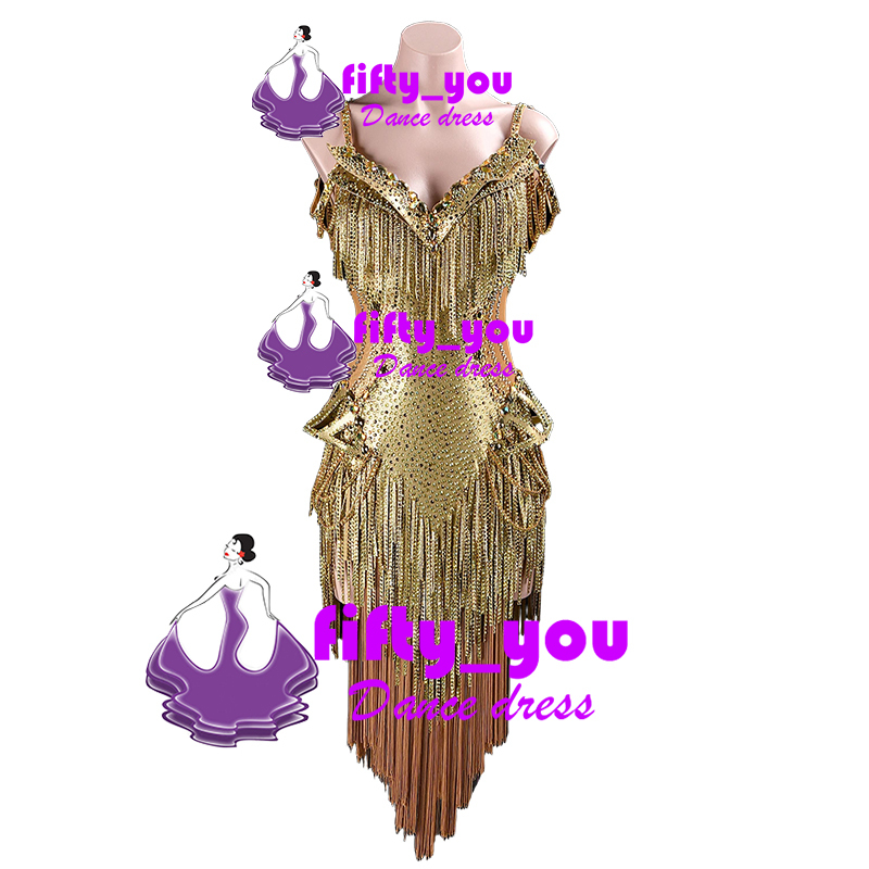 新品fifty_you レディース社交ダンスドレス  ラテン競技用ドレス 魅力のセミオーダー ビーズフリンジ飾り ゴージャスゴールド