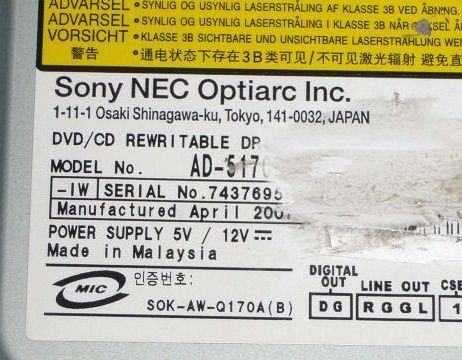 5インチ用のドライブベイにはSONY NEC OptiarcDVDドライブ(IDEインターフェースで、AD-5170の記載あり)を装着してあります。