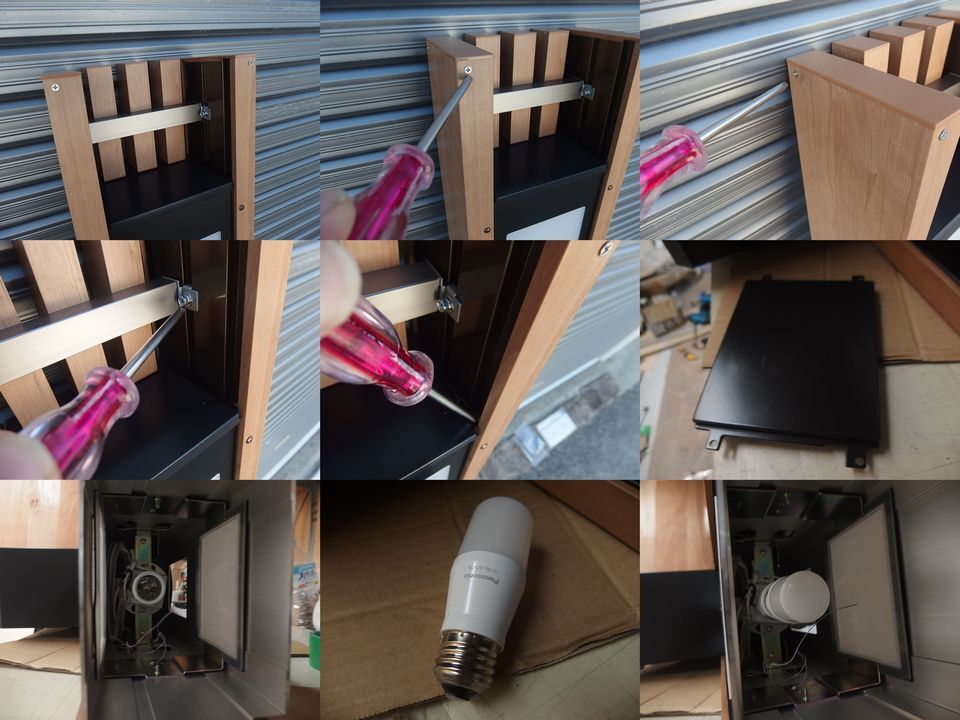 9枚目の画像で、面倒ですが、支柱上部のキャップをビス2本で外して、さらに、上部のでデザインパネルをねじを緩めて、外します。