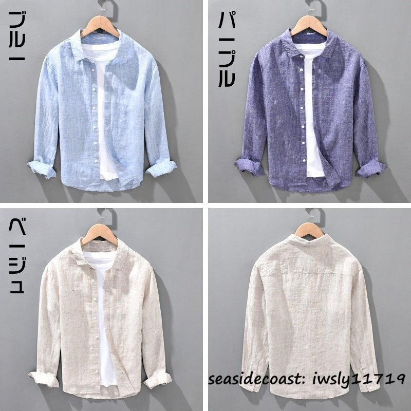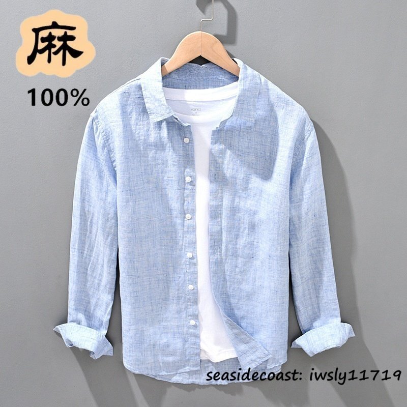 超美品■リネンシャツ メンズ 麻100% 無地 清涼感 長袖シャツ メンズシャツ カジュアルシャツ 心地良し スリム 通気性 春夏秋 ブルー XL