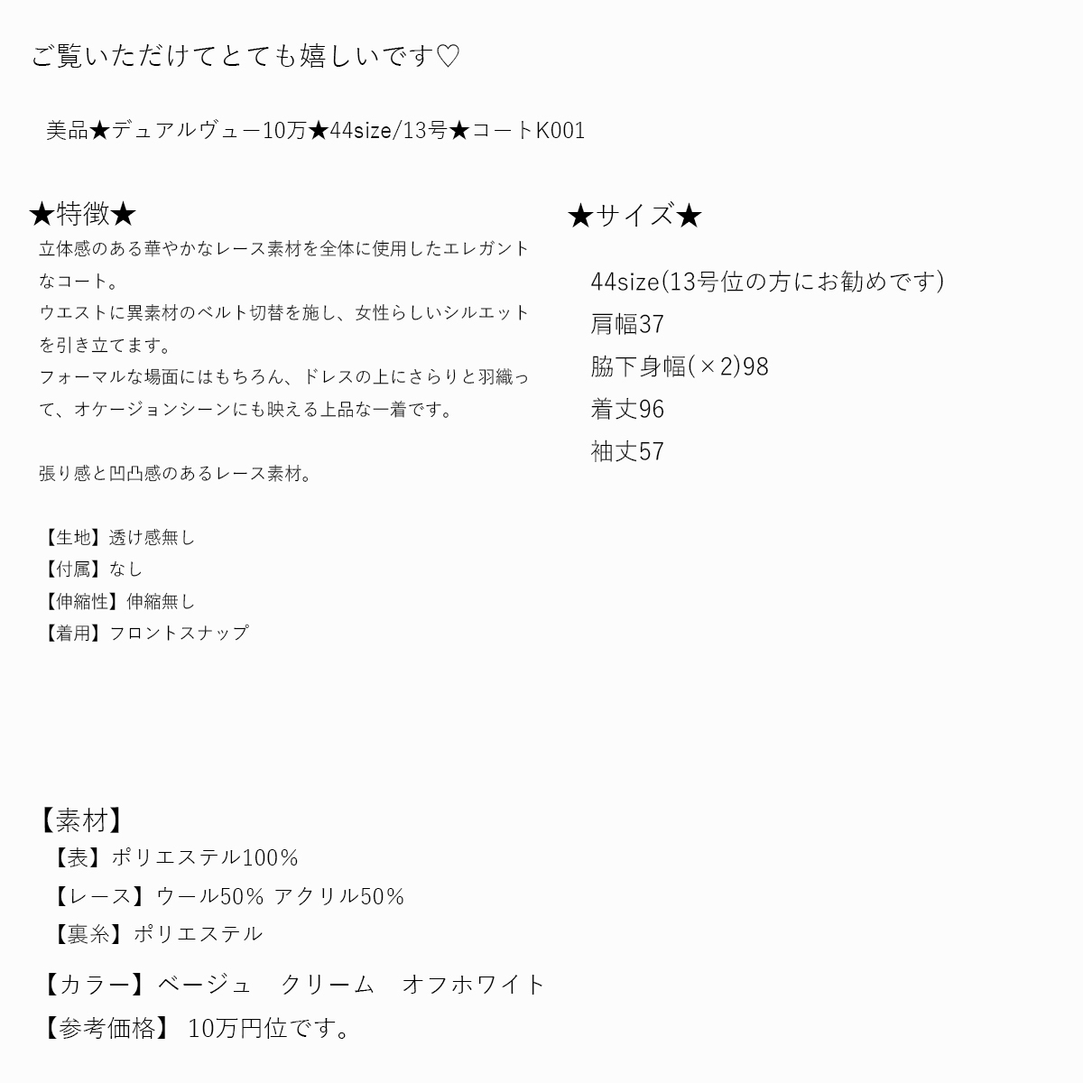 美品★素敵259★デュアルヴュー10万★44size/13号★コートK001