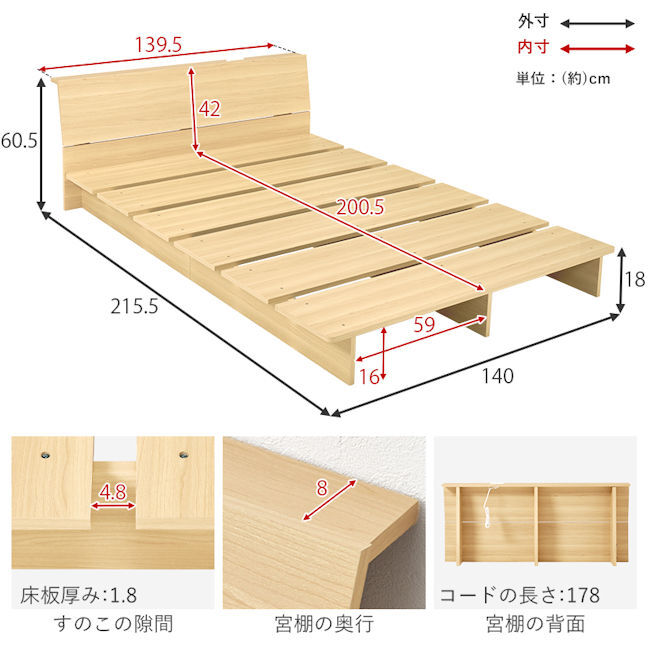 ヘッドボード内寸:(約)幅139.5x奥行8x高さ42cm。コード長さ:約178cm