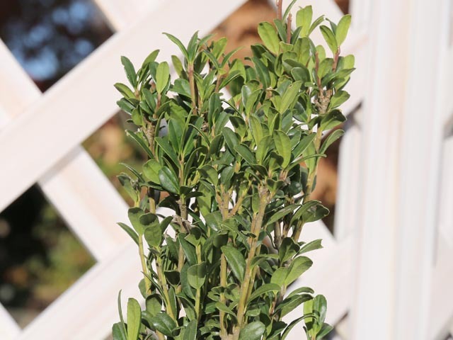 スカイペンシルはモチノキ科のイヌツゲの仲間です。枝がすべて上を向いて伸びますので樹形が引き締まっています。葉はイヌツゲと同じ小さく光沢がある葉です。一年中葉が落ちません。あまり伸びず、枝が暴れたりしませんので剪定の必要がありません。非常に手間が掛からない品種です。初夏に小さい白い花を咲かせ黒い小さい実がなります。日陰にもよく耐えますので植える場所を選びません。