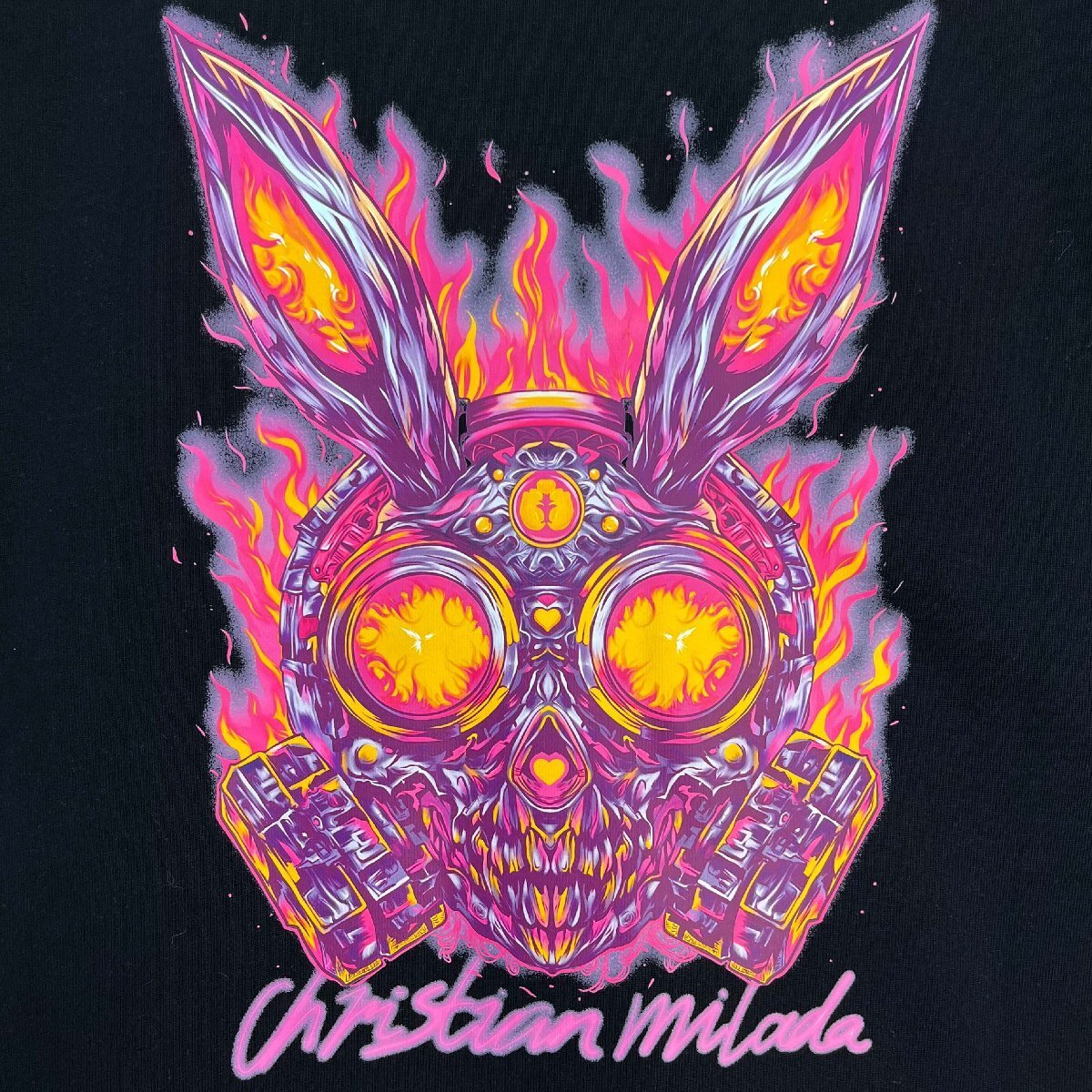 デザイン面では、シンプルな無地のフロントに対し、背面に大胆なサイズで施されたラビットモチーフが目を引きます。程よく個性を演出しつつも、派手すぎず、着る人のスタイルに自然に馴染みます。