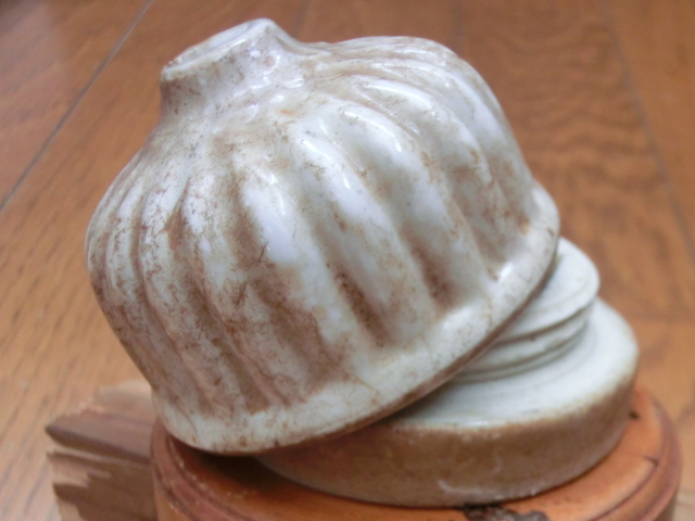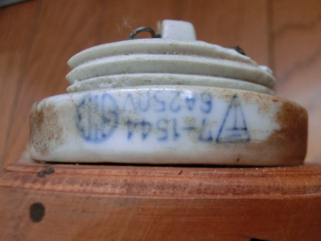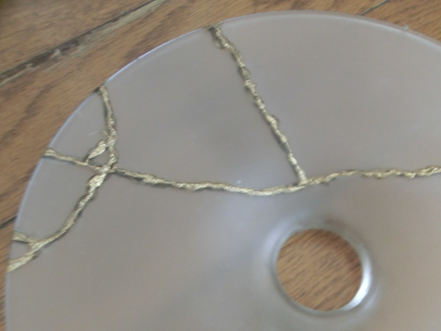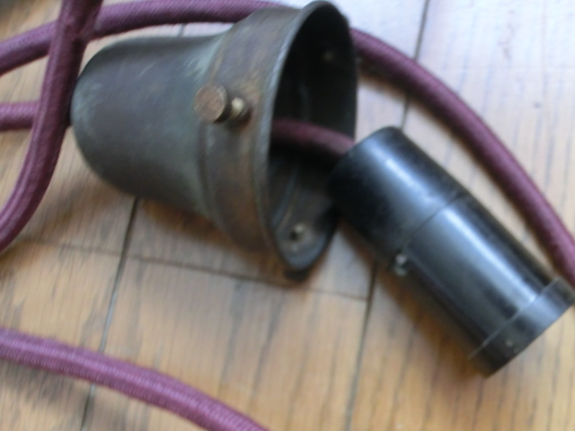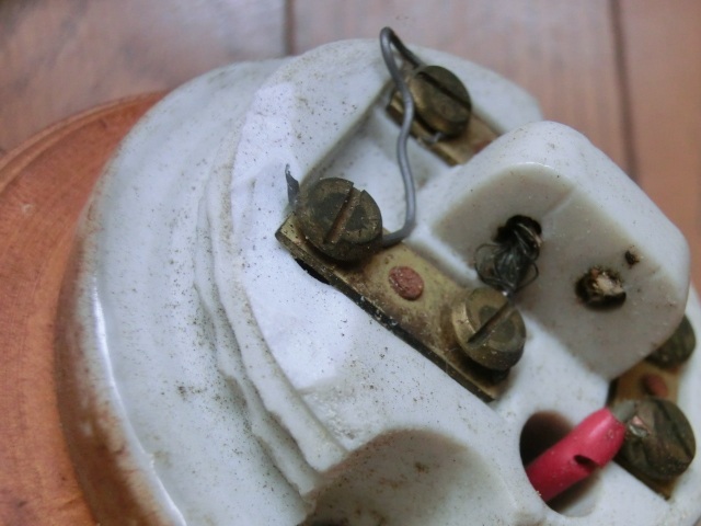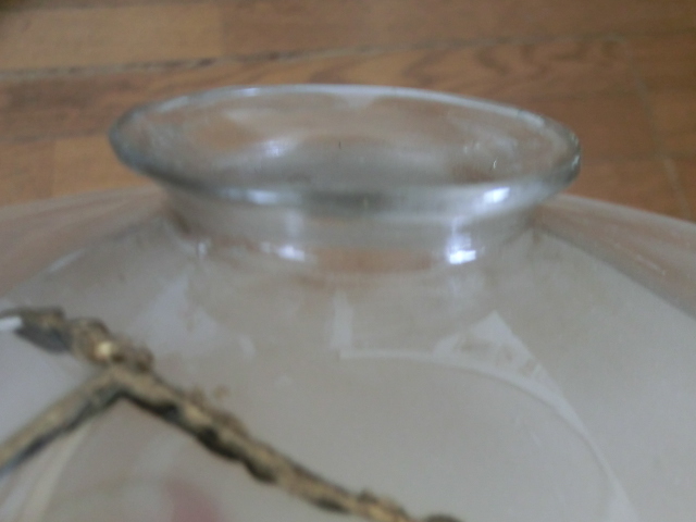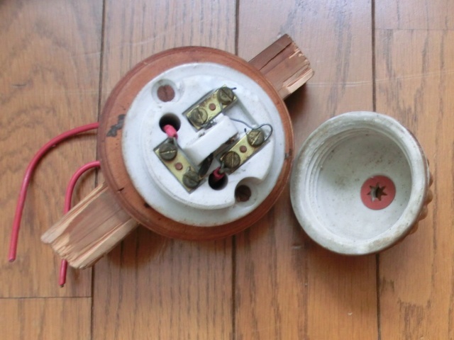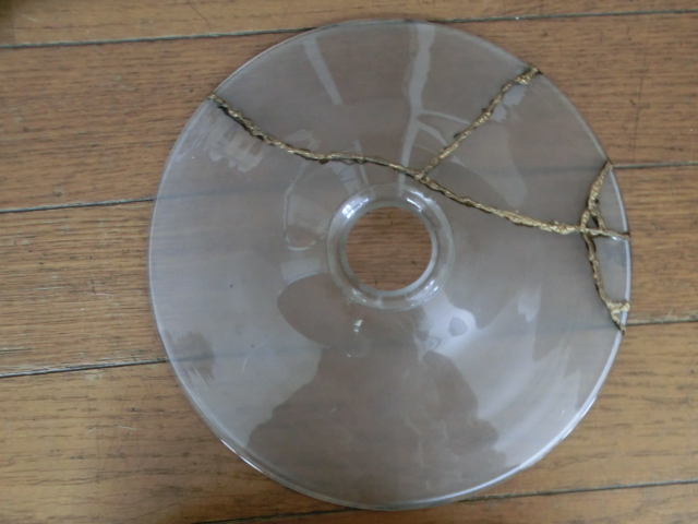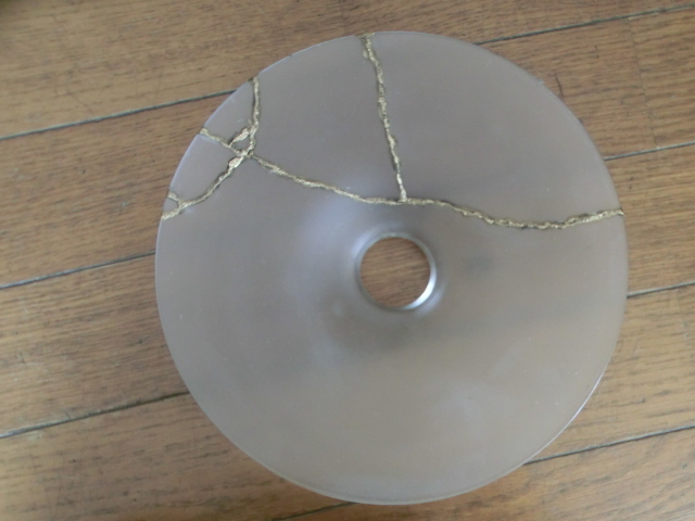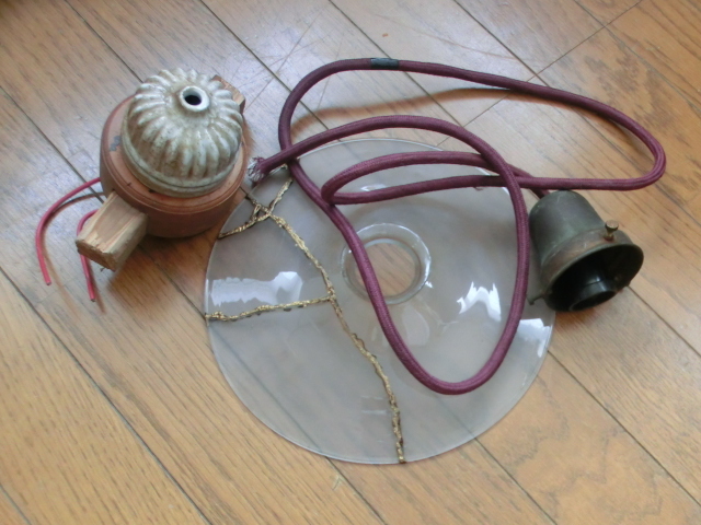 ご覧のような電傘3点セットです。①摺りガラスの傘、②ソケット及び取付金具、②陶製シーリングカバーです。傘は珍しい摺りガラス製ですが、割れて金継直しがされています。