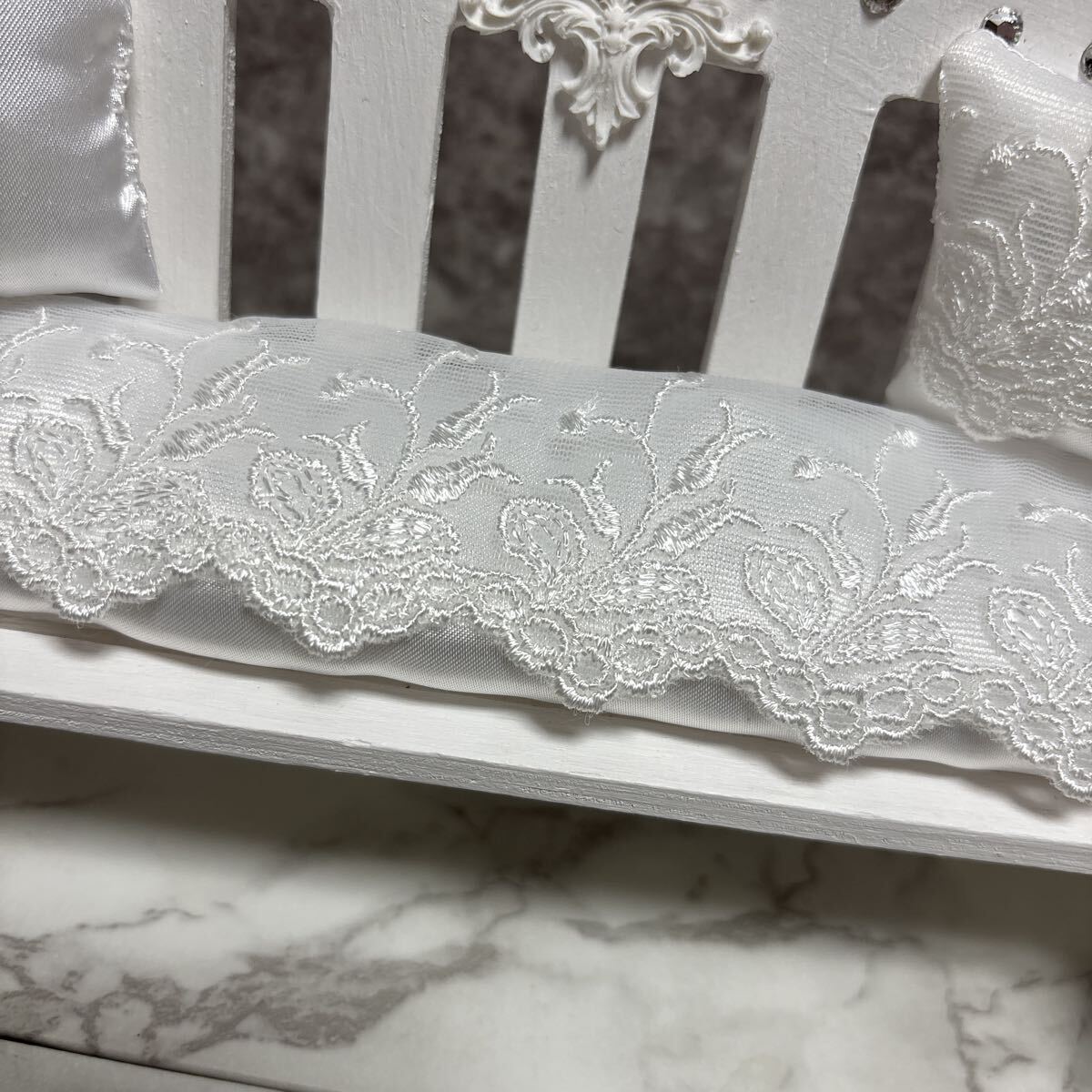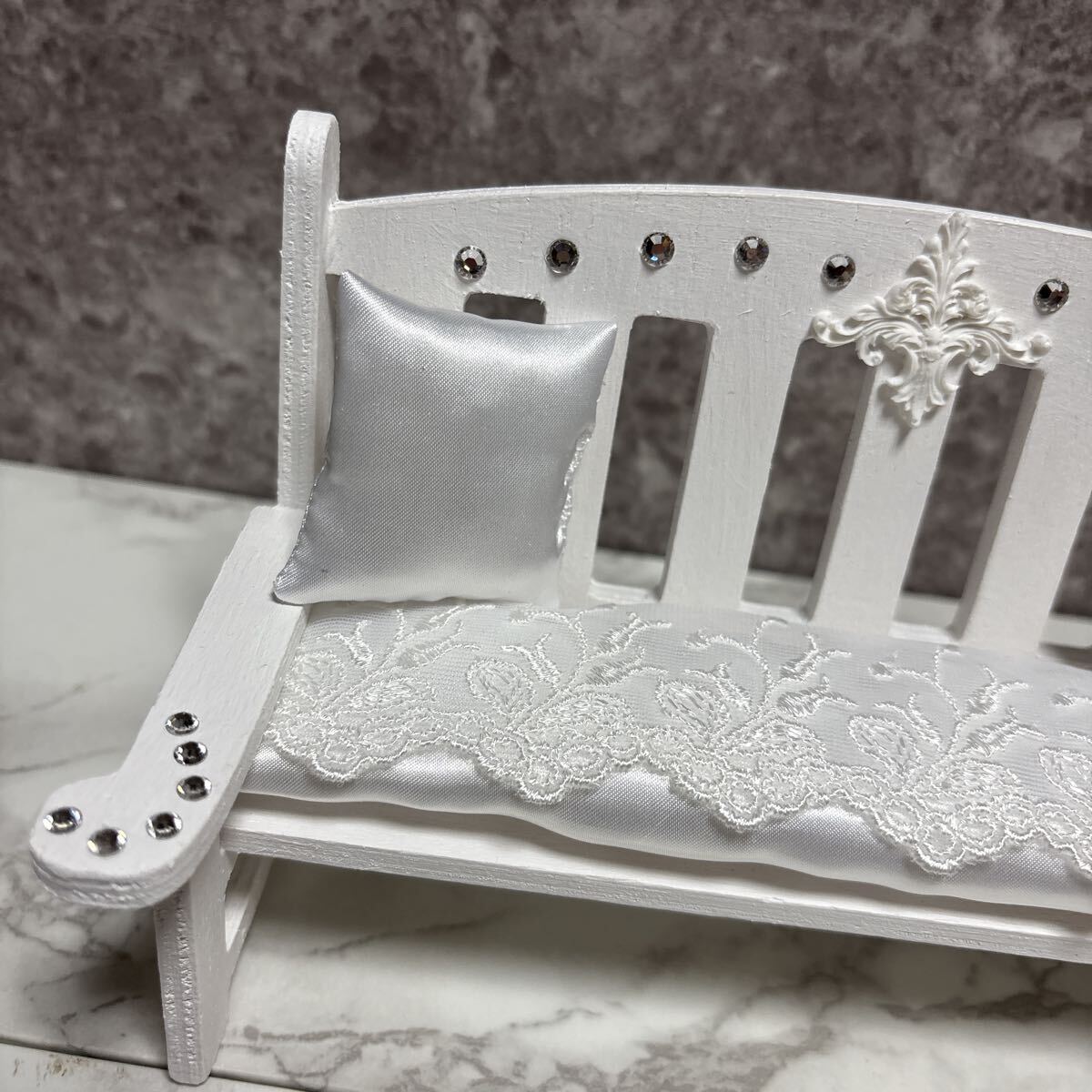ロココ調のモールとスワロフスキークリスタルを装飾し、クッションには光沢のあるサテン生地に豪華な