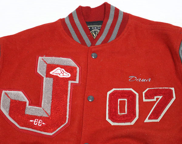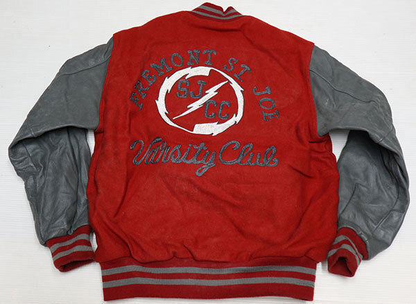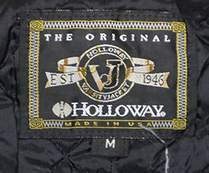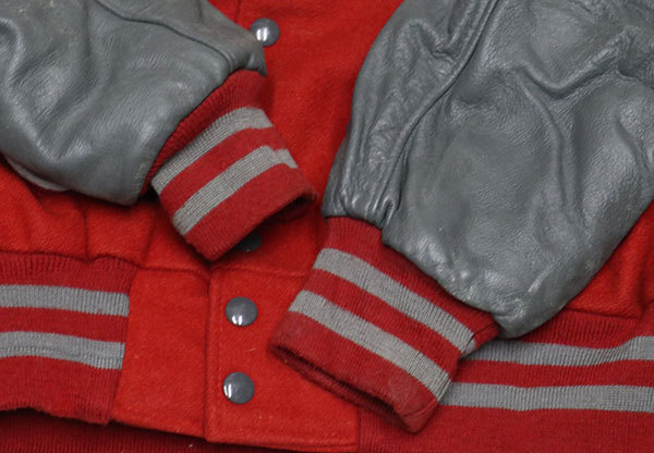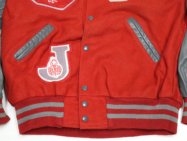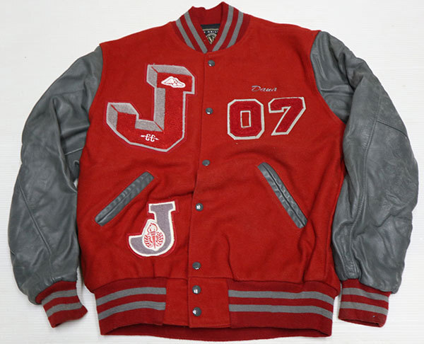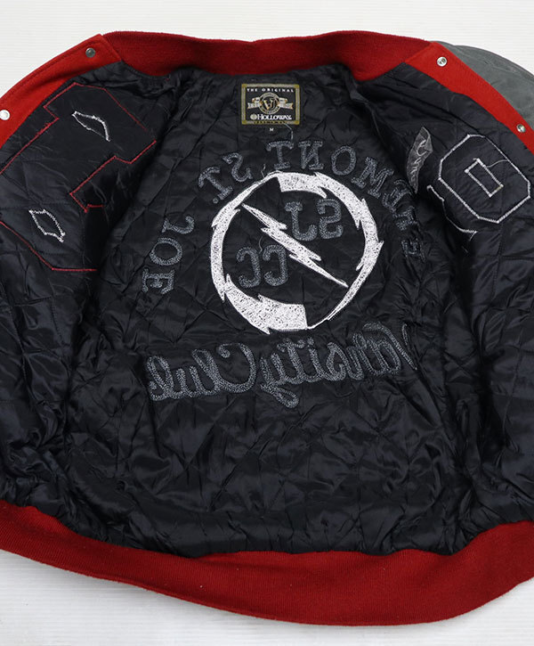 アメリカ買い付けのアメリカ製のHOLLOWAYの袖&ポケット縁レザーのスタジャンで赤系Xチャコールグレー系ラインの中綿入りです。